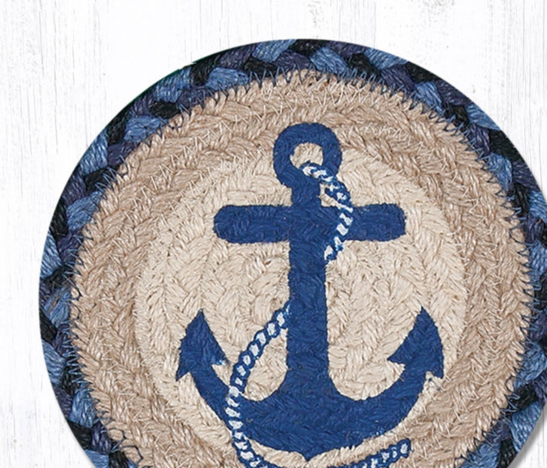 Large Round Coaster – Navy Anchor Design in Braided Jute, 7"x7" Nautical Coastal Table Accent