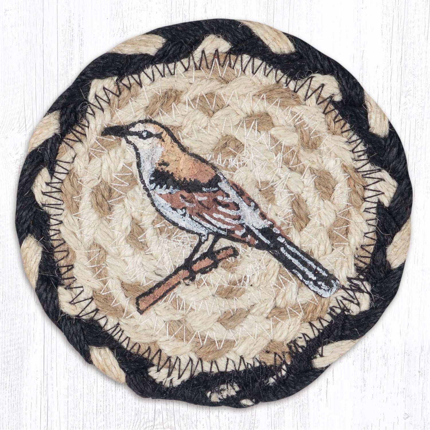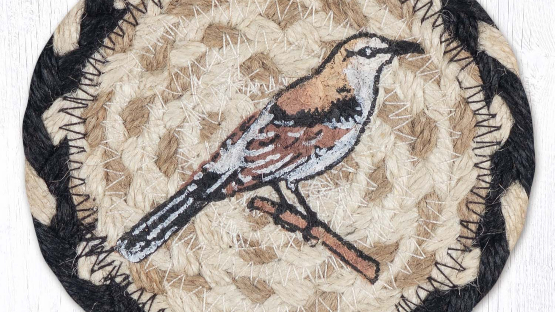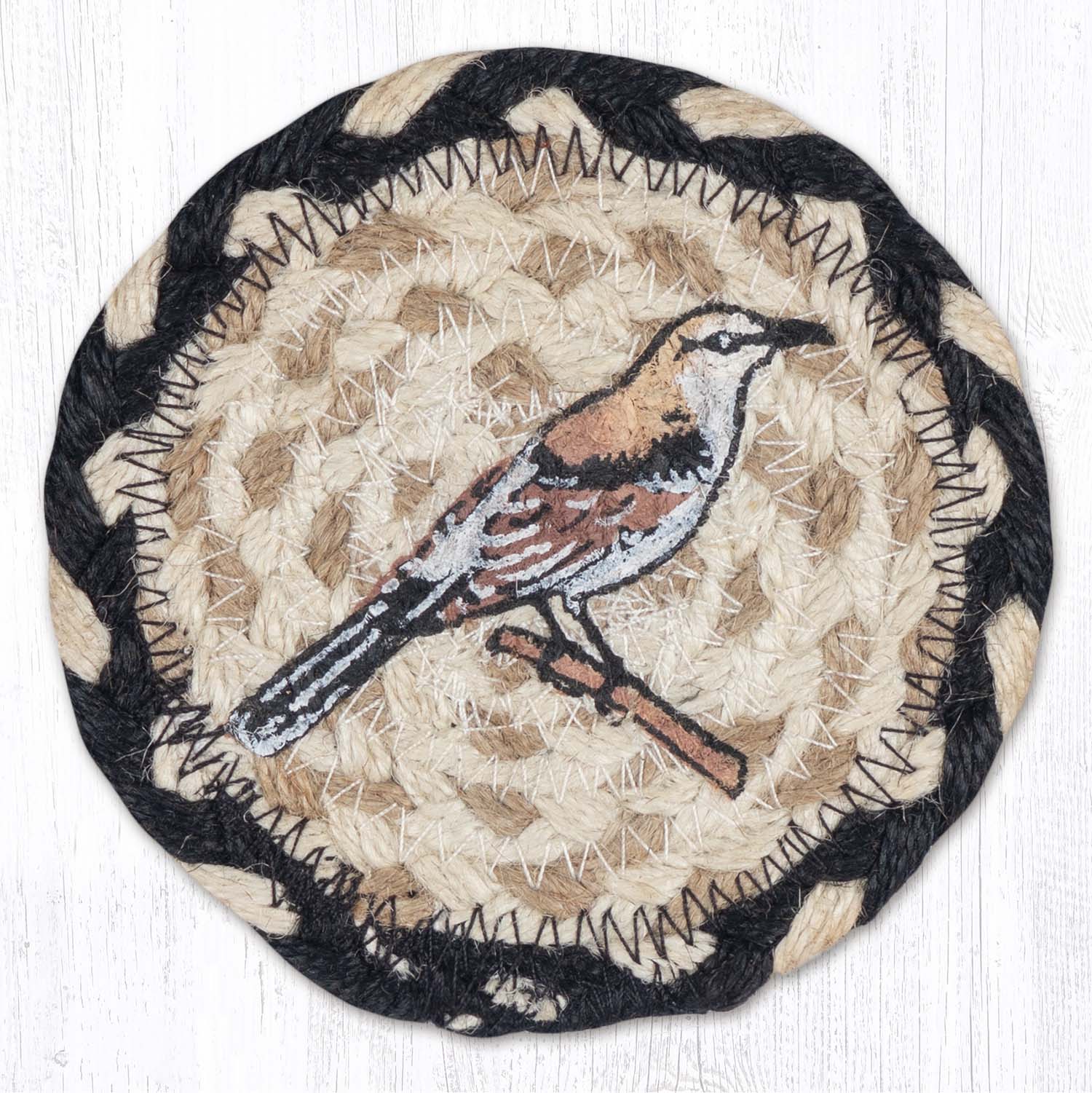 Grace your home with the delicate beauty of the Earth Rugs Mockingbird Printed Coaster, a 5"x5" square braided jute accent featuring a finely detailed mockingbird perched in a natural setting. Handcrafted from eco-friendly jute fibers, this piece combines rustic elegance with everyday functionality. The soft, earthy color palette and bird illustration make it a perfect fit for nature-themed, cottage, or rustic interiors. Whether used for your morning coffee or displayed as part of a seasonal tablescape, this coaster adds warmth and woodland charm to any room.