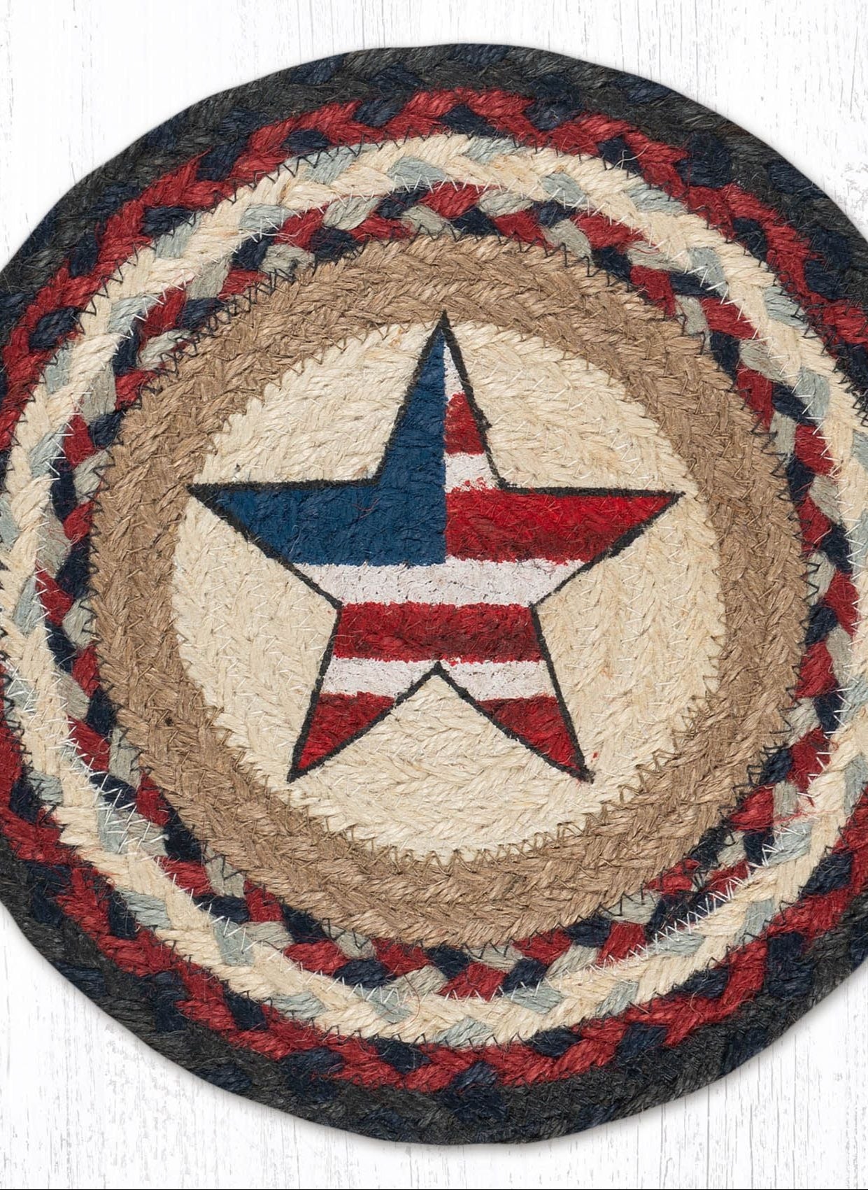 SKU - ER80-015ASAmericana Star Jute Trivet – 10"x10" Round Braided Hot Pad, Hand-Stenciled Red White Blue Patriotic Design
