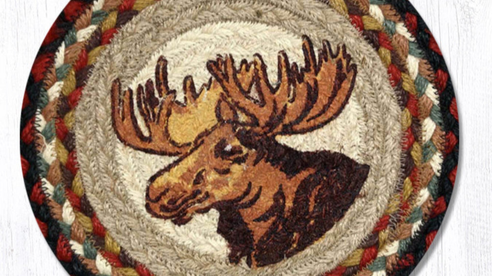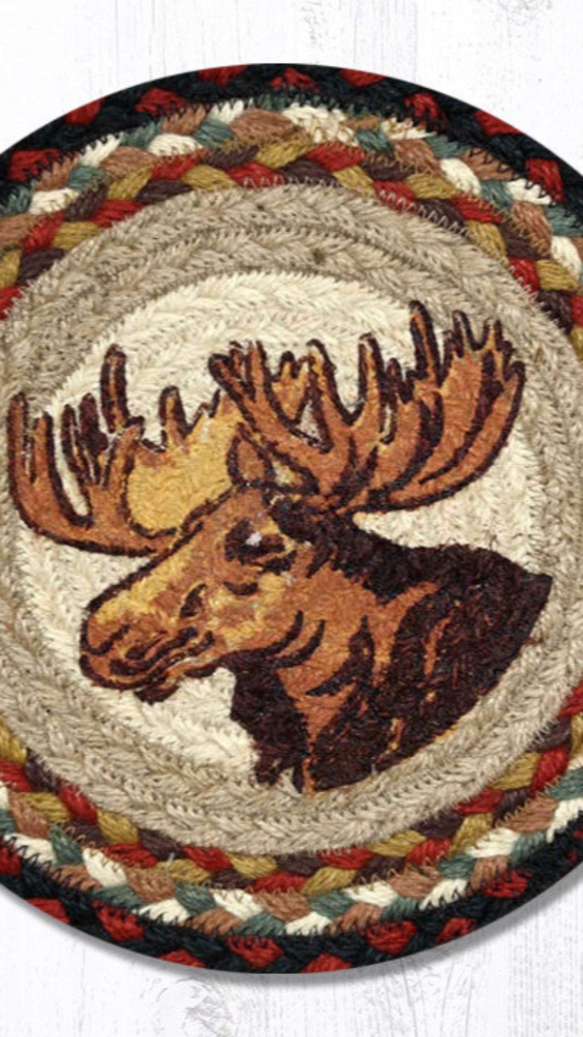10 inch round hot pad,Earth Rugs,Earth Rugs rustic trivet,Earth Rugs table accessory,eco-friendly hot pad,farmhouse moose décor,lodge cabin table protector,moose lodge cabin décor,moose portrait trivet,Placemat,rustic farmhouse kitchen trivet,rustic lodge hot pad,rustic moose kitchen trivet,rustic wildlife kitchen décor,Uber Living,Under $100,wildlife portrait accent,woodland cabin kitchen,woodland moose portrait