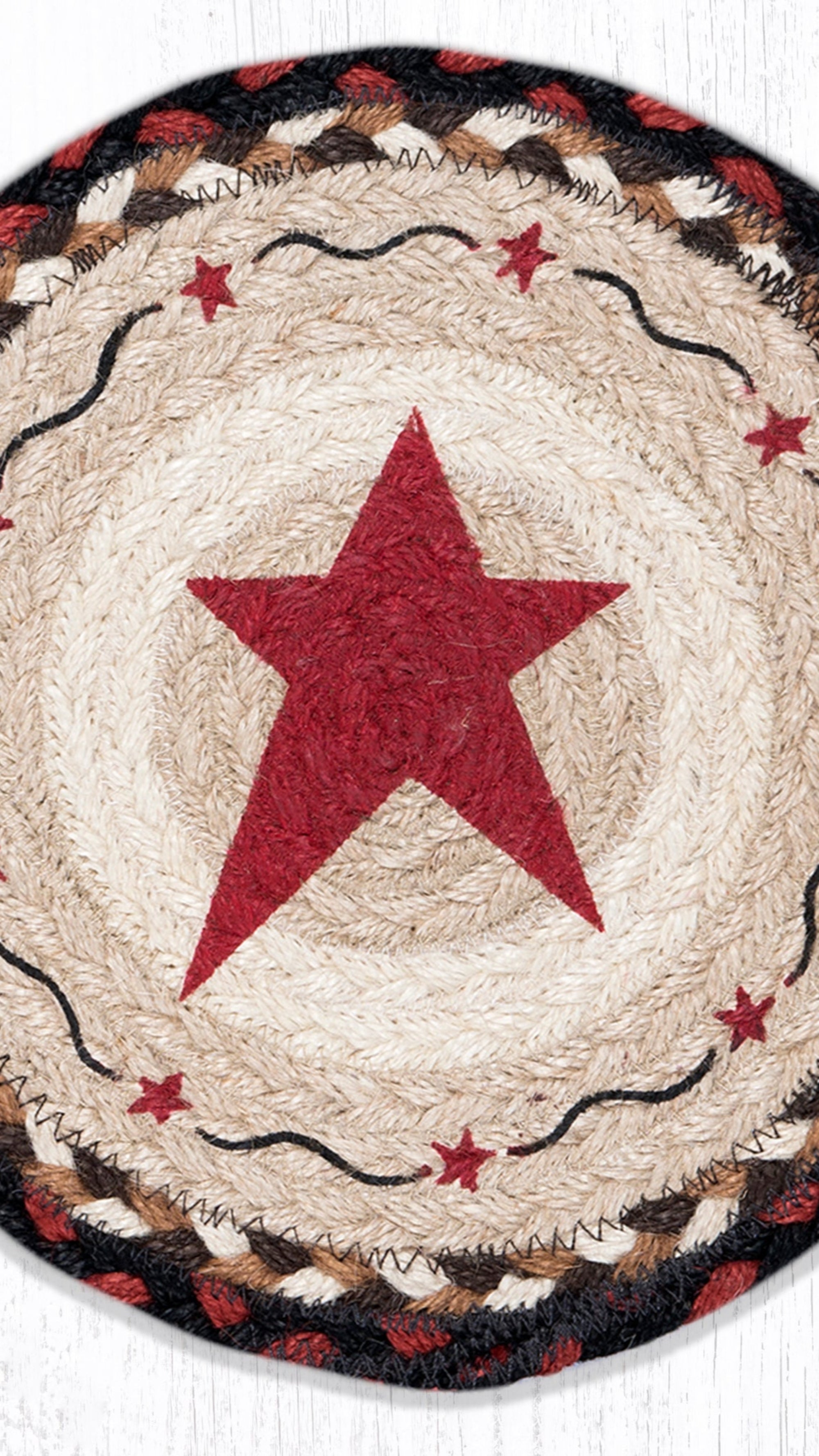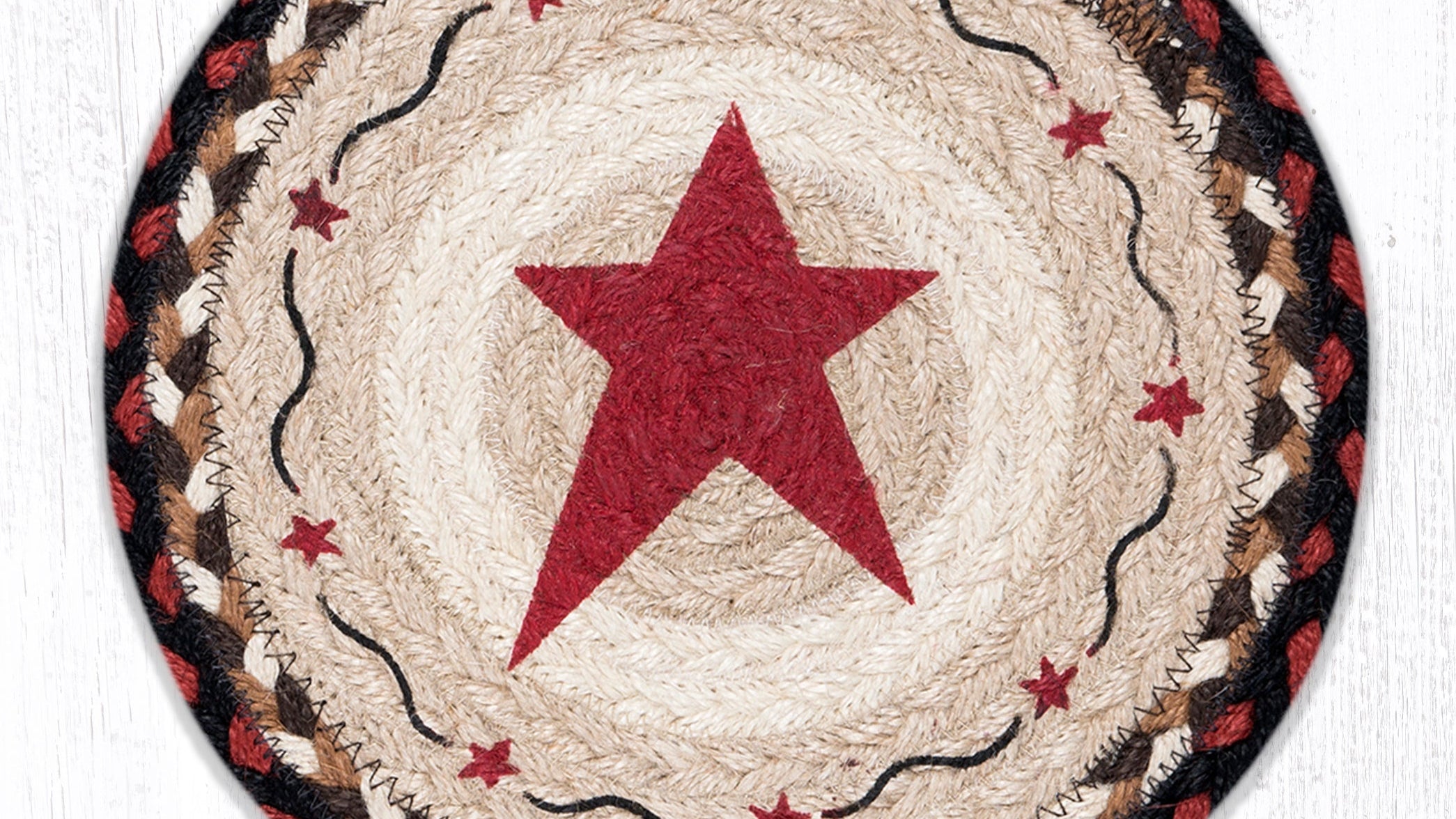 10 inch round burgundy trivet,Americana rustic table protector,burgundy Americana accent,burgundy star round trivet,Earth Rugs,Earth Rugs primitive décor,Earth Rugs rustic kitchen trivet,eco-friendly hot pad,farmhouse Americana kitchen,farmhouse country hot pad,farmhouse star printed trivet,Placemat,primitive country style décor,primitive star trivet,rustic burgundy hot pad,rustic country kitchen accessory,rustic primitive star décor,Uber Living,Under $100