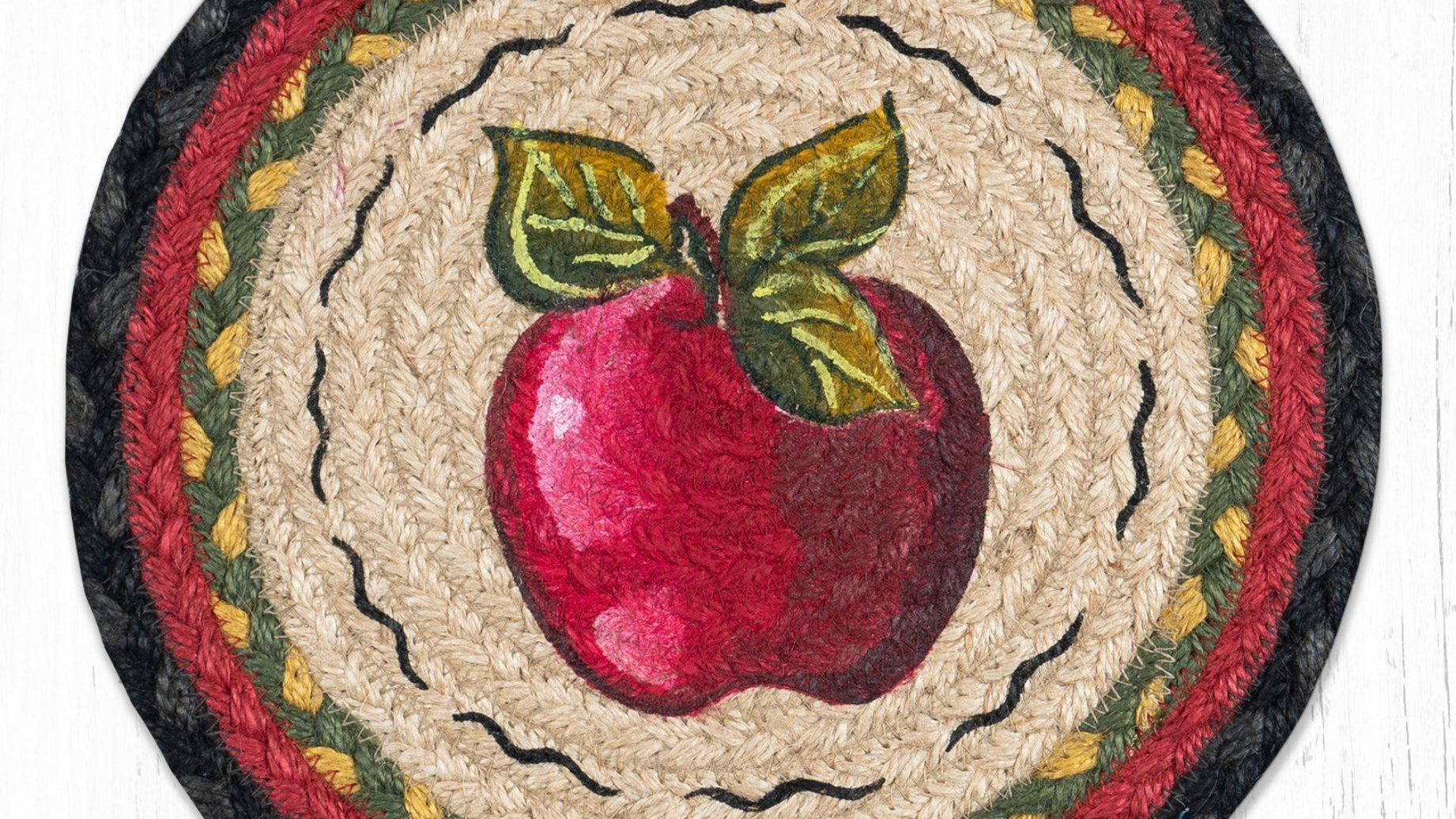 Bring a touch of rustic charm to your kitchen with the Earth Rugs Apple Printed Round Trivet. Measuring 10 inches in diameter, this handcrafted accent features a detailed apple print set against a natural braided jute base, blending seamlessly into farmhouse, country, or cottage-inspired decor. Its sturdy 100% jute construction offers heat resistance, making it perfect for protecting your tabletops from hot dishes, teapots, or baking pans. The round silhouette and vibrant apple motif evoke a cozy, harvest-inspired ambiance, whether displayed flat on the table or layered beneath serveware during gatherings.