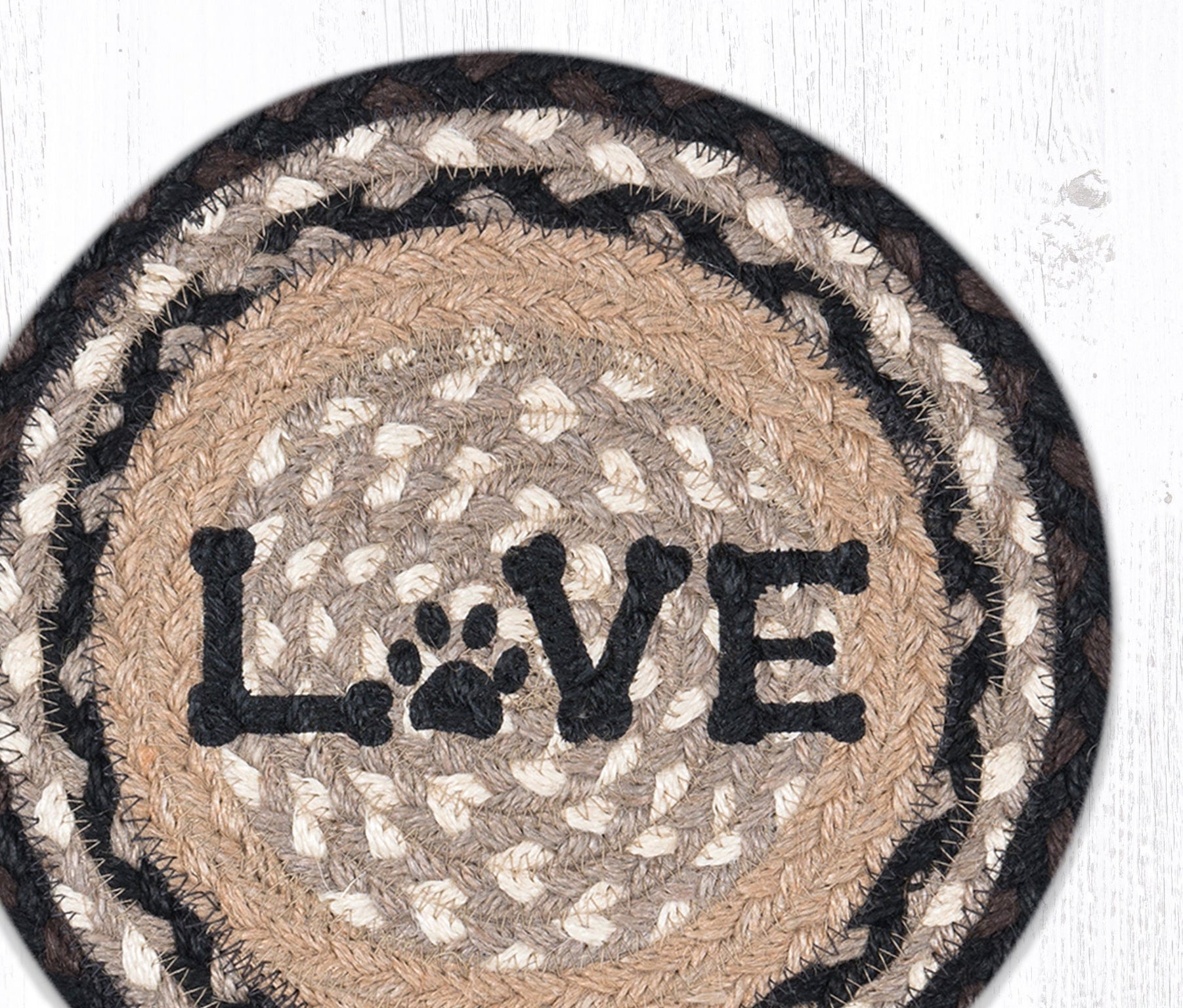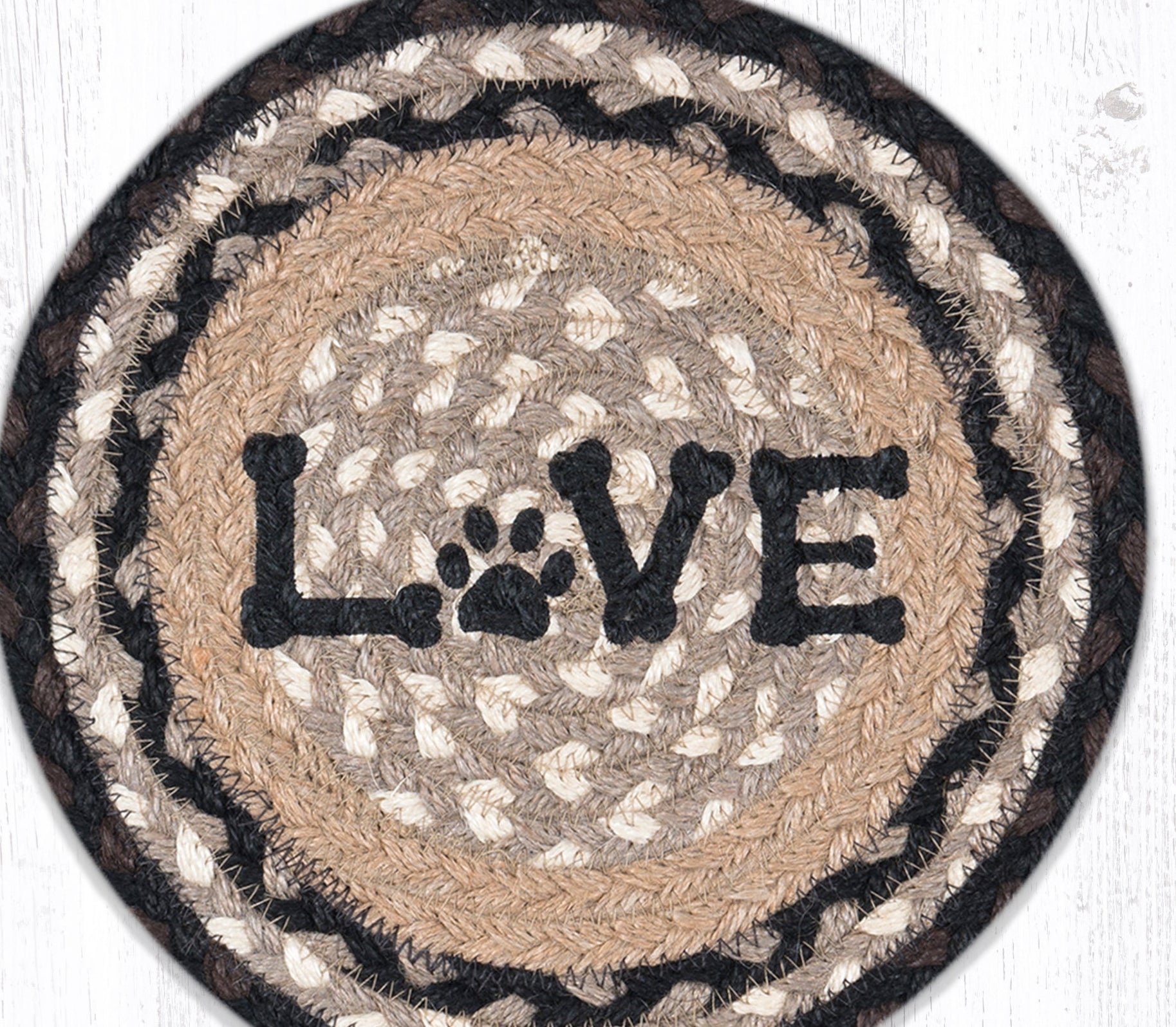 Bring charm and warmth to your kitchen or pet space with the Earth Rugs LOVE Pet Printed Round Trivet. Featuring a bold and endearing "LOVE" design—complete with a paw print replacing the letter "O"—this 10-inch braided jute trivet is perfect for animal lovers. Crafted from 100% natural, eco-friendly jute, it serves as both a heat-resistant mat and a decorative statement. Its hand-printed artwork and natural texture make it a heartfelt addition to farmhouse, rustic, and pet-centric spaces.