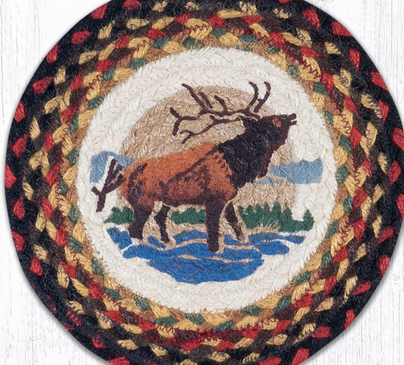 Earth Rugs Winter Elk Printed Round Trivet – 10"x10" Braided Jute Hot Pad