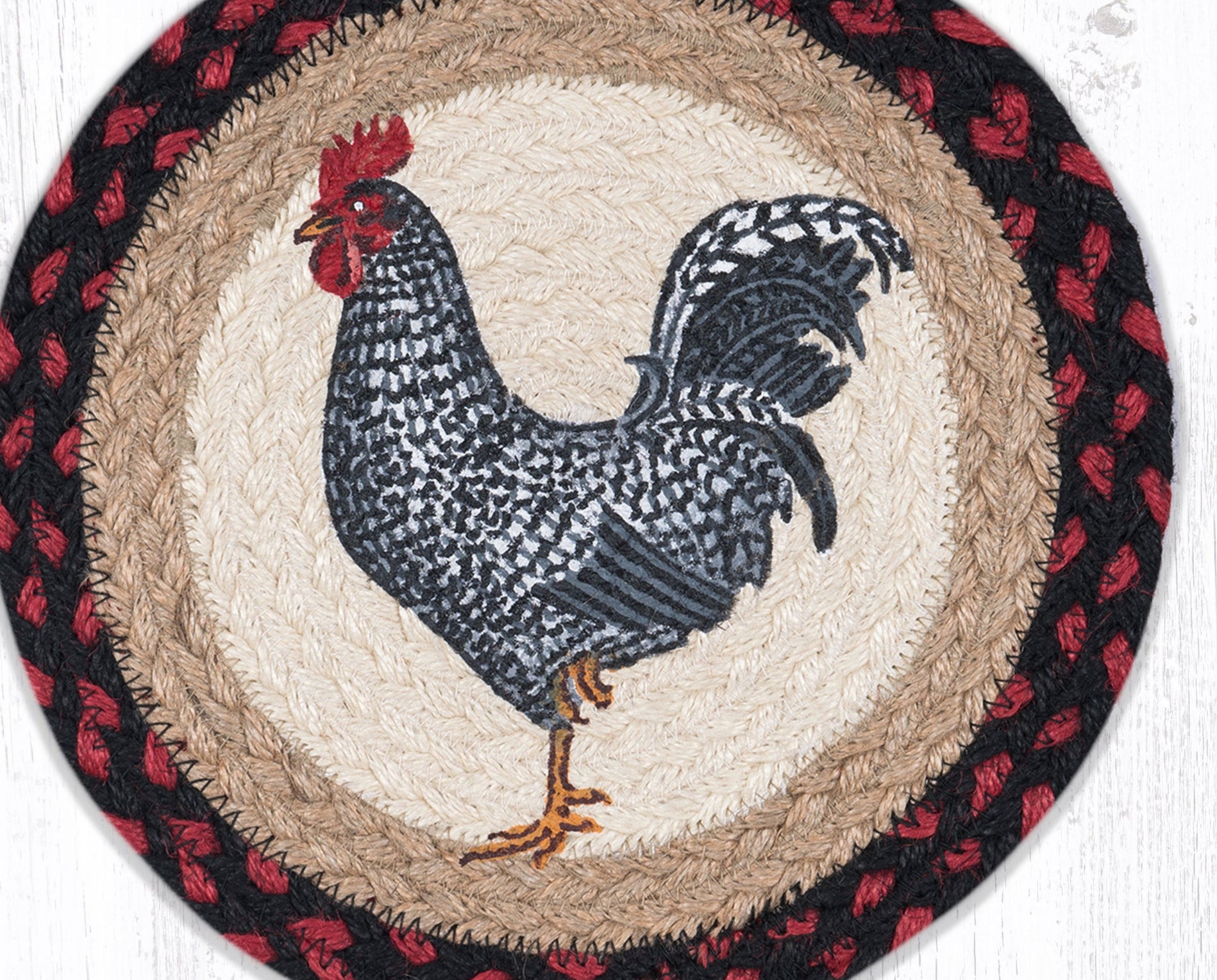SKU - ER80-602BWRBlack & White Rooster Printed Round Trivet – 10"x10" Braided Jute Hot Pad, Farmhouse Country Kitchen Accent