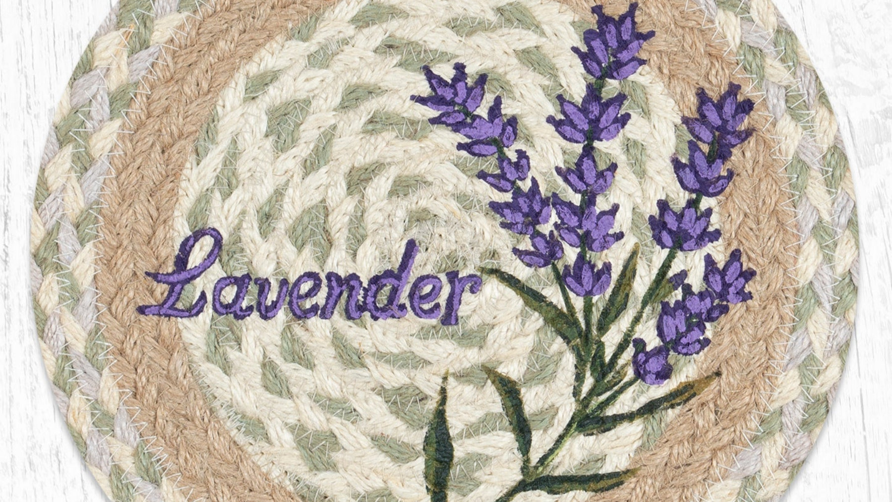 SKU - ER80-611LRound Trivet – 10"x10" Lavender Printed Braided Jute Mat with Floral Botanical Design in Soft Country Colors