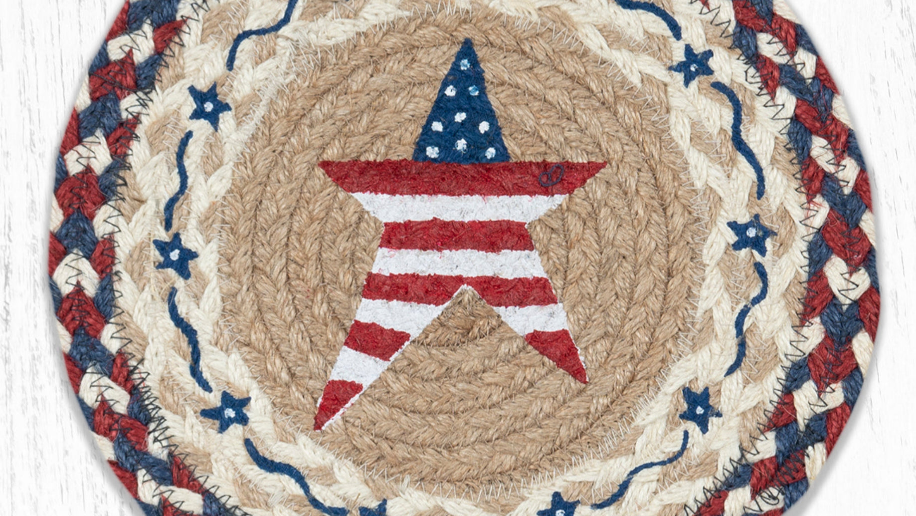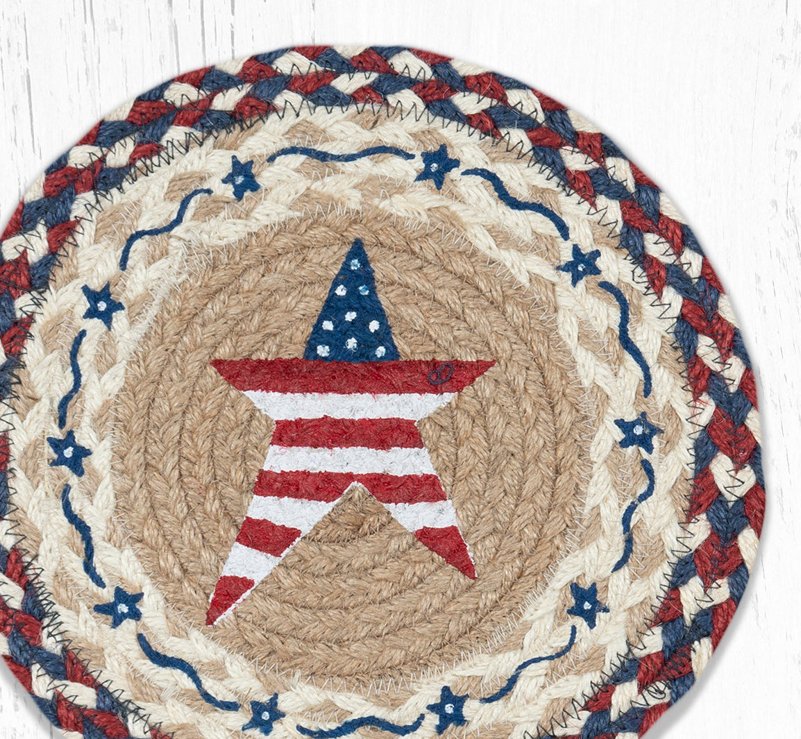SKU - ER80-618PASRound Trivet – 10"x10" Primitive American Star Printed Braided Jute Mat in Patriotic Country Folk Style