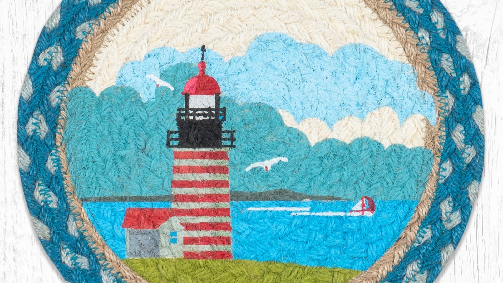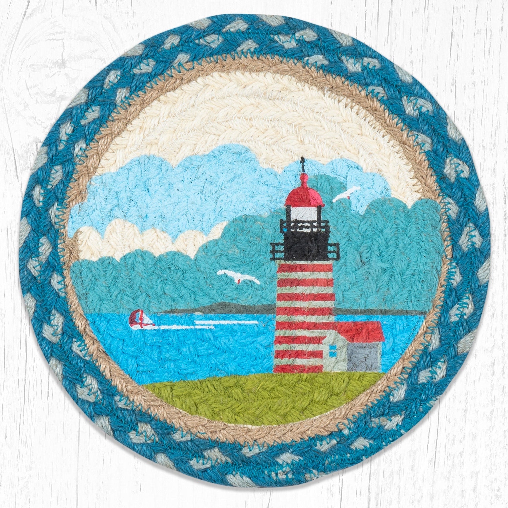 Earth Rugs Round Trivet – 10"x10" Quoddy Lighthouse Printed Braided Jute Mat in Nautical Coastal New England Style