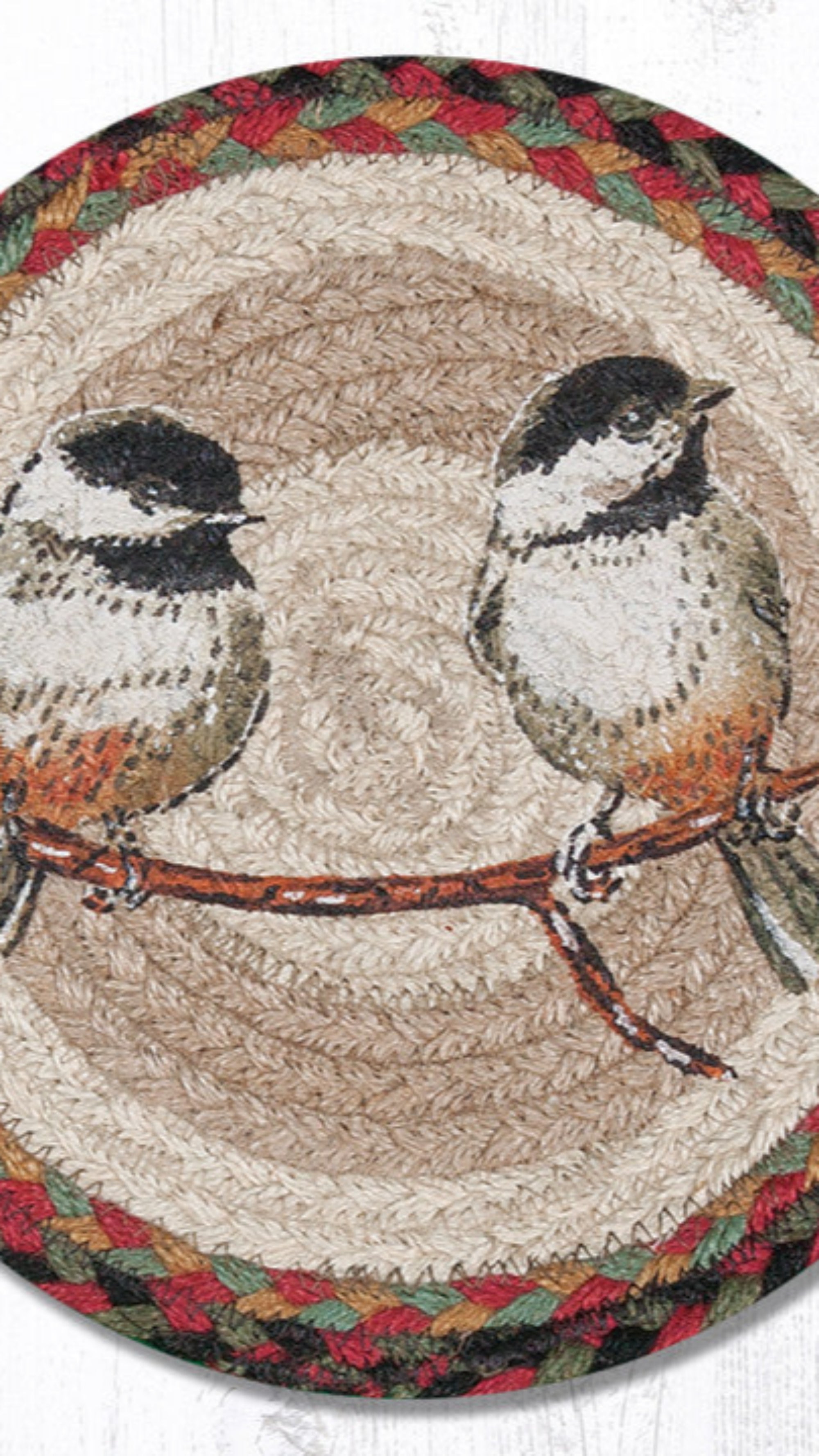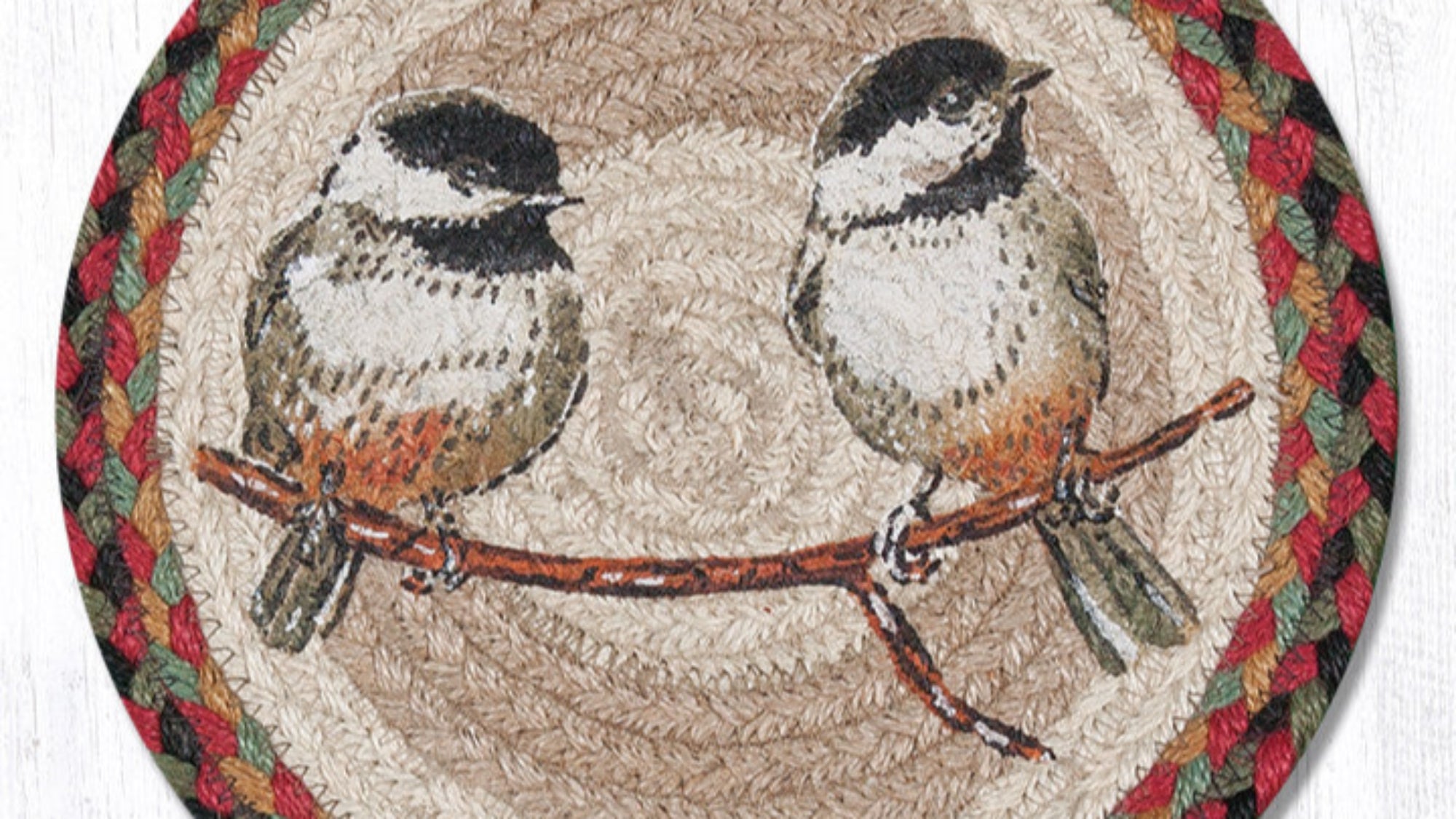 10 inch round wildlife trivet,cabin dining accent,Chickadee trivet,cozy cabin table protector,Earth Rugs,Earth Rugs kitchen trivet,Earth Rugs rustic décor,eco-friendly kitchen hot pad,farmhouse lodge kitchen,farmhouse round hot pad,handcrafted wildlife trivet,lodge kitchen accessory,Placemat,rustic cabin hot pad,rustic cabin kitchen décor,rustic farmhouse kitchen accent,Uber Living,Under $100