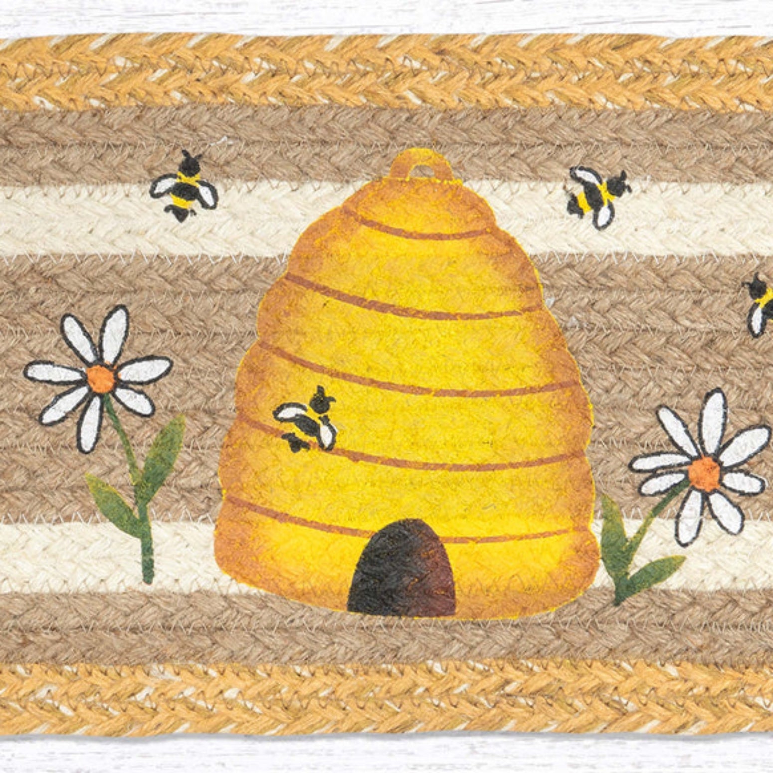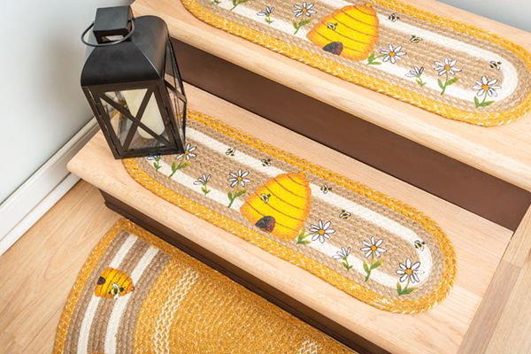 Infuse your staircase with charm and character using the Beehive Oval Stair Tread Rug, a nature-inspired accent featuring a hand-stenciled bee and hive motif designed by artist Suzanne Pienta. Crafted from eco-friendly braided jute, each tread measures 27 inches long by 8.25 inches wide, fitting most indoor staircases. The warm, earthy tones and hand-rendered detail bring an artisan touch to rustic, cottage, or farmhouse décor. Perfect for high-traffic areas, the low-profile oval shape adds grip and reduces wear, while visually softening hard surfaces with a touch of organic elegance.