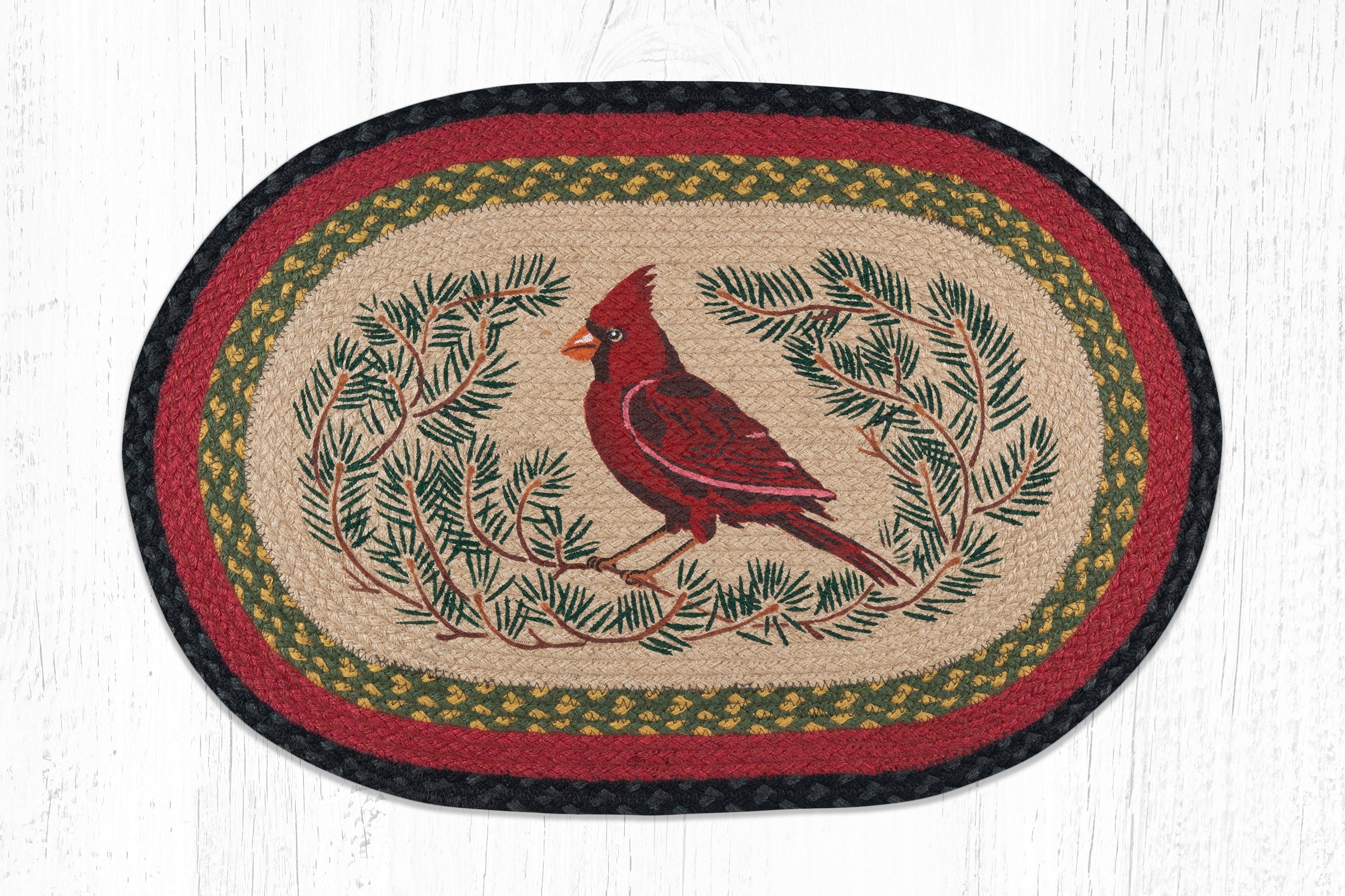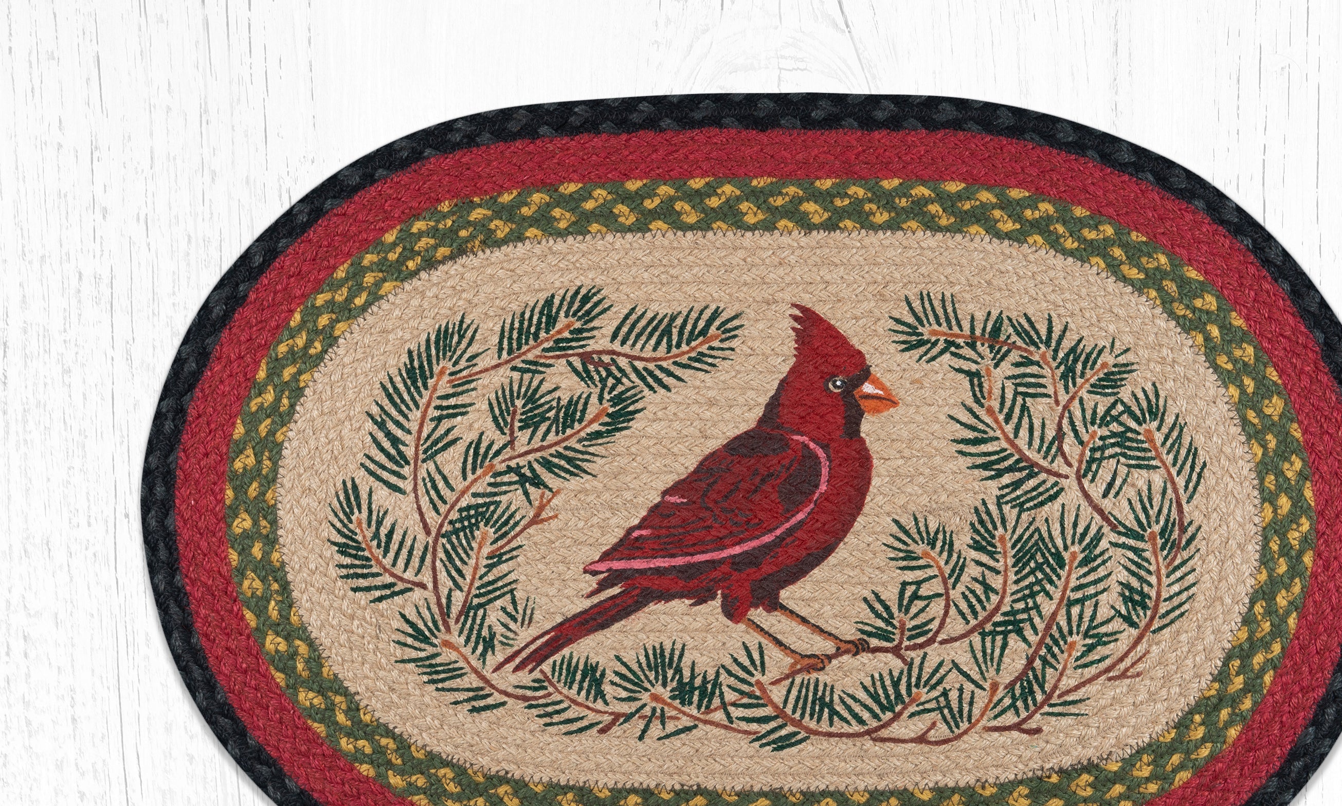 Bring a touch of natural beauty indoors with the Earth Rugs Cardinal Oval Patch Tread, a 20"x30" hand-painted braided jute rug featuring a vibrant red cardinal perched among autumn foliage. This oval patch design combines eco-friendly craftsmanship with rustic farmhouse style, showcasing detailed artistry and warm fall colors. Crafted from durable natural jute, this rug offers versatility for entryways, kitchens, or wall decor. Its braided texture and vivid design create a welcoming ambiance and an inviting seasonal focal point for your home.