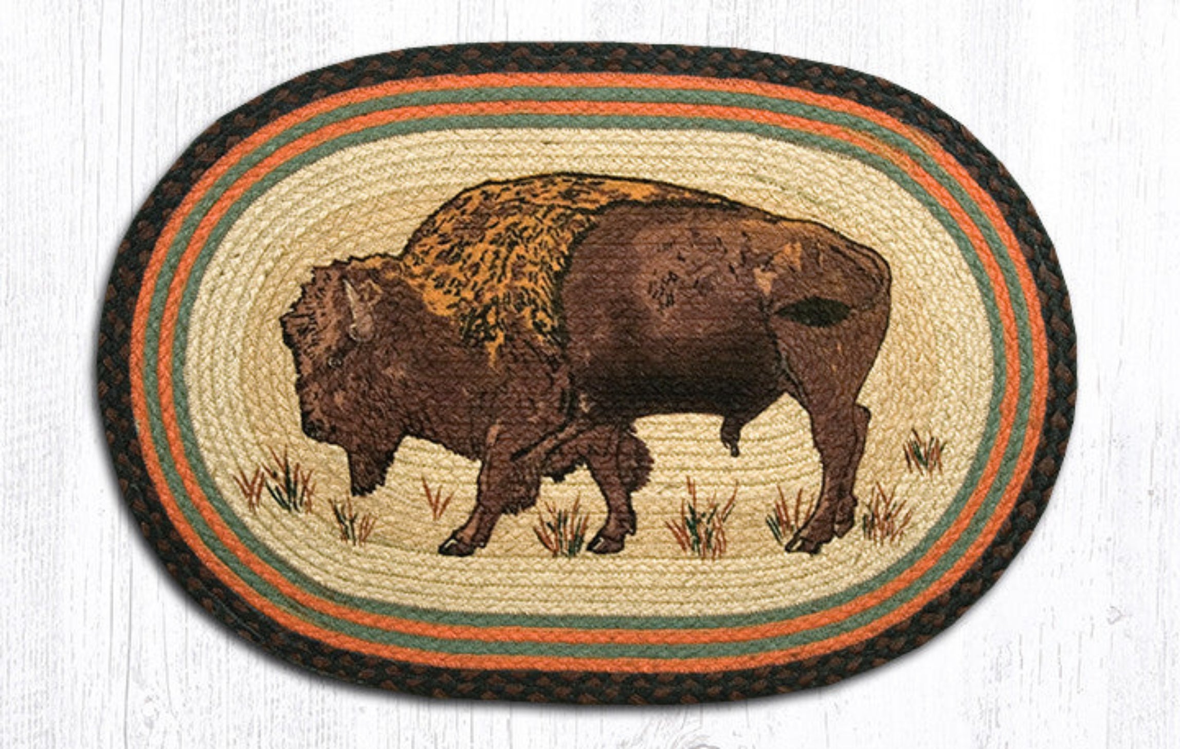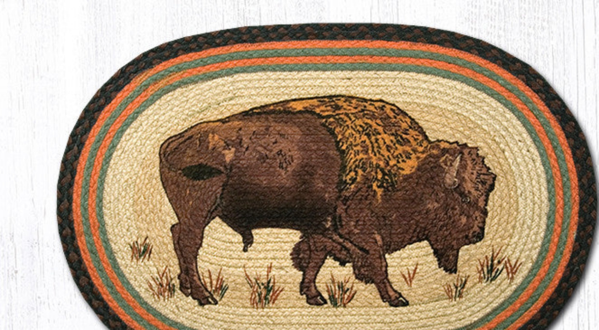Add a touch of rustic charm to your home with the Earth Rugs Buffalo Oval Patch, a 20"x30" hand-painted braided jute rug featuring a majestic buffalo design. This eco-friendly oval patch combines durable natural fibers with artistic craftsmanship, creating a warm, inviting accent perfect for farmhouse, rustic, or western-themed décor. The braided jute texture adds natural depth and durability, making it an ideal piece for entryways, living rooms, or wall decor. Its earthy tones and classic buffalo imagery evoke the spirit of the outdoors and traditional Americana style.