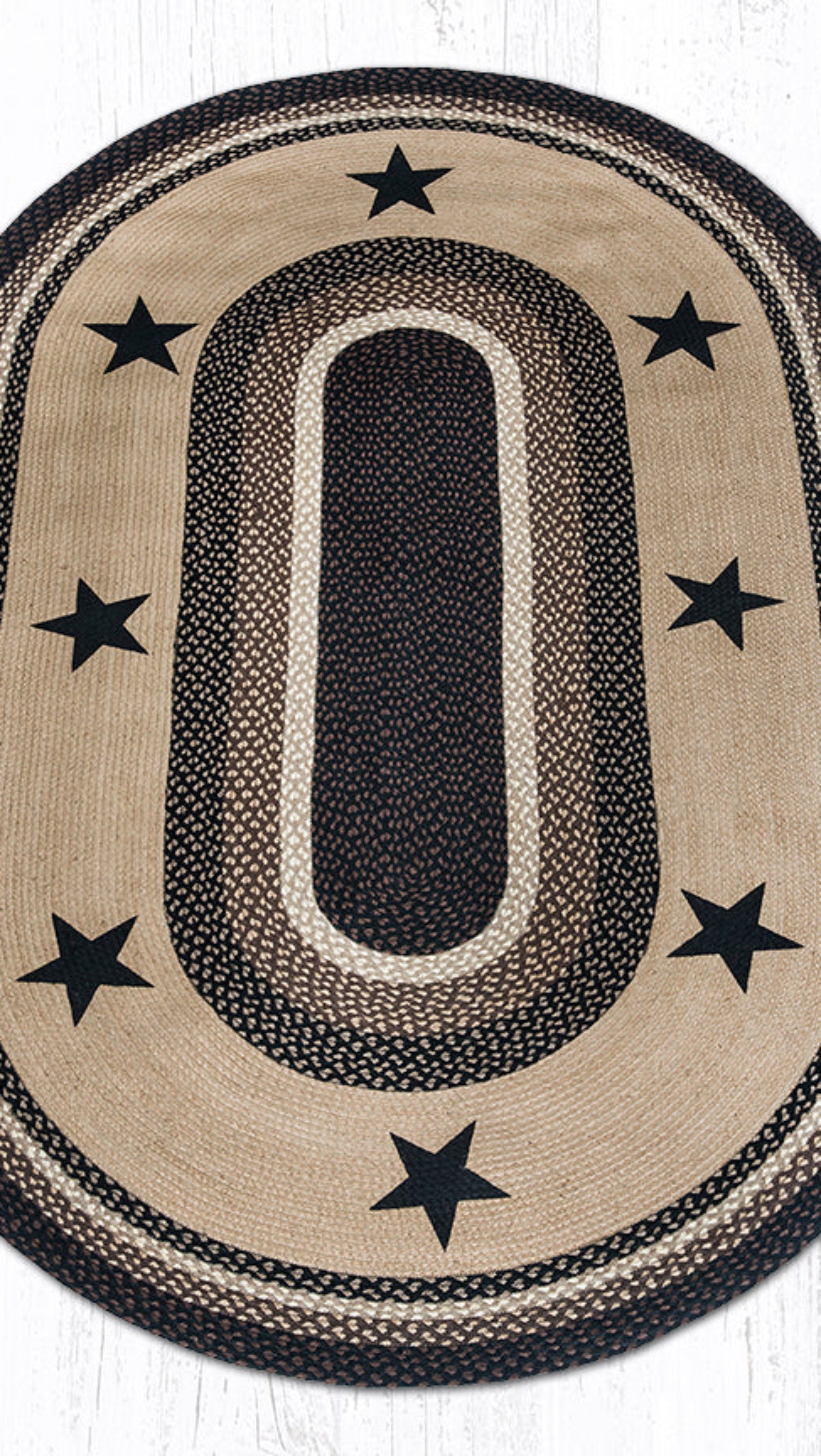 $100 – $200,5x8 oval area rug,Americana primitive rug,cabin lodge accent rug,Earth Rugs,Earth Rugs black stars,eco-friendly jute oval rug,farmhouse oval braided rug,hand-braided rustic rug,large oval braided rug,lodge cabin braided rug,natural fiber braided rug,oval braided floor rug,primitive oval patch rug,rustic black stars rug,rustic country home rug,rustic farmhouse décor rug,Uber Living
