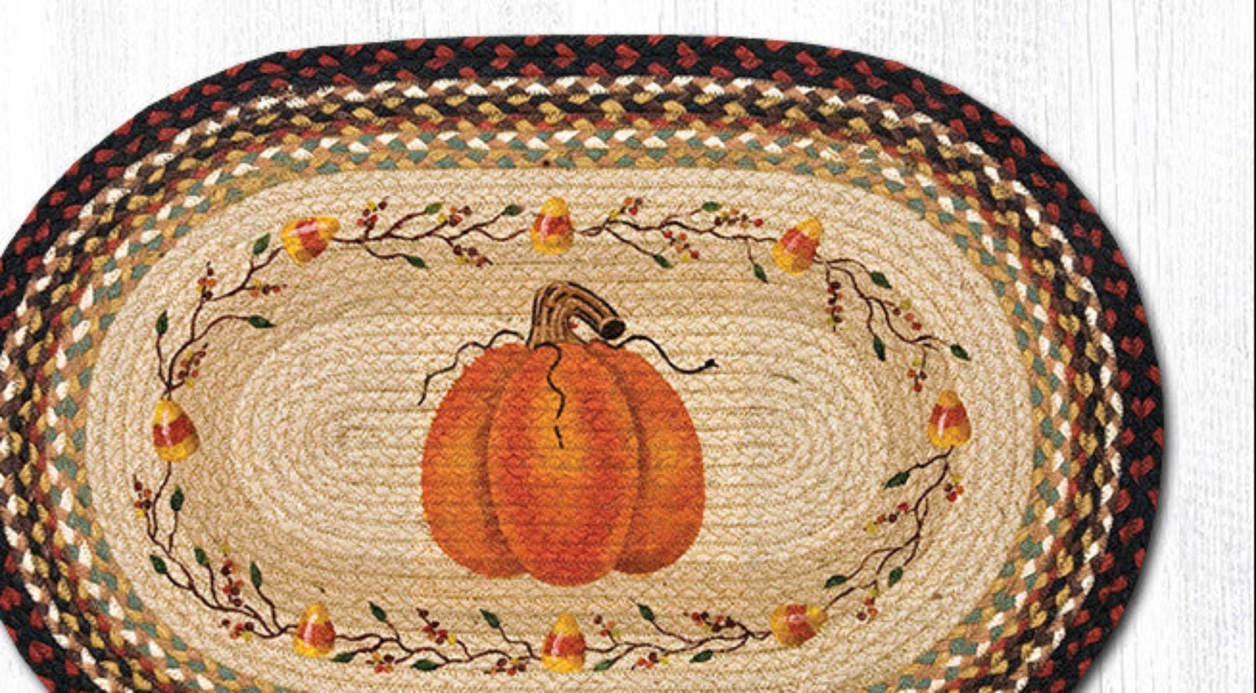SKU - ER65-319PCCPumpkin Candy Corn Oval Rug – 20"x30" Hand-Braided Jute Mat with Fall Harvest and Halloween Design