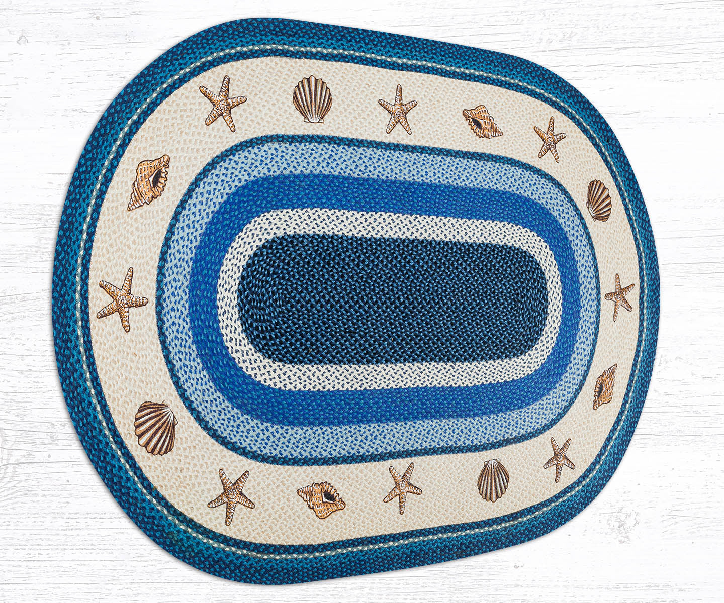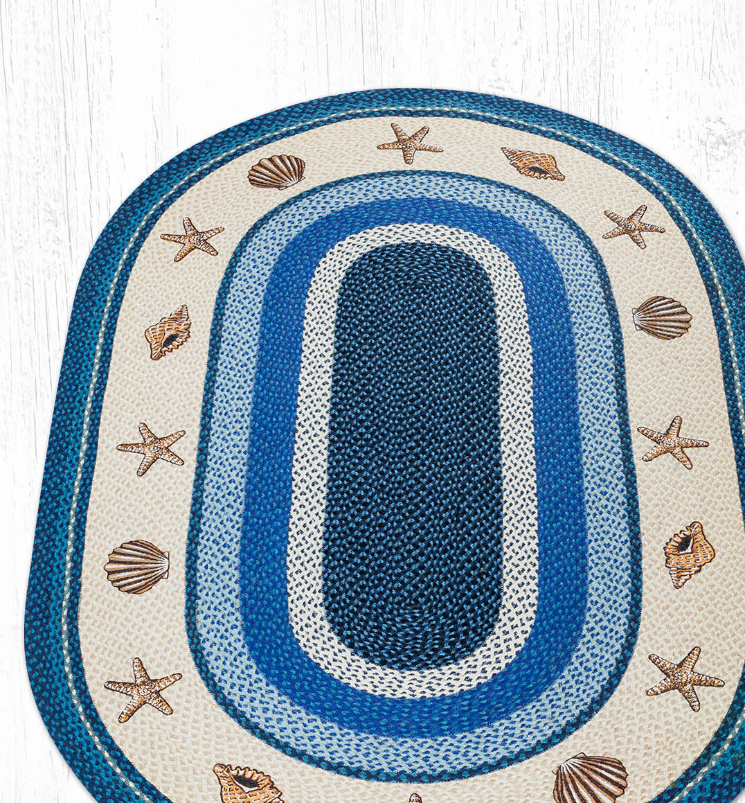 Bring a coastal breeze to your interior with the Earth Rugs Shells Oval Patch Tread Rug. This 5-foot by 8-foot area rug features delicate hand-stenciled seashell designs in calming hues, woven into a durable braided jute base. Its natural texture and oval shape make it ideal for enhancing beach houses, coastal cottages, or any space inspired by the sea. Crafted from 100% eco-friendly jute, this rug is both sustainable and stylish, offering functional floor protection and a soft nautical touch underfoot.