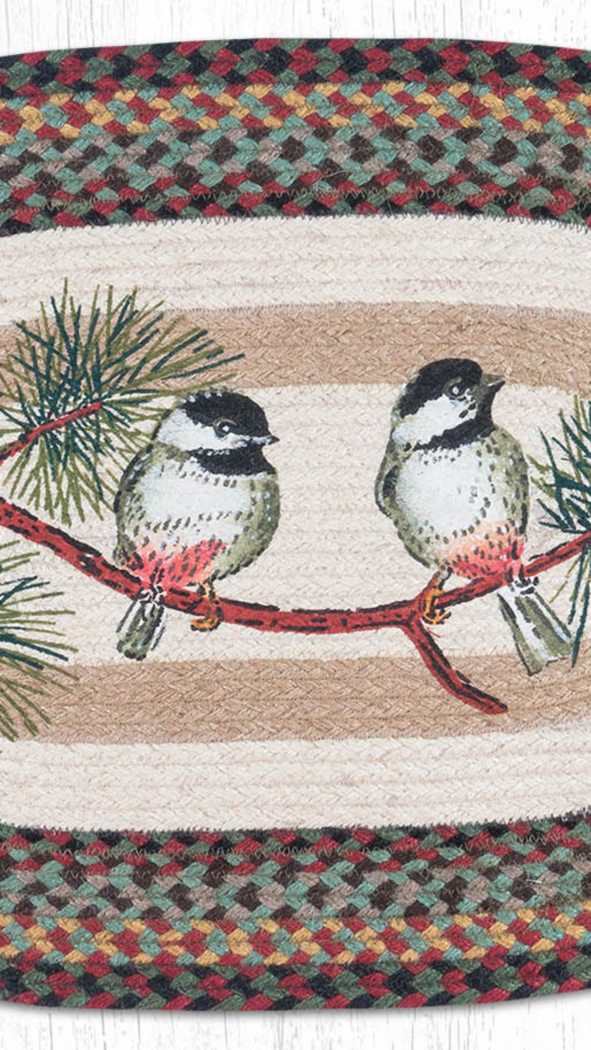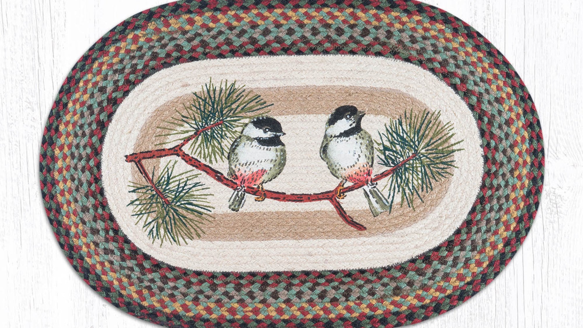 braided patch oval rug,chickadee oval rug,country farmhouse bird rug,Earth Rugs,Earth Rugs patch rug,eco-friendly rustic rug,farmhouse country oval rug,handcrafted jute oval rug,lodge cabin rustic decor rug,oval braided jute rug,oval chickadee rug 20x30,Placemat,rustic cabin accent rug,rustic entryway accent rug,rustic farmhouse rug,rustic lodge oval rug,Under $100,woodland bird oval rug
