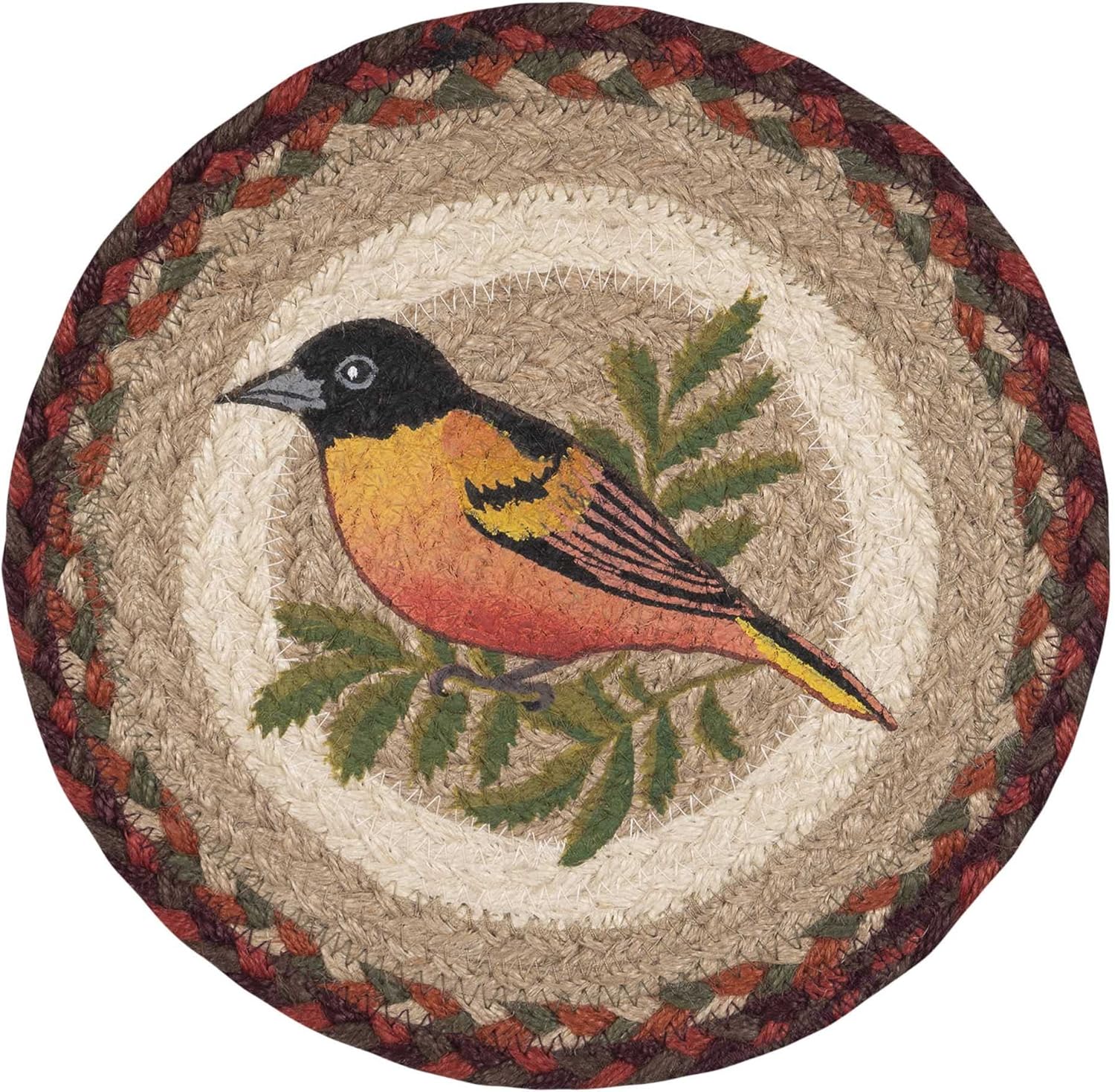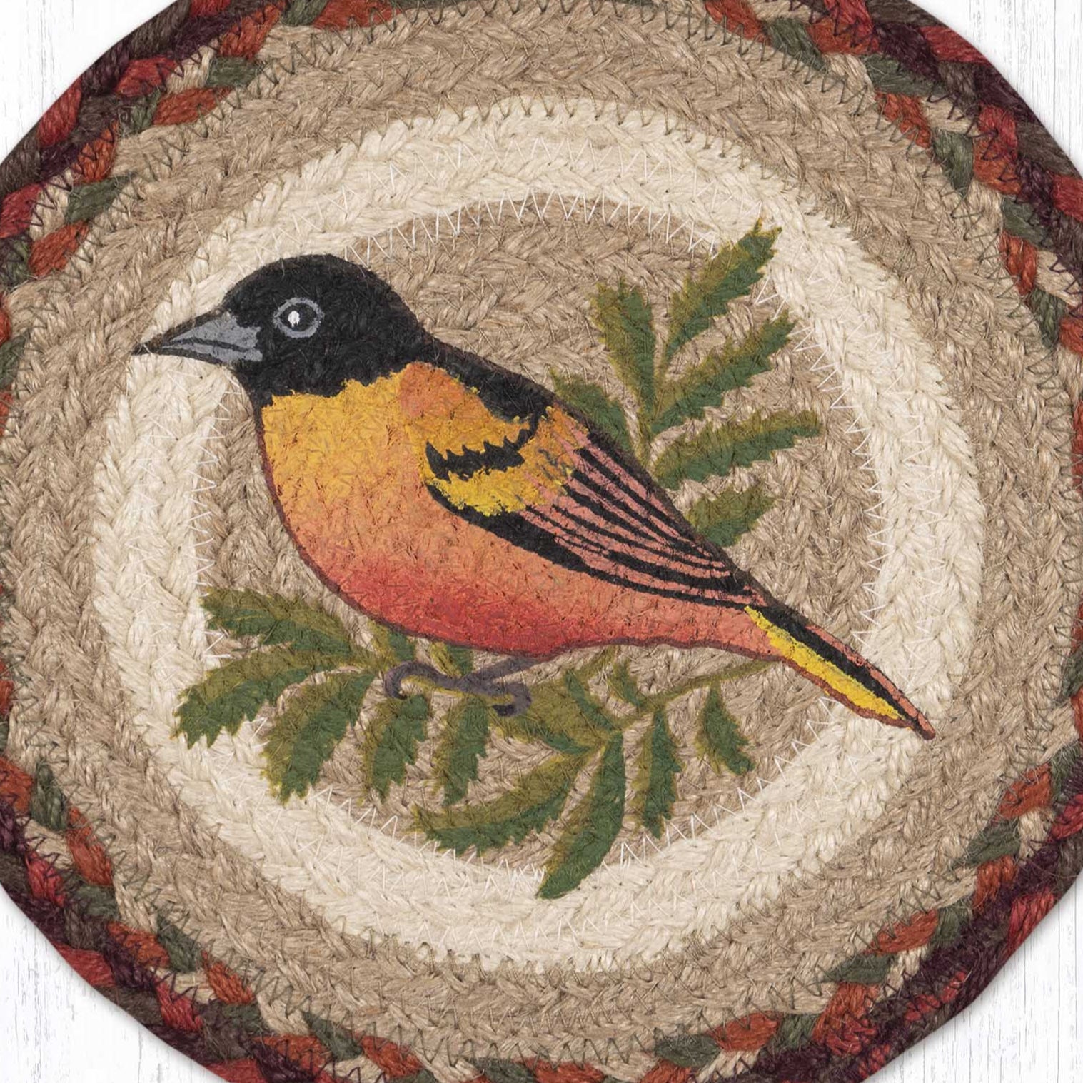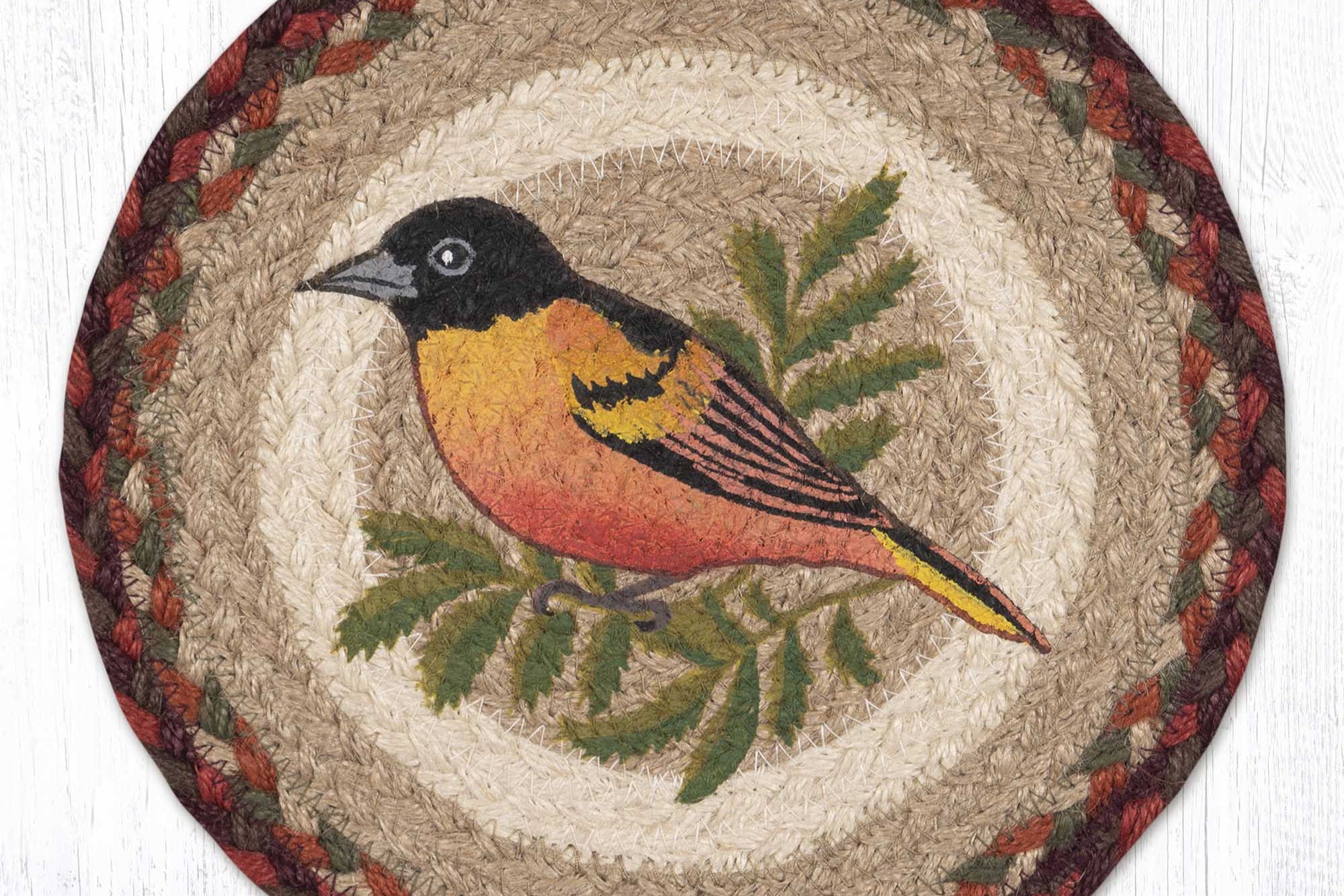 Earth Rugs Oriole Bird Round Trivet – 10" Braided Jute Hot Pad with Bright Songbird Print