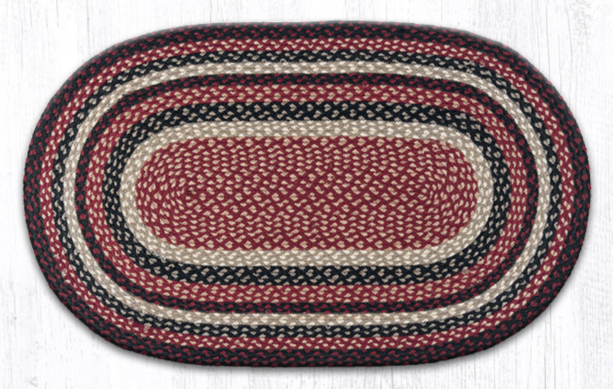 Add timeless farmhouse style to your home with the Earth Rugs Burgundy, Black & Tan Oval Braided Rug. Handwoven from 100% natural jute, this rug blends eco-friendly durability with rustic beauty. Its warm tones of burgundy, black, and tan make it a versatile piece for any country or farmhouse-inspired interior.