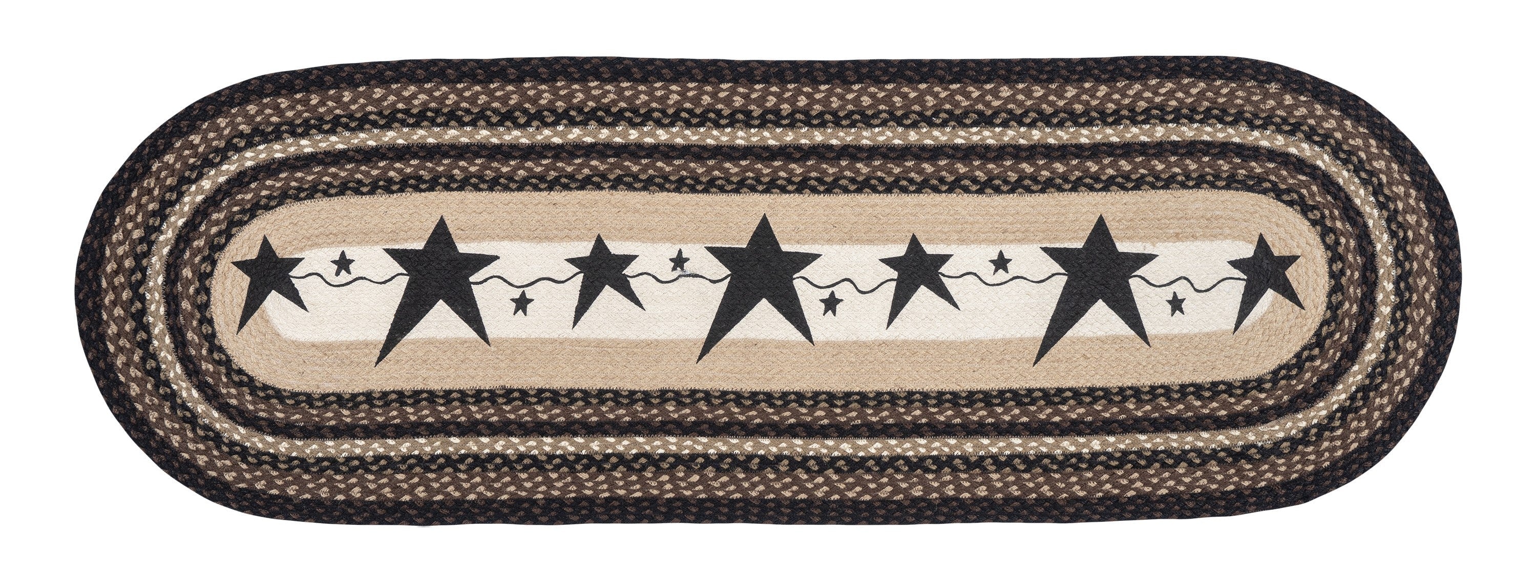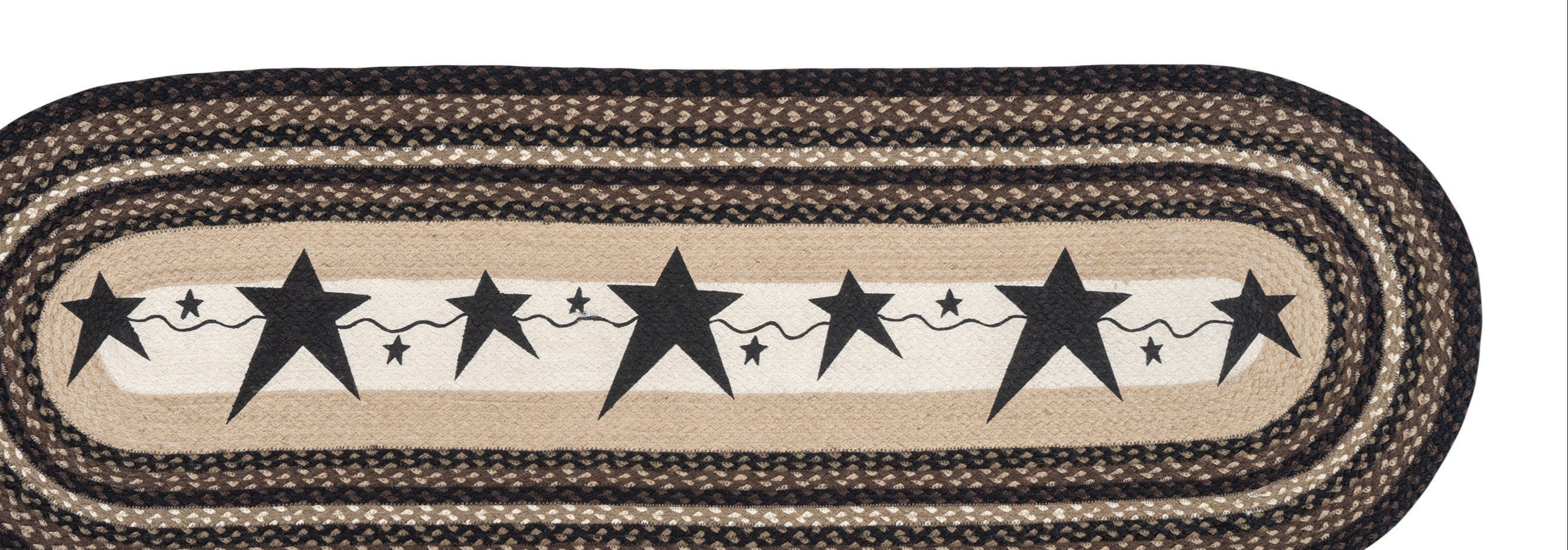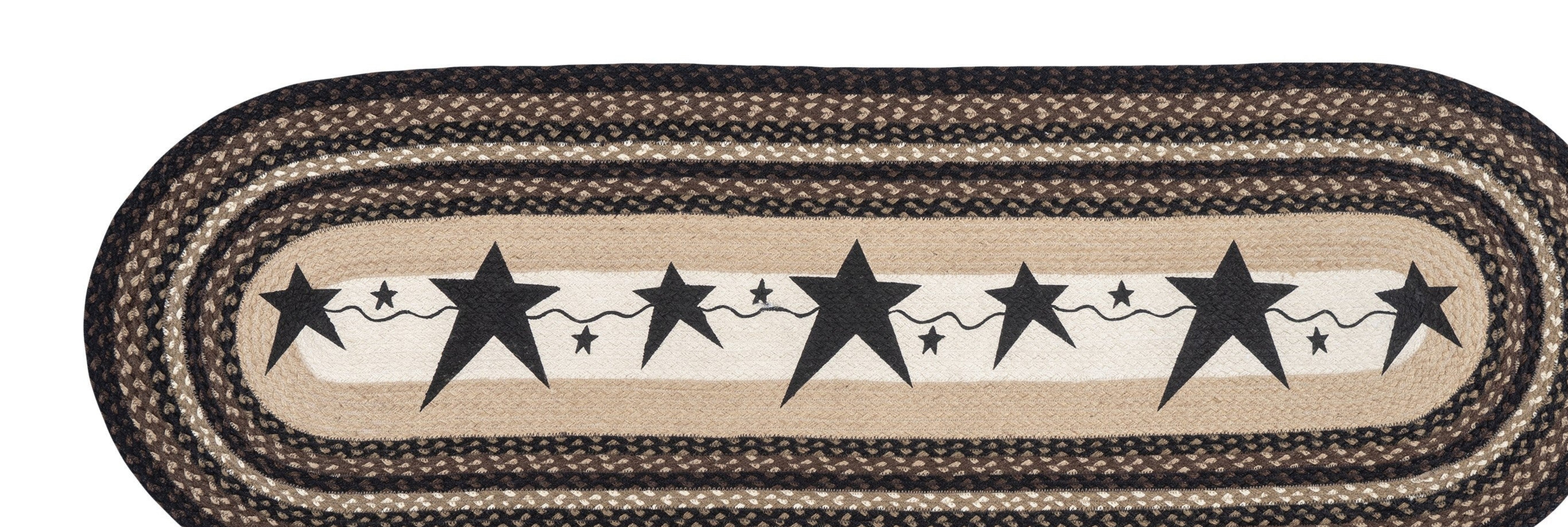 Earth Rugs Oval Patch Runner – 2'x6' Primitive Black Star Design, Hand-Stenciled Braided Jute Rug