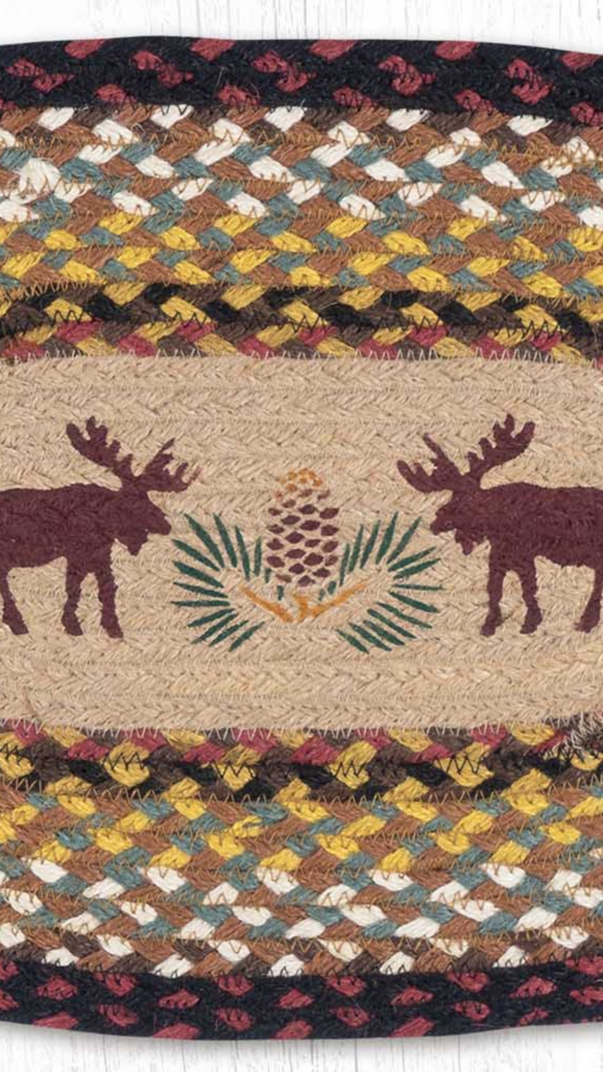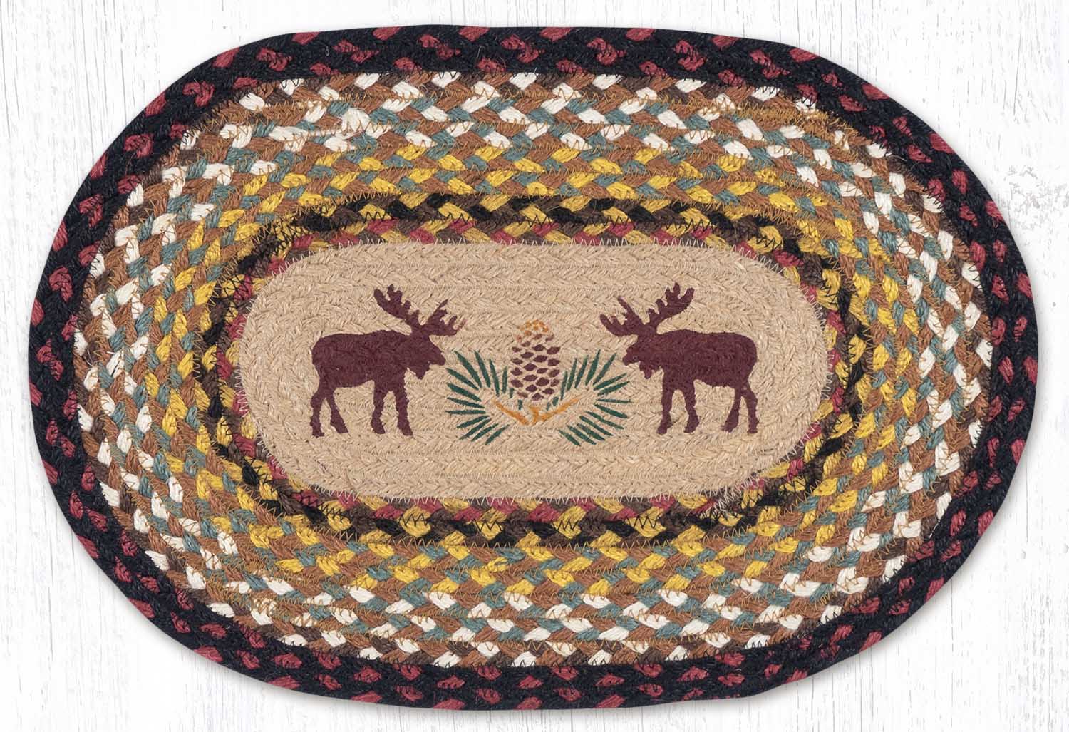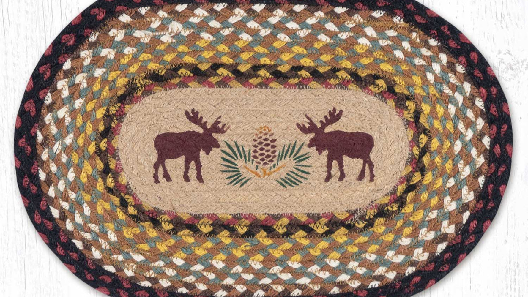 cabin lodge table decor,country farmhouse lodge placemat,Earth Rugs,Earth Rugs oval placemat,farmhouse wildlife dining mat,handcrafted moose pinecone placemat,jute oval placemat 13x19,moose pinecone placemat,Placemat,rustic lodge dining room accessory,rustic oval jute placemat,Uber Living,Under $100,wildlife rustic table setting