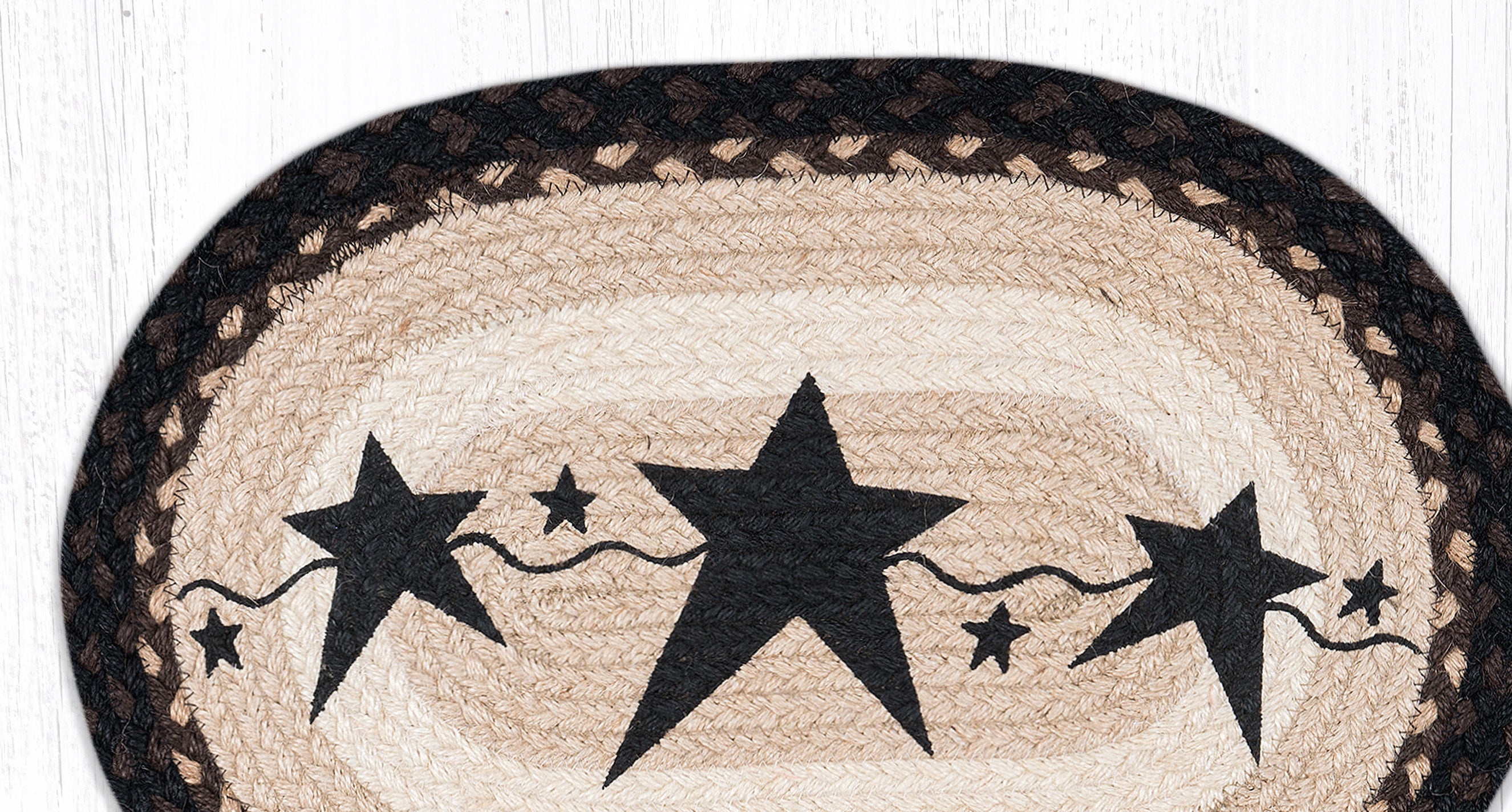 SKU - ER48-313PSBPrimitive Star Black Oval Placemat 13"x19" – Hand-Stenciled Braided Jute Table Mat with Americana Design