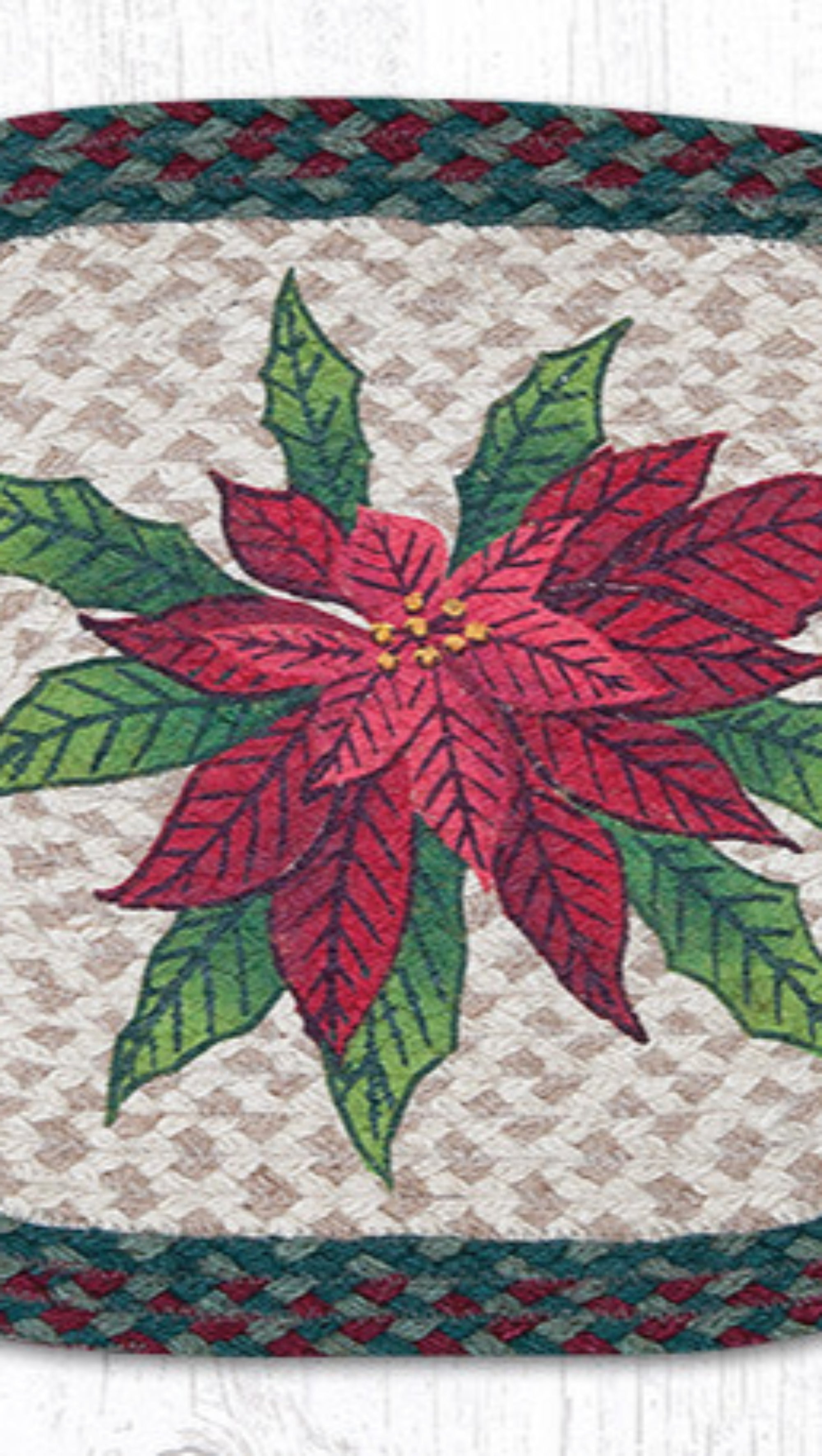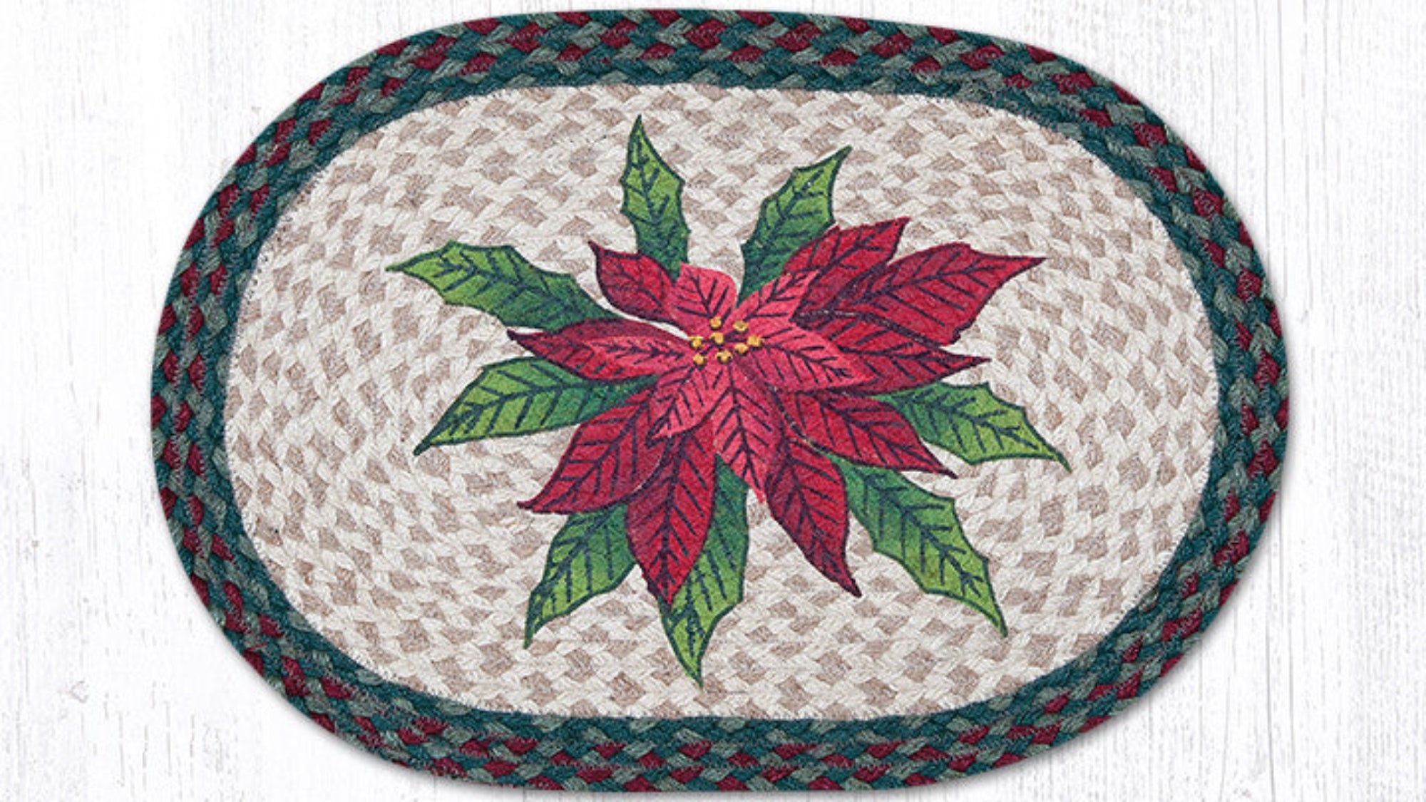 Christmas dining accent,Earth Rugs,Earth Rugs oval placemat,eco-friendly jute placemat,farmhouse oval placemat,festive dining placemat,hand-stenciled poinsettia,handwoven festive placemat,holiday table décor,jute Christmas placemat,lodge style placemat,oval table mat,Placemat,poinsettia placemat,rustic holiday décor,rustic lodge table mat,seasonal farmhouse décor,Under $100