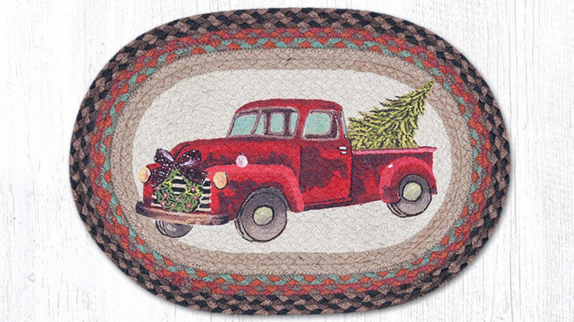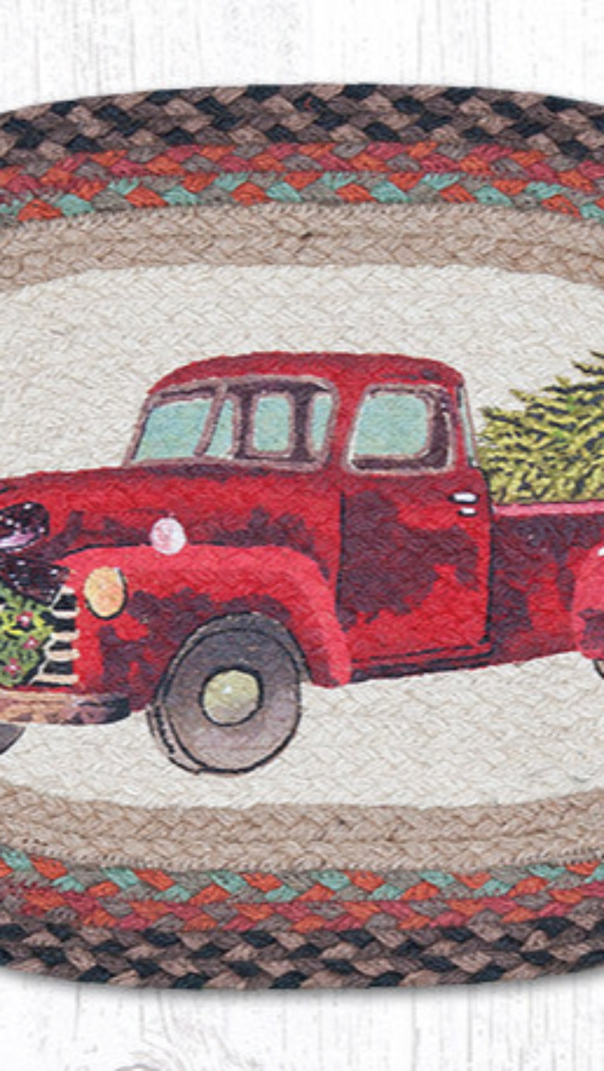 braided jute Christmas dining mat,Christmas truck farmhouse kitchen accessory,Christmas truck placemat,cottage Christmas table mat,country holiday table décor,Earth Rugs,Earth Rugs Christmas décor,eco-friendly jute Christmas table mat,farmhouse holiday dinner décor,festive farmhouse kitchen décor,holiday dining room table accent,Placemat,rustic cabin holiday placemat,rustic farmhouse holiday décor,rustic oval holiday placemat,seasonal oval dining placemat,Under $100,vintage red truck holiday placemat