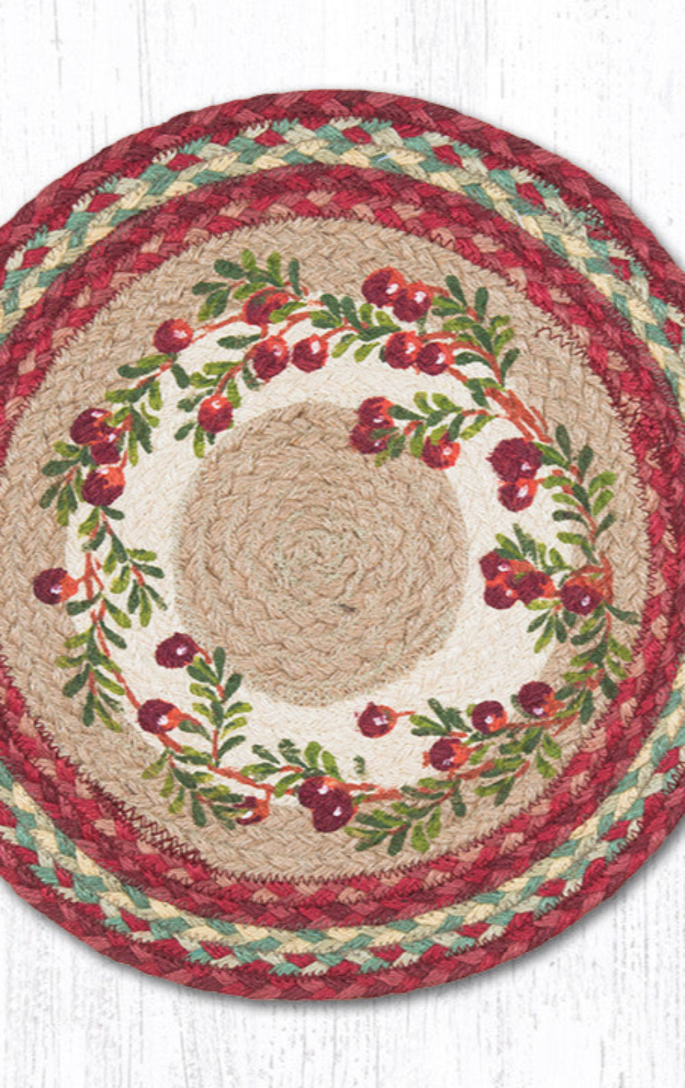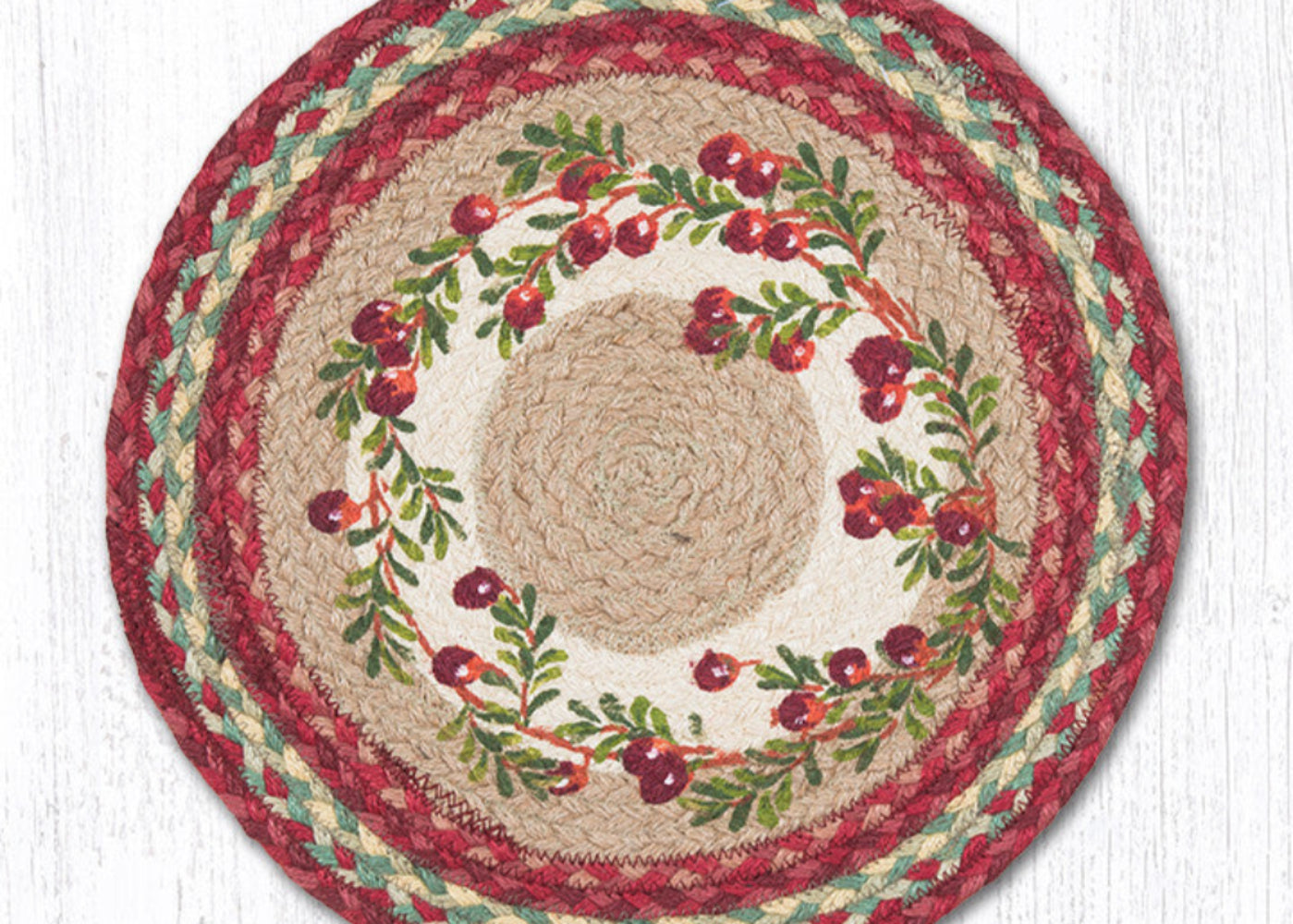 braided jute dining accessory,country farmhouse décor,cranberries round placemat,Earth Rugs,Earth Rugs placemat,eco-friendly jute table mat,farmhouse dining placemat,hand stenciled round placemat,holiday dining placemat,jute round placemat,Placemat,rustic kitchen table mat,rustic table décor,Uber Living,Under $100