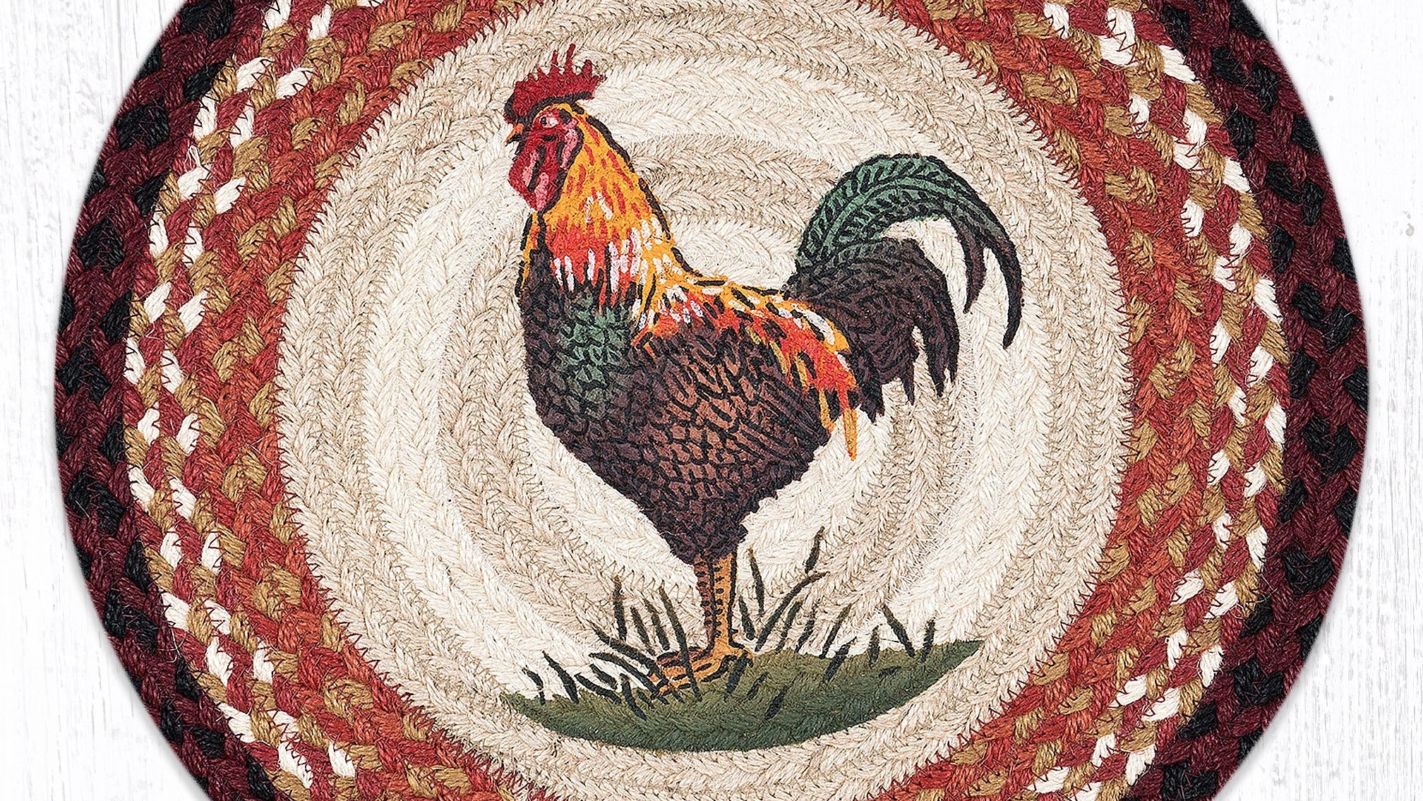 country style placemat,dining room décor,Earth Rugs,Earth Rugs placemat,eco-friendly jute placemat,farmhouse round placemat,hand-stenciled rooster,handcrafted farmhouse mat,jute table mat,lodge dining mat,Placemat,rooster table décor,round jute placemat,rustic kitchen mat,rustic lodge décor,rustic rooster placemat,rustic table accent,Uber Living,Under $100