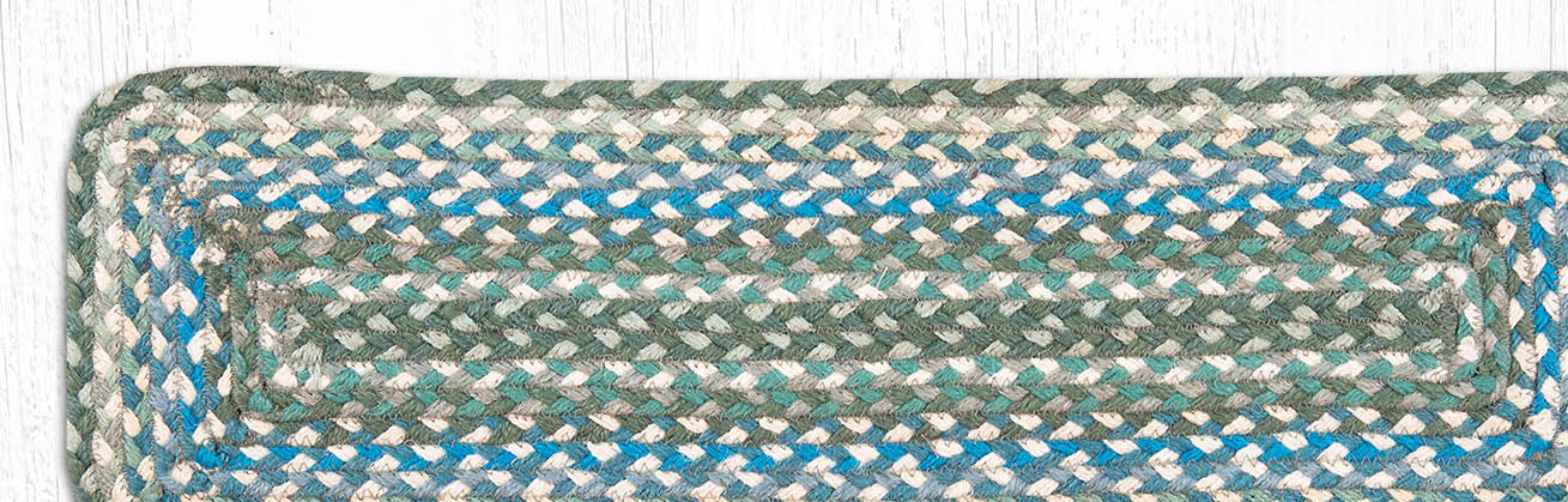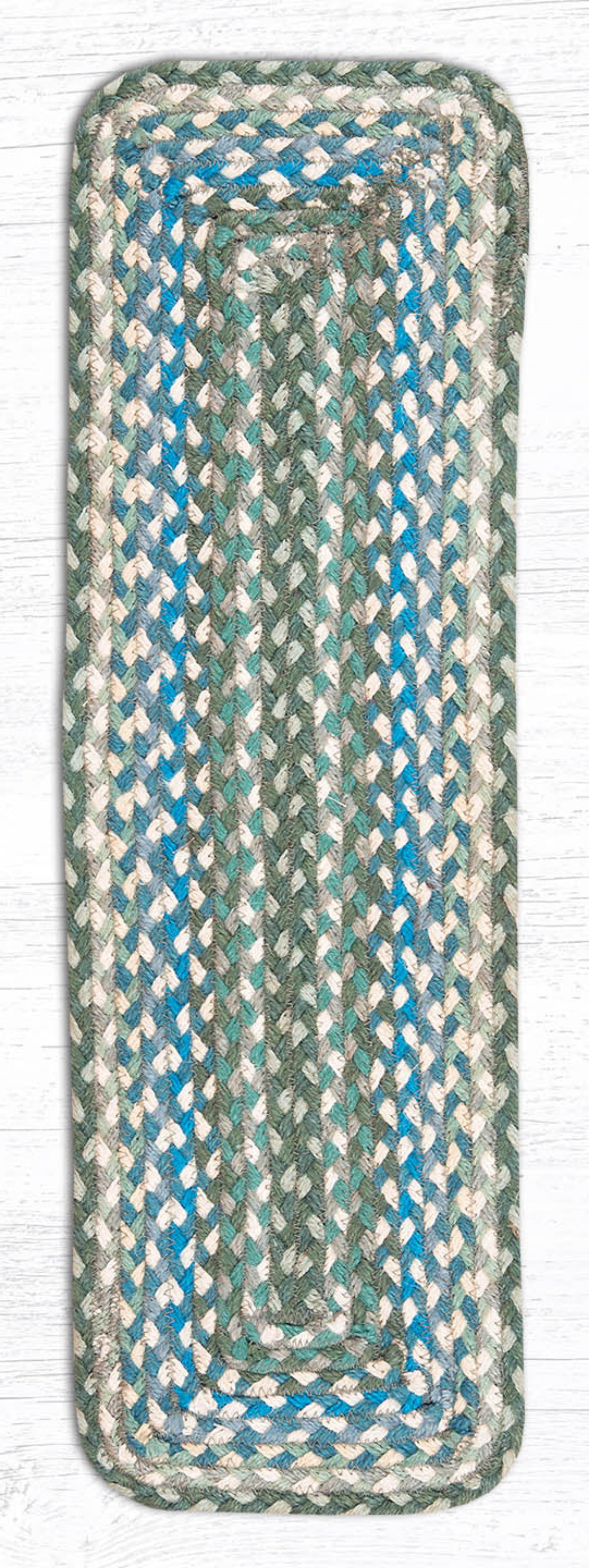 SKU - ER39-419Sage/Ivory/Settlers Blue Rectangle Stair Tread 27"x8.25" – Hand-Braided Jute Rug in Soft Country Coastal Colorway