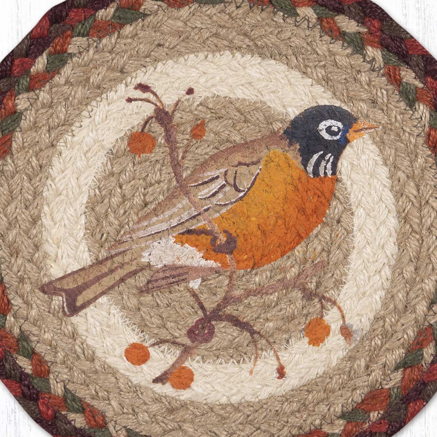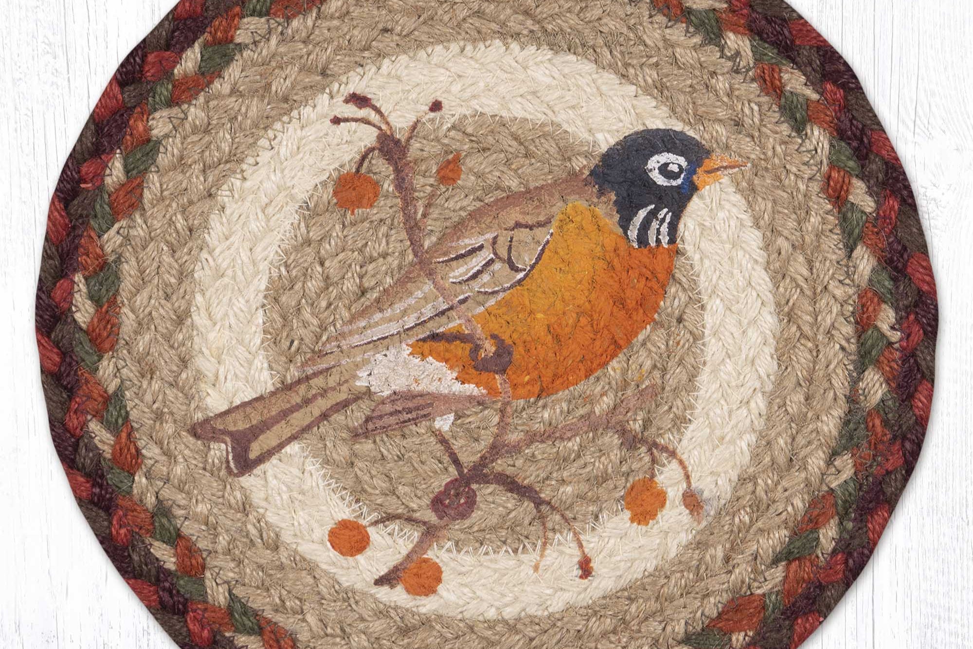 Earth Rugs Robin Round Trivet – 10" Red-Breasted Bird Print on Braided Natural Jute Table Mat