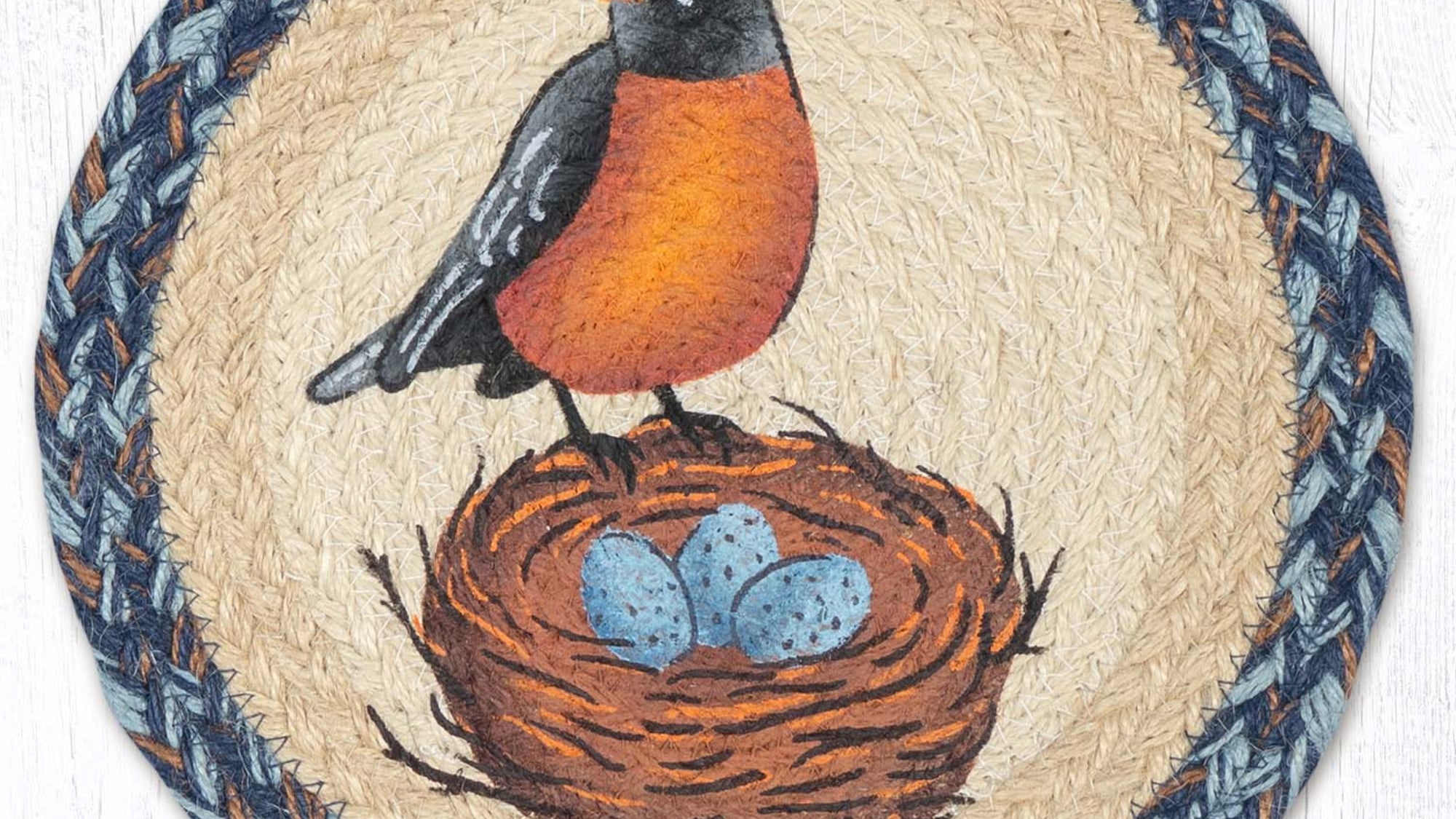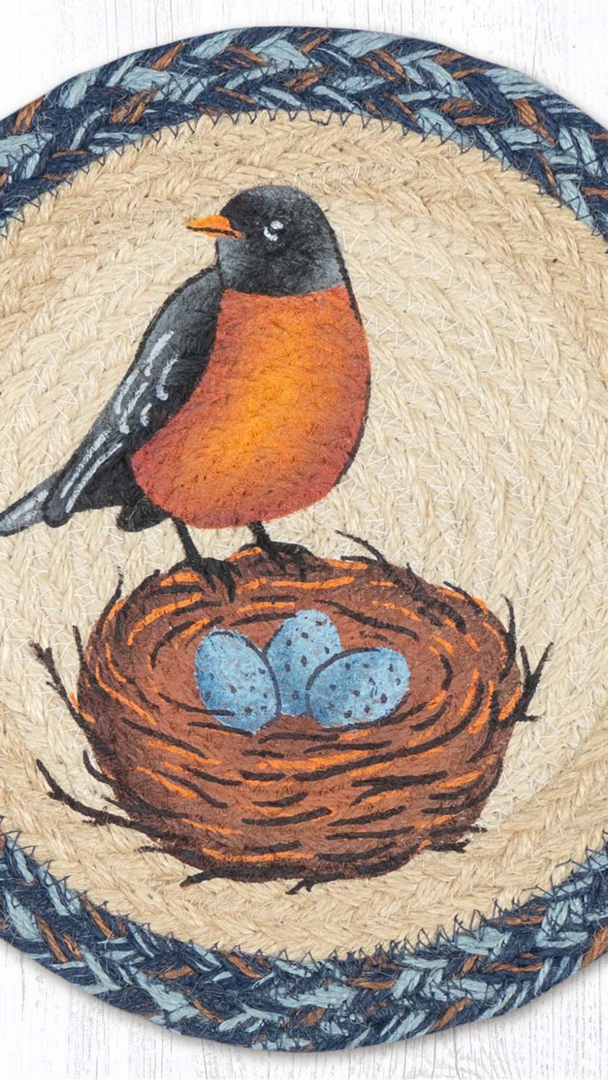 artisan braided jute hot pad,bird lover home decor,bird print jute trivet,braided jute trivet,country farmhouse trivet,decorative round trivet,Earth Rugs robin trivet,eco-friendly rustic hot pad,farmhouse kitchen hot pad,Kitchen Accessories,lodge style trivet,nature-inspired table trivet,robin nest kitchen decor,robin trivet,rustic jute kitchen accent,rustic table protector