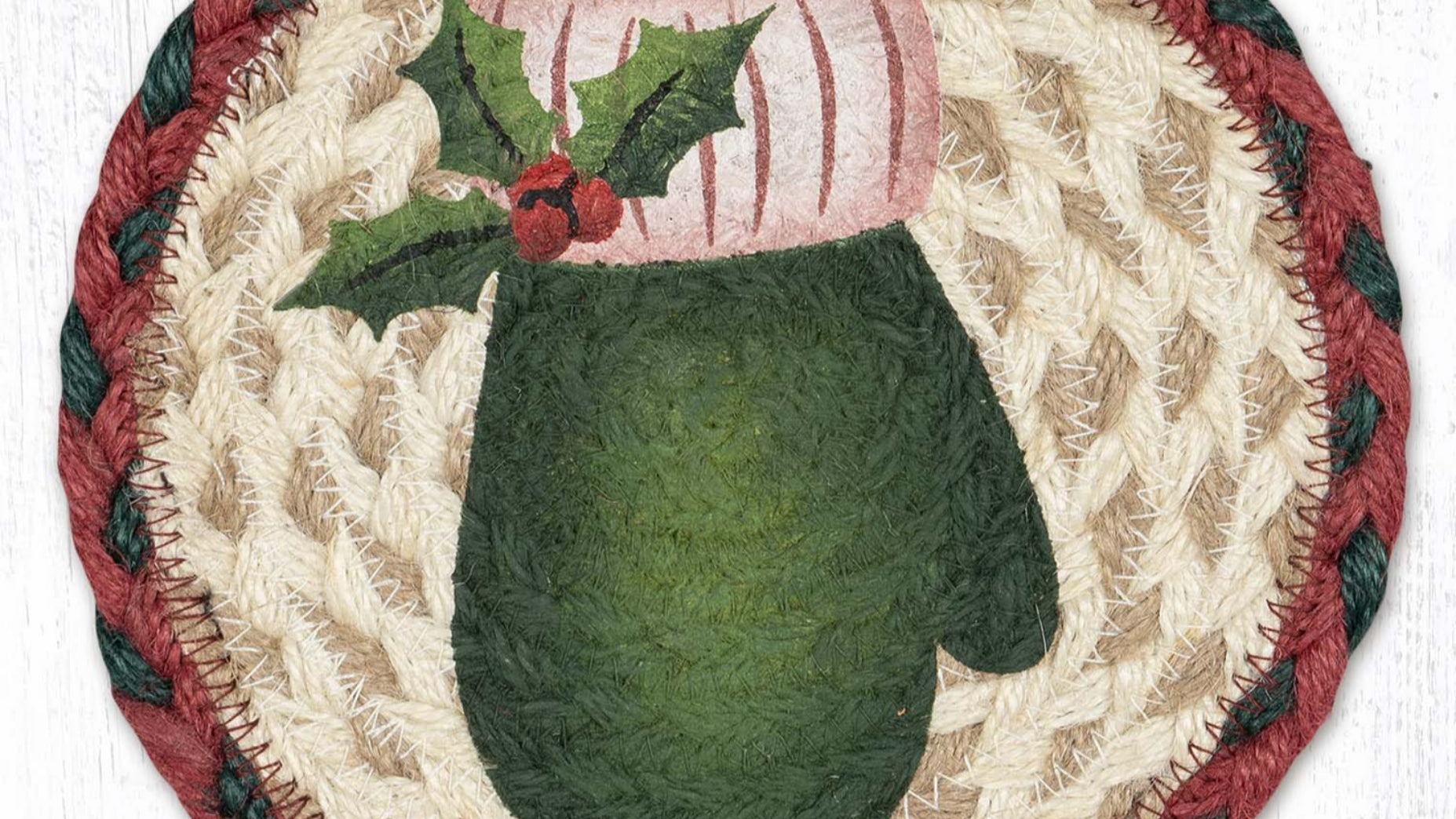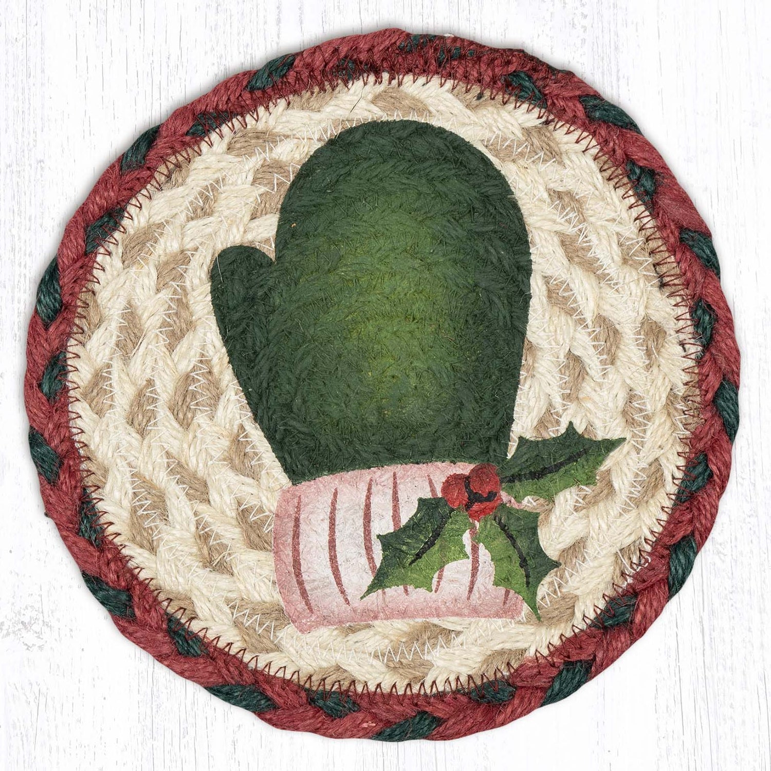 SKU - ER79-875GMRound Green Mitten Coaster – 7" Braided Jute Mat with Hand-Stenciled Holiday Mitten in Forest Green and Festive Winter Colors
