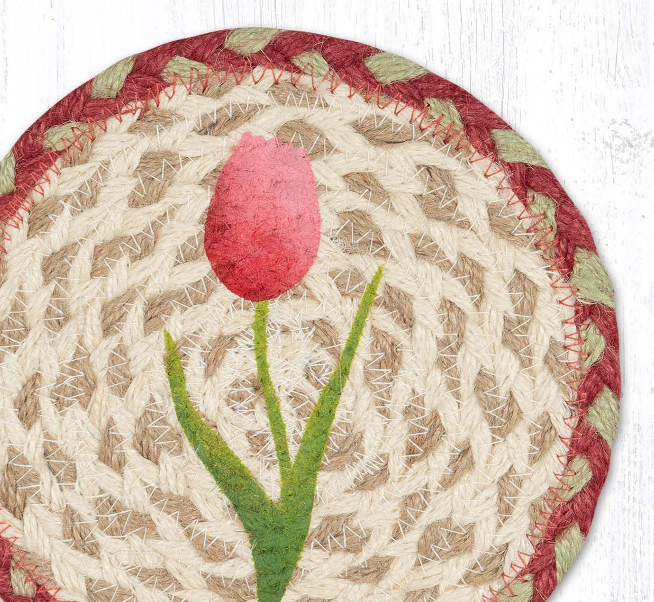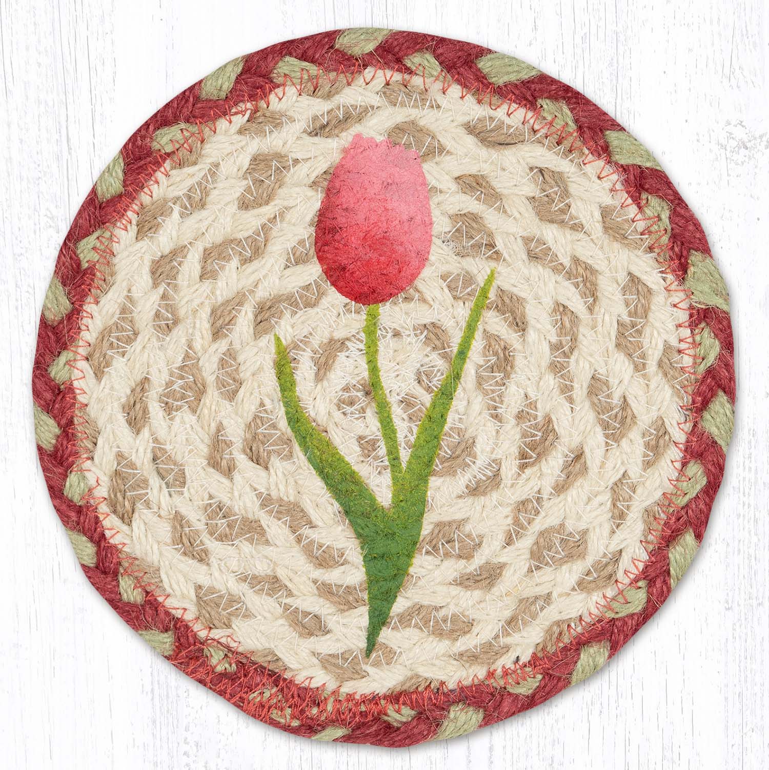 Earth Rugs Round Tulips Coaster – 7" Braided Jute Mat with Hand-Stenciled Spring Tulip Design in Pink, Yellow & Green Floral Tones