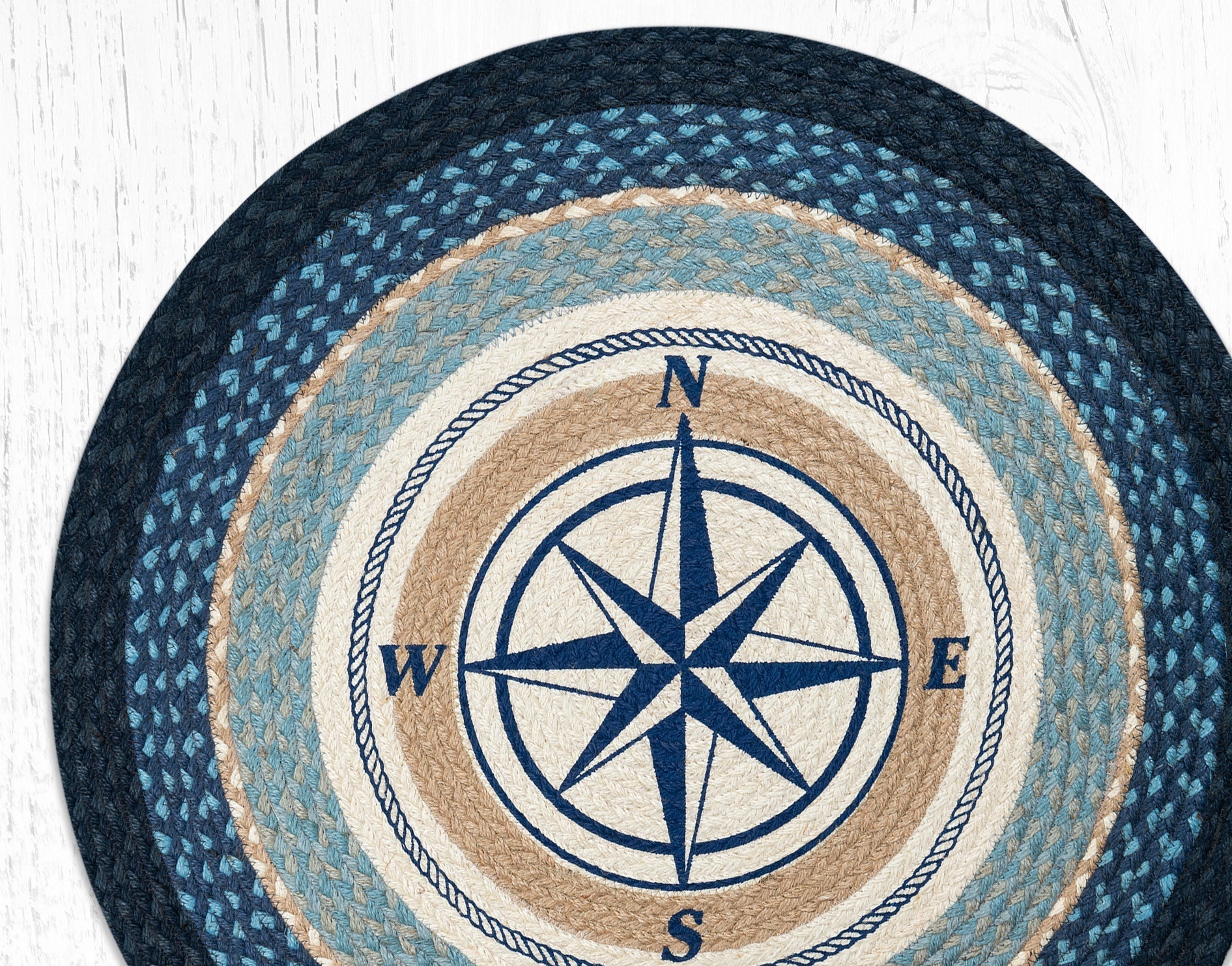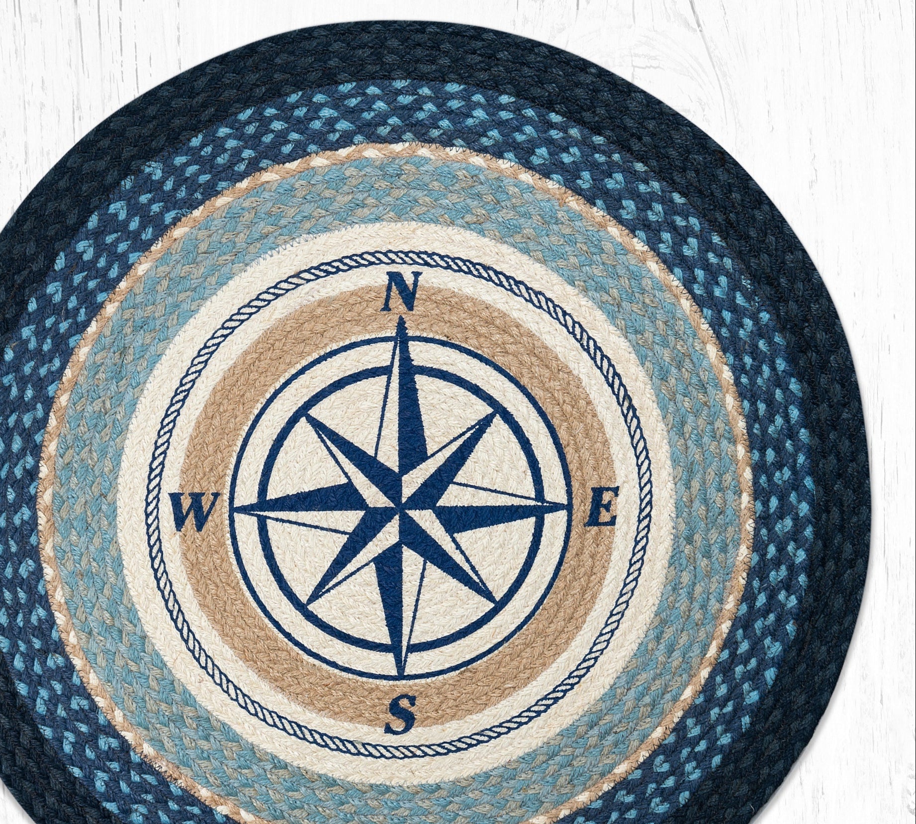 SKU - ER66-443CRRound Patch Tread – Compass Rose Nautical Design in Braided Jute, 27"x27" Coastal Accent Rug