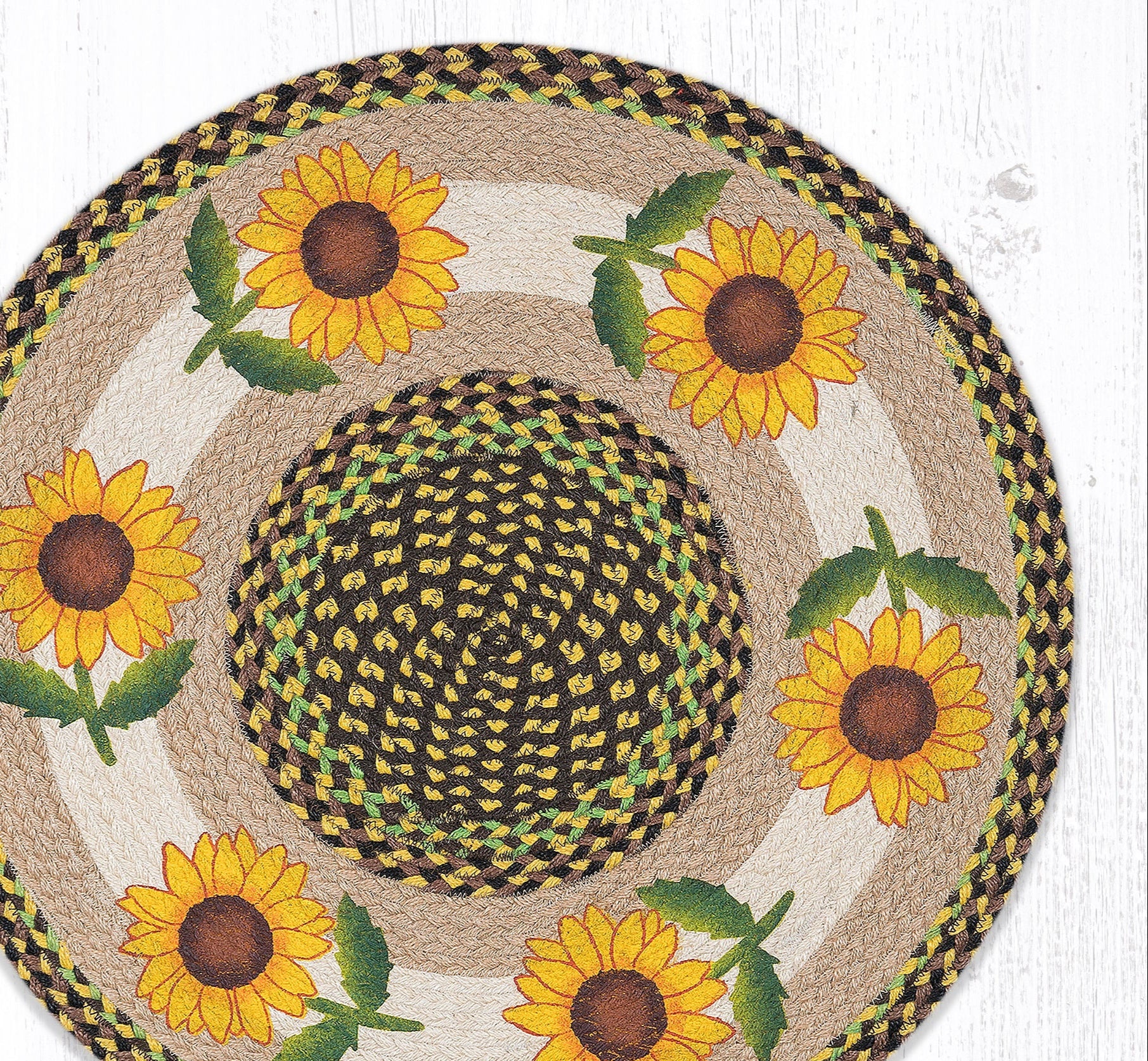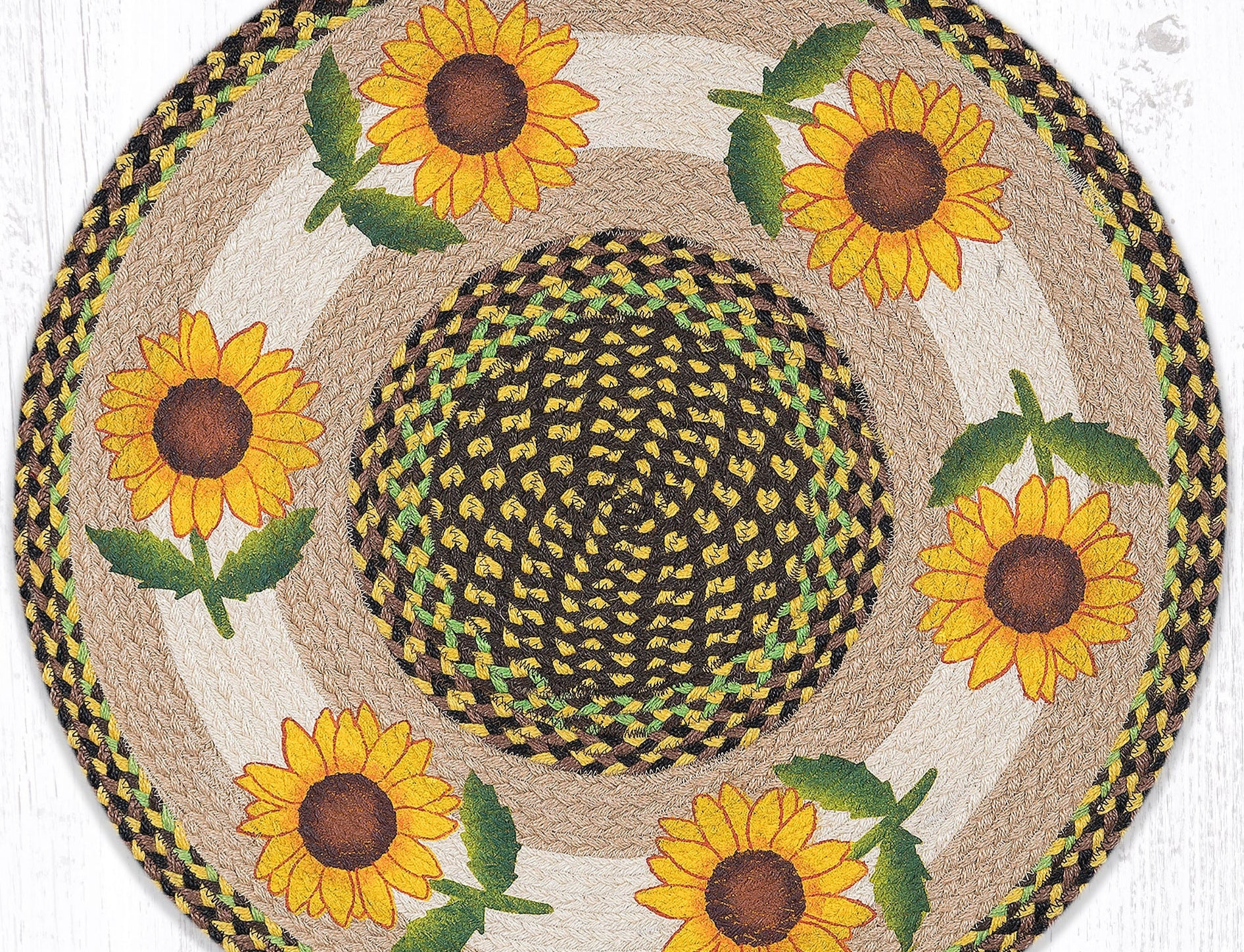 Good Sunflower Round Patch Tread – 27"x27" Braided Jute Rug with Hand-Stenciled Rustic Floral Center Design