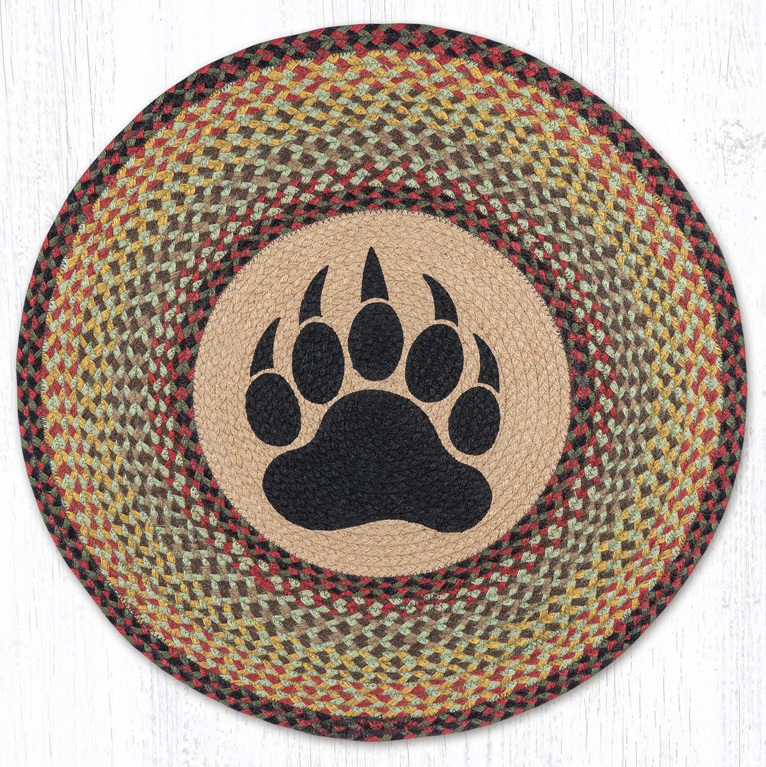 bear paw rug,braided patch rug,cabin bear paw rug,durable rustic rug,Earth Rugs,Earth Rugs cabin rug,eco-friendly accent rug,entryway round rug,farmhouse round rug,handcrafted jute rug,lodge cabin decor,Placemat,round jute rug,rustic country rug,rustic lodge decor,rustic patch round rug,Under $100,woodland lodge accent