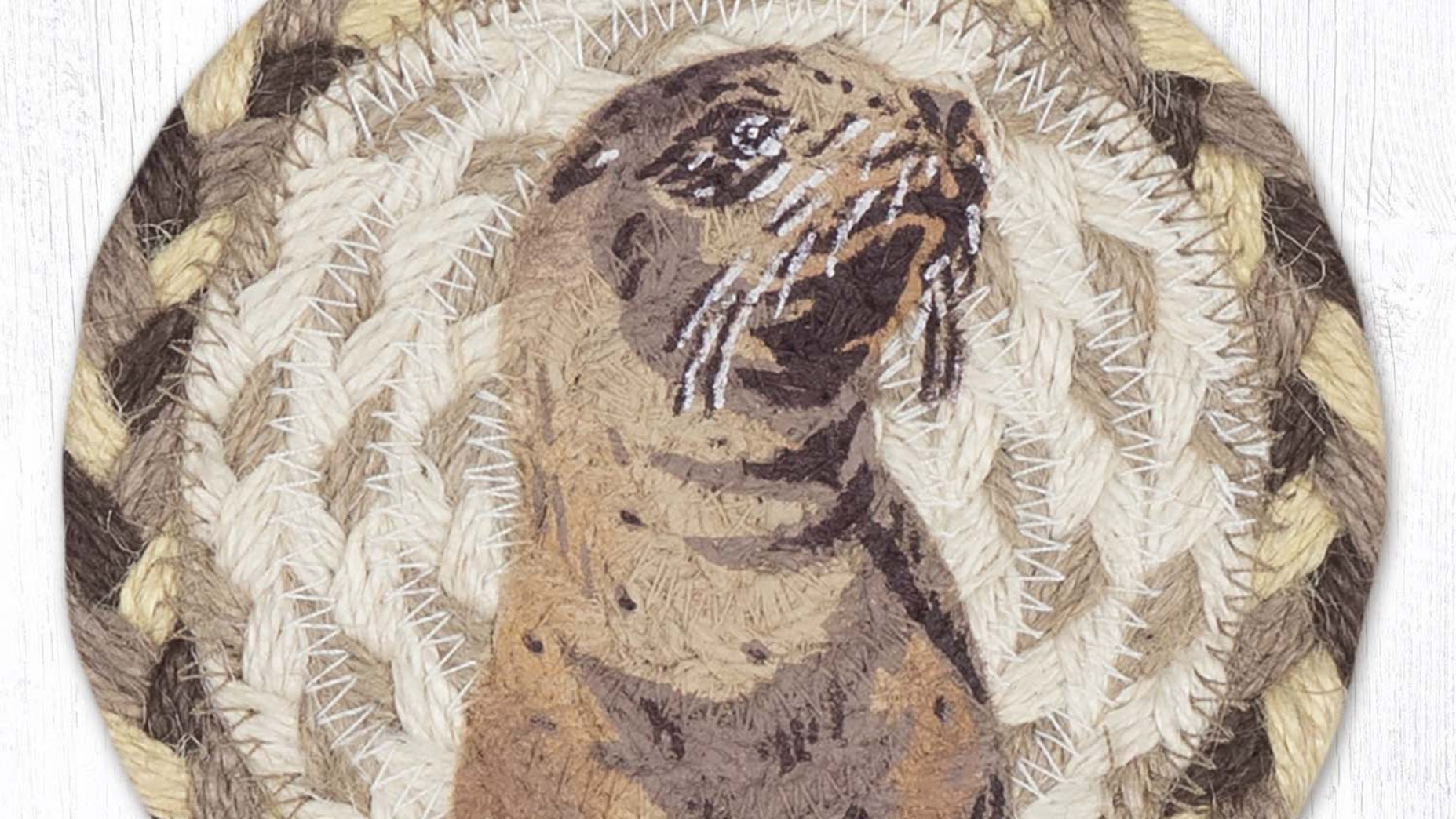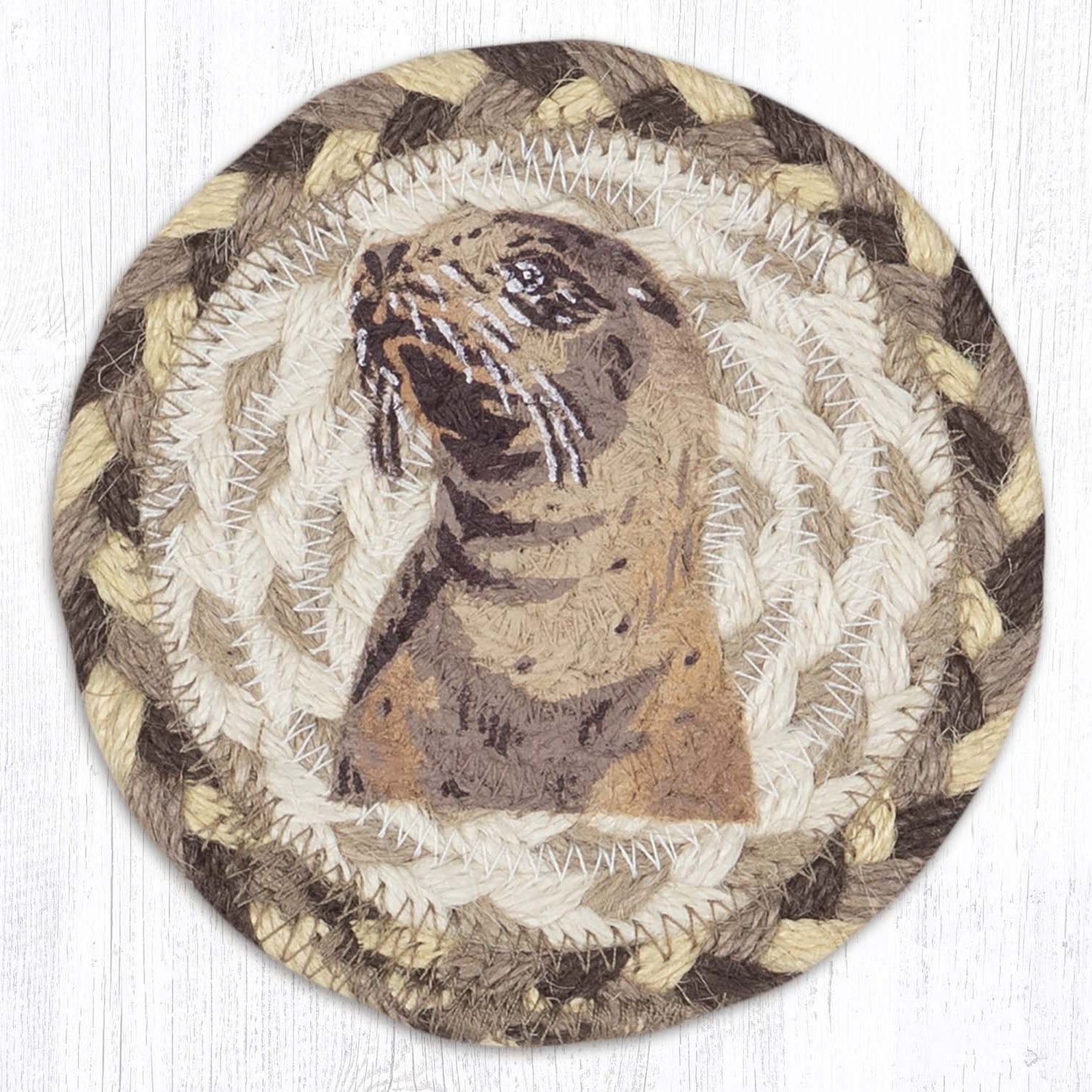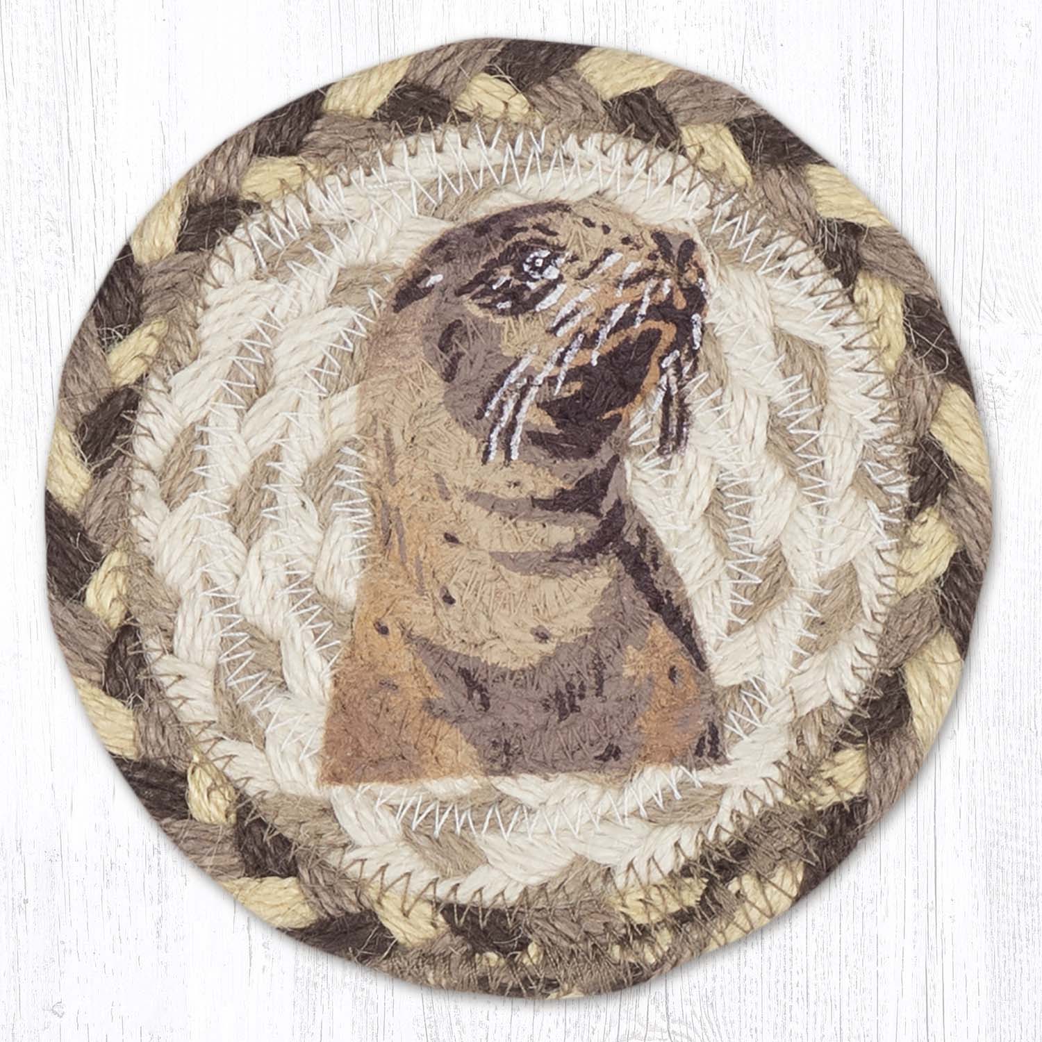 Earth Rugs Sea Lion Jute Coaster – 5"x5" Round Natural Braided Coaster with Coastal Marine Animal Print