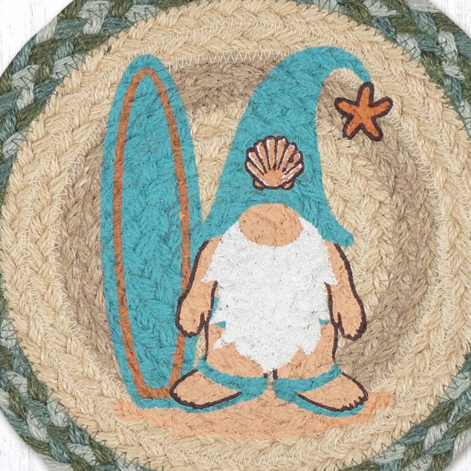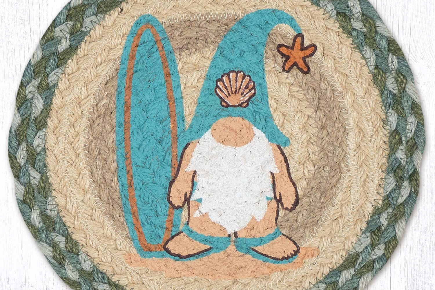 Earth Rugs Surfer Gnome Round Trivet – 10" Summer Beach Gnome Braided Jute Hot Pad