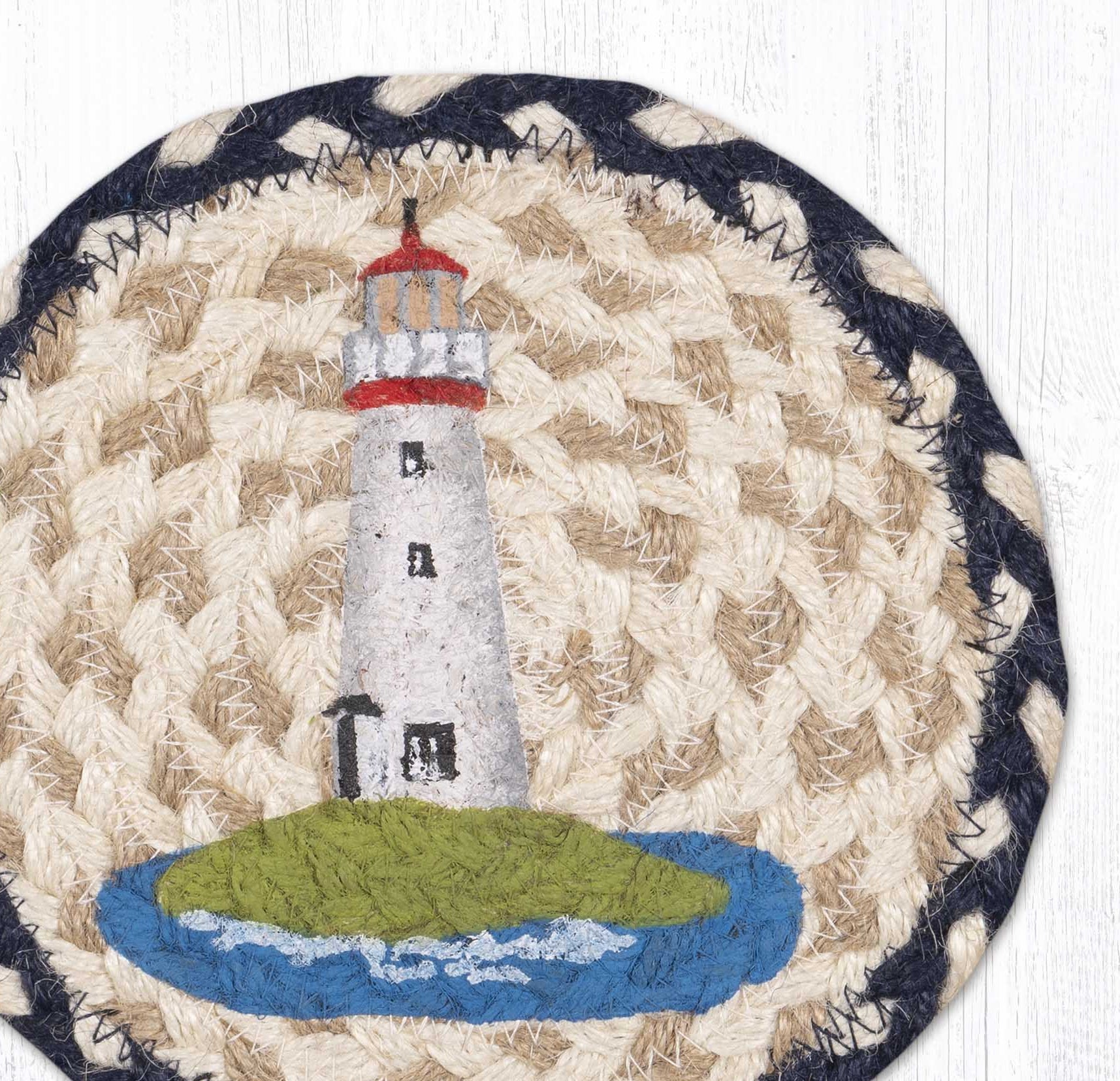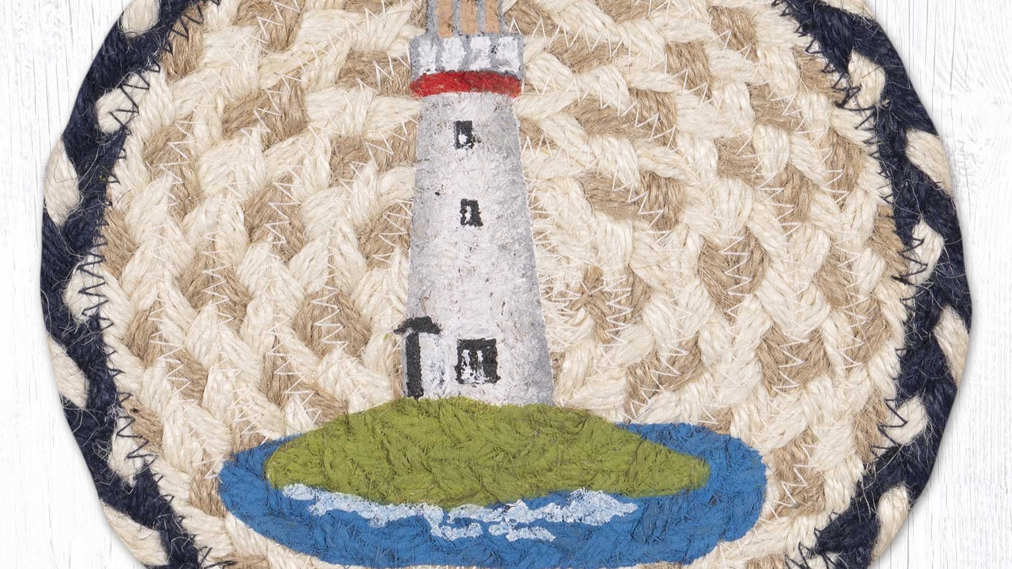 Capture the serene beauty of coastal living with the Earth Rugs White Lighthouse Round Large Coaster, sized at 7"x7". Crafted from 100% natural braided jute, this nautical accent features a hand-stenciled white lighthouse set against a warm, earthy background. The detailed stitching and braided border add textural depth, while the round shape offers generous space for mugs, candles, or small décor. Ideal for coastal cottages, beach homes, or lakefront retreats, this functional coaster protects surfaces while bringing a breezy, maritime feel to your interior. Lightweight, durable, and display-ready for everyday or seasonal use.