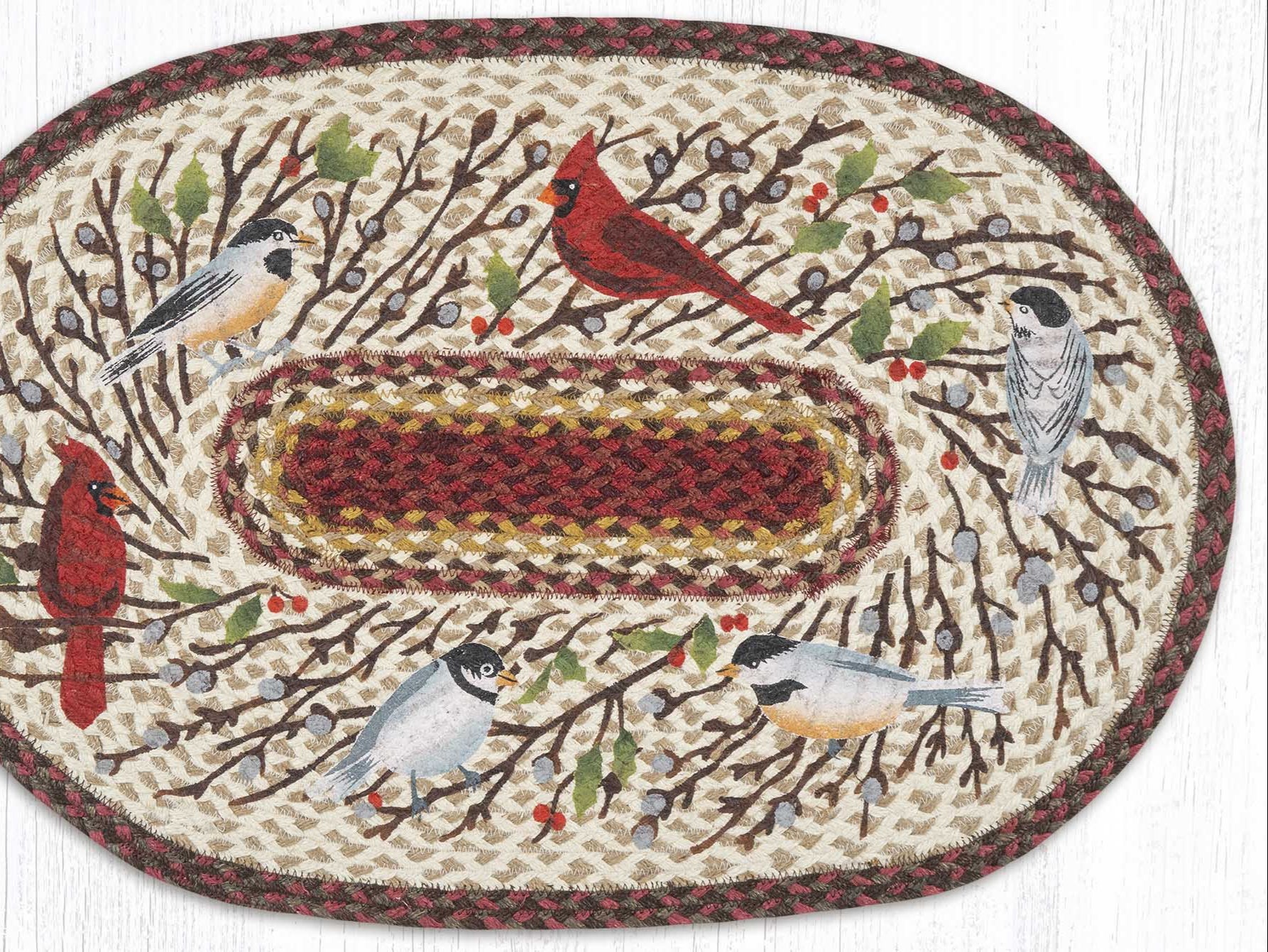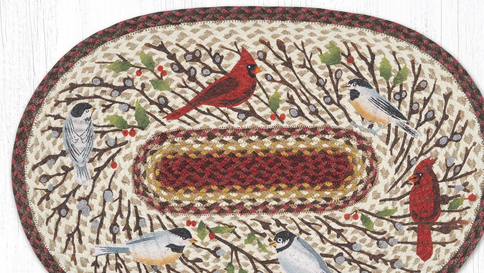 SKU - ER65-780WBWinter Birds Oval Patch Rug – Hand-Braided Jute 20x30 Seasonal Accent Mat with Cardinals and Pine