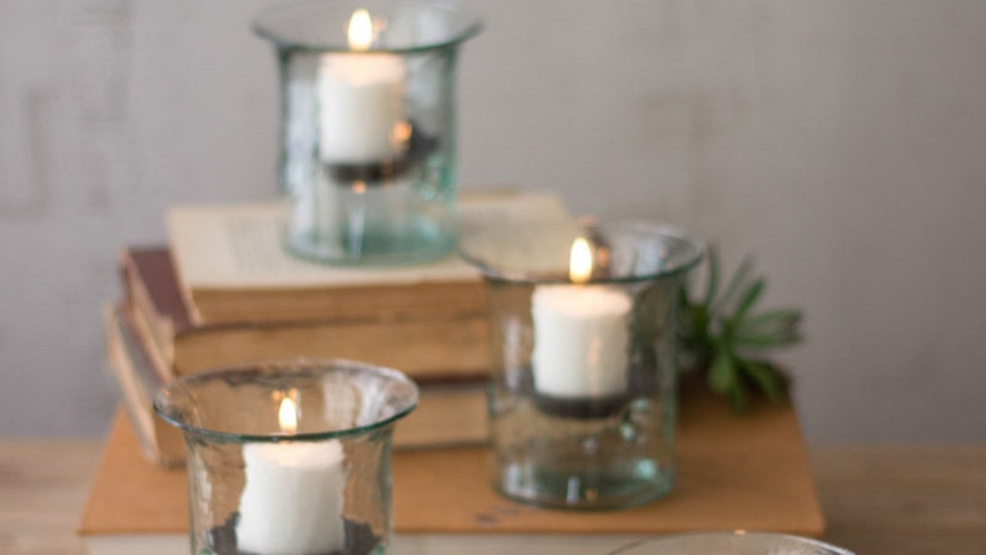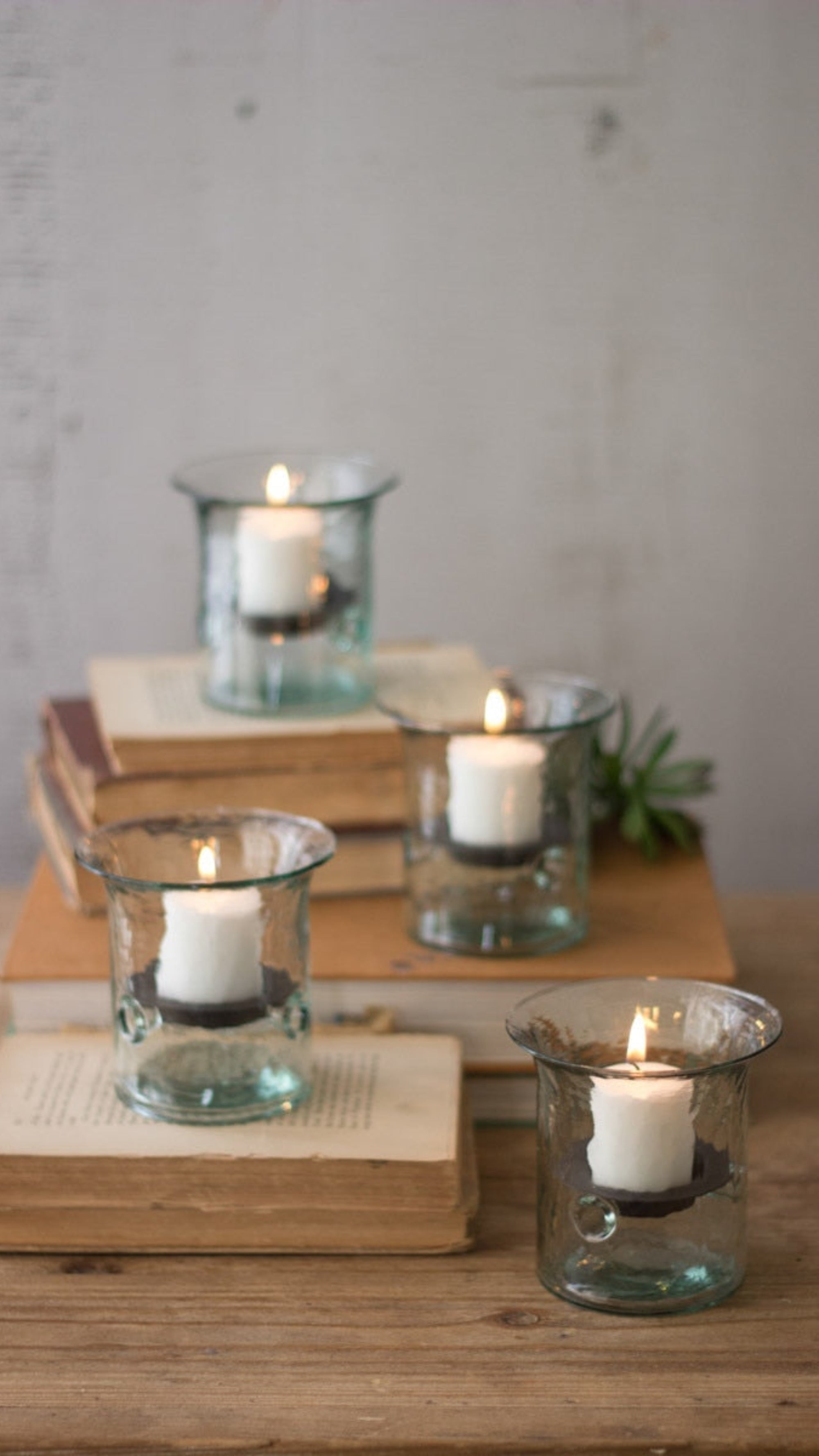 clear glass candle cylinders,Colombian artisan decor,eco-friendly home accents,handblown glass decor,handcrafted votive set,mini glass candle holders,Natural Noel,recycled glass home accessories,recycled glass votive holders,rustic metal insert candle holders,small glass votive set,sustainable glass candle holders,tabletop candle decor