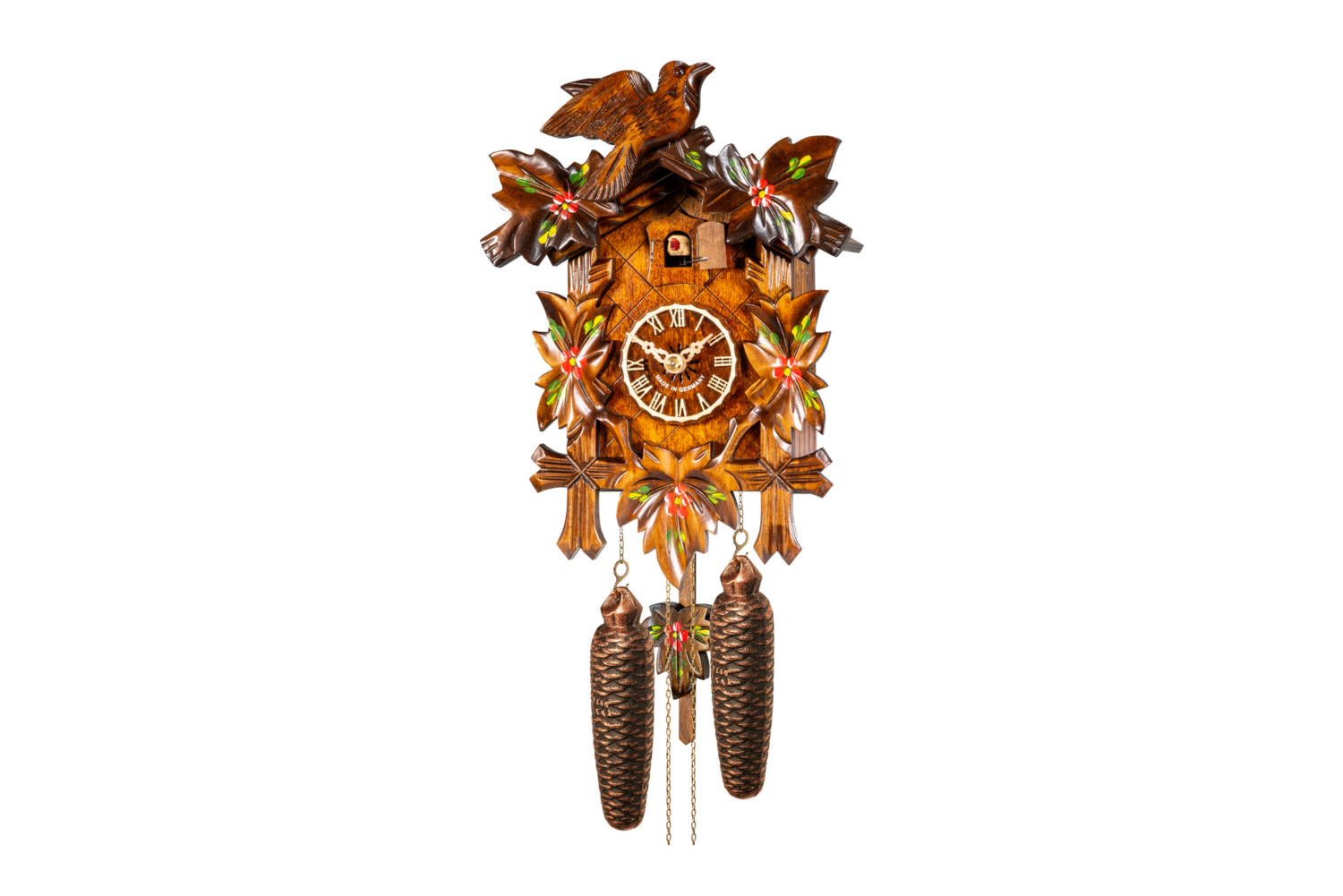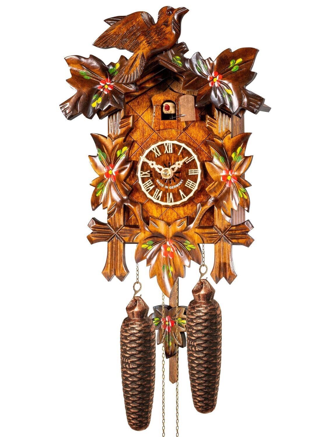 This eight day cuckoo clock features five hand-carved maple leaves, a single bird, and delicate painted floral accents. Crafted by master artisans in the Black Forest of Germany, it combines traditional design with colorful hand-painted details. The clock is powered by an all brass mechanical movement, which drives the cuckoo bird to announce the hour at the top of every hour. Measuring 13 inches in height, 8.5 inches in width, and 6.5 inches in depth, it fits comfortably in any room while providing intricate artistry. With an eight day winding cycle, this clock offers both charm and reliable performance, making it ideal for collectors and home décor enthusiasts.