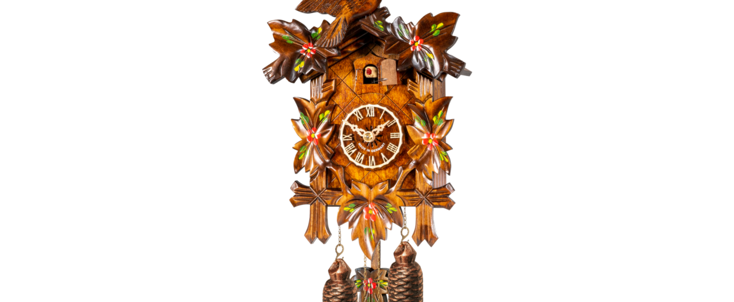 Eight Day Cuckoo Clock With 13 Inch Height Five Hand-Carved Maple Leaves One Bird Painted Flowers By River City Clocks