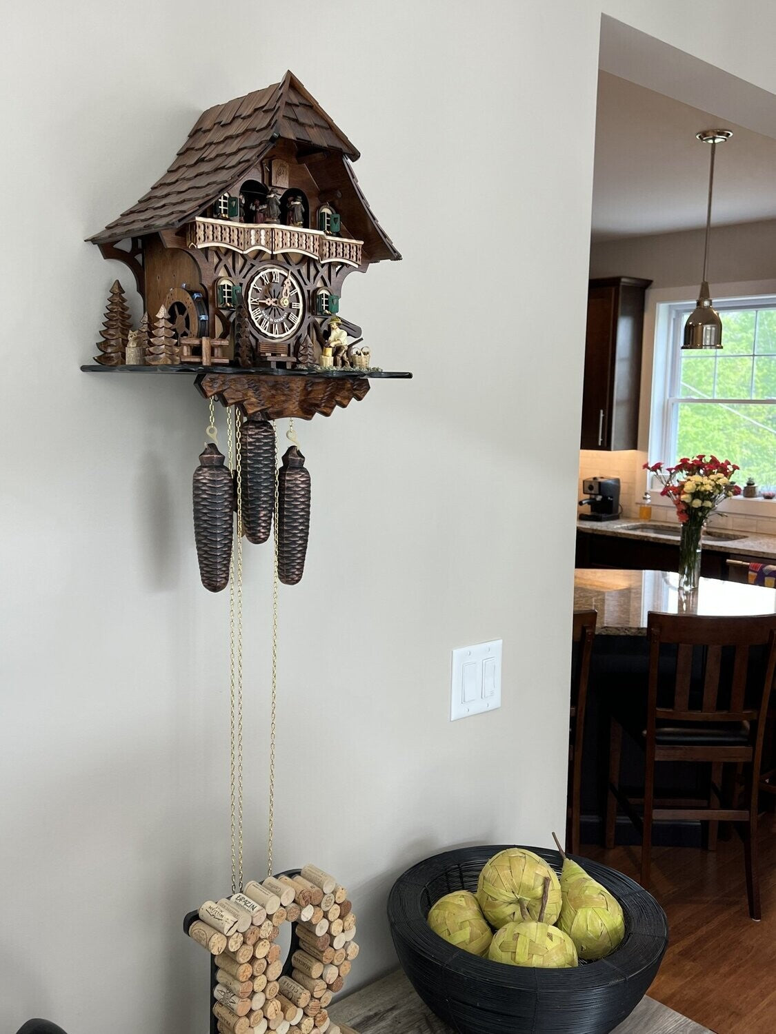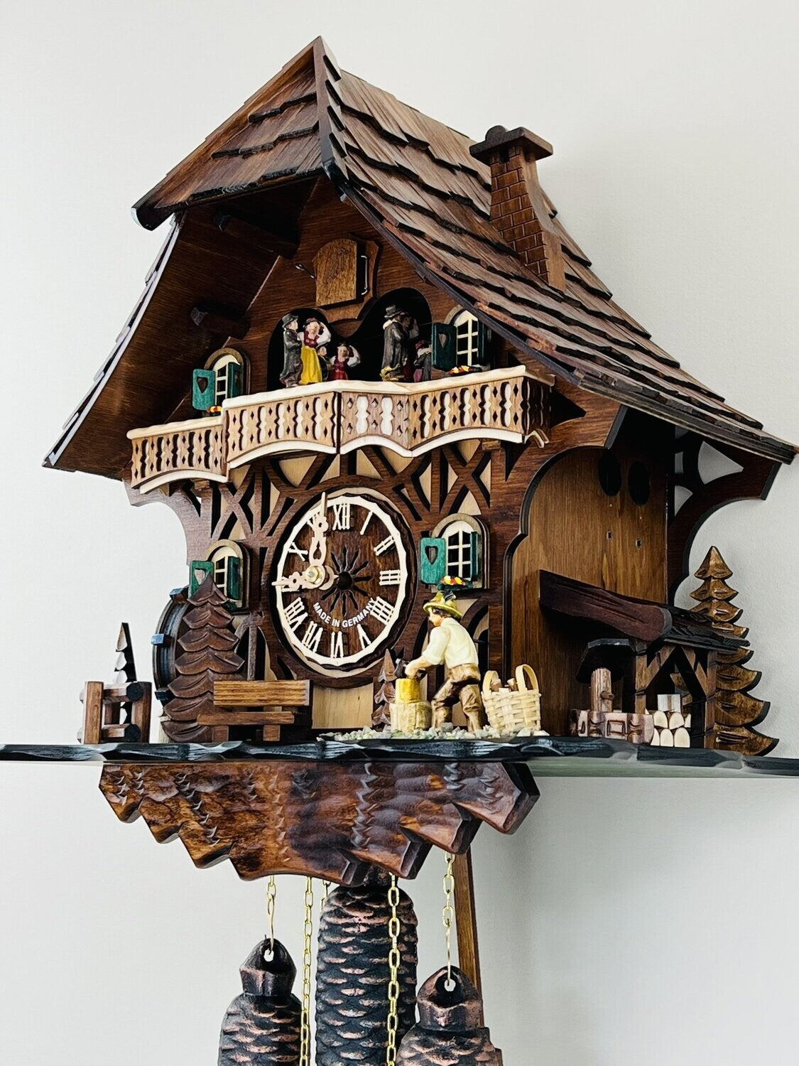 This eight day mechanical musical cuckoo clock features a charming cottage scene with a hand-carved woodchopper who chops a log each hour. The clock also includes a moving waterwheel and detailed hand-made figurines, while dancers revolve on the turntable as music plays. The mechanical music box alternates between two melodies: Edelweiss and The Happy Wanderer. Operating on a traditional eight day mechanical movement, it requires winding once every eight days. Measuring 13 inches high, 10 inches wide, and 14 inches deep, this clock is perfect for rustic, woodland, or nature-inspired décor, adding motion, music, and classic cuckoo charm to any room.
