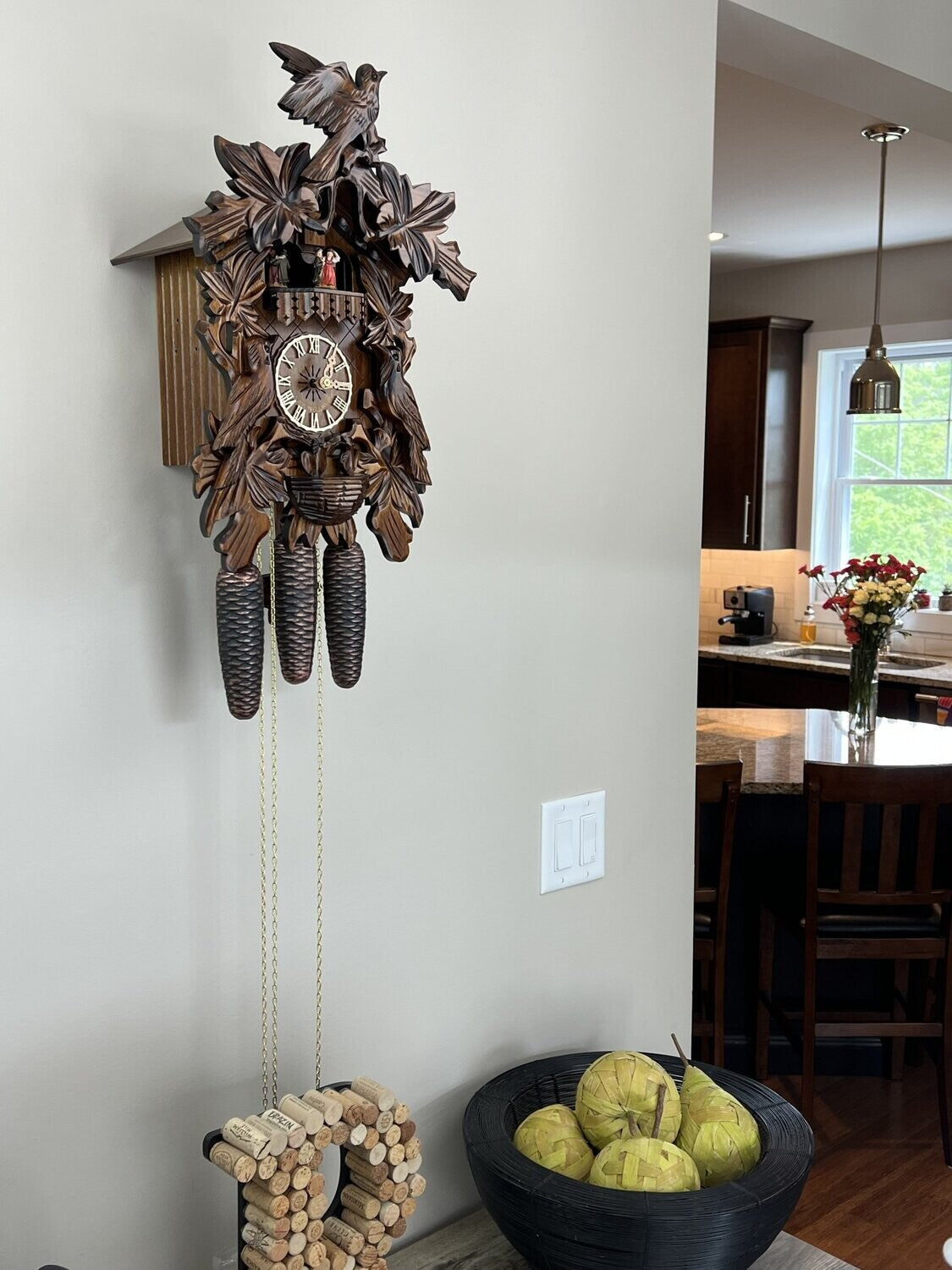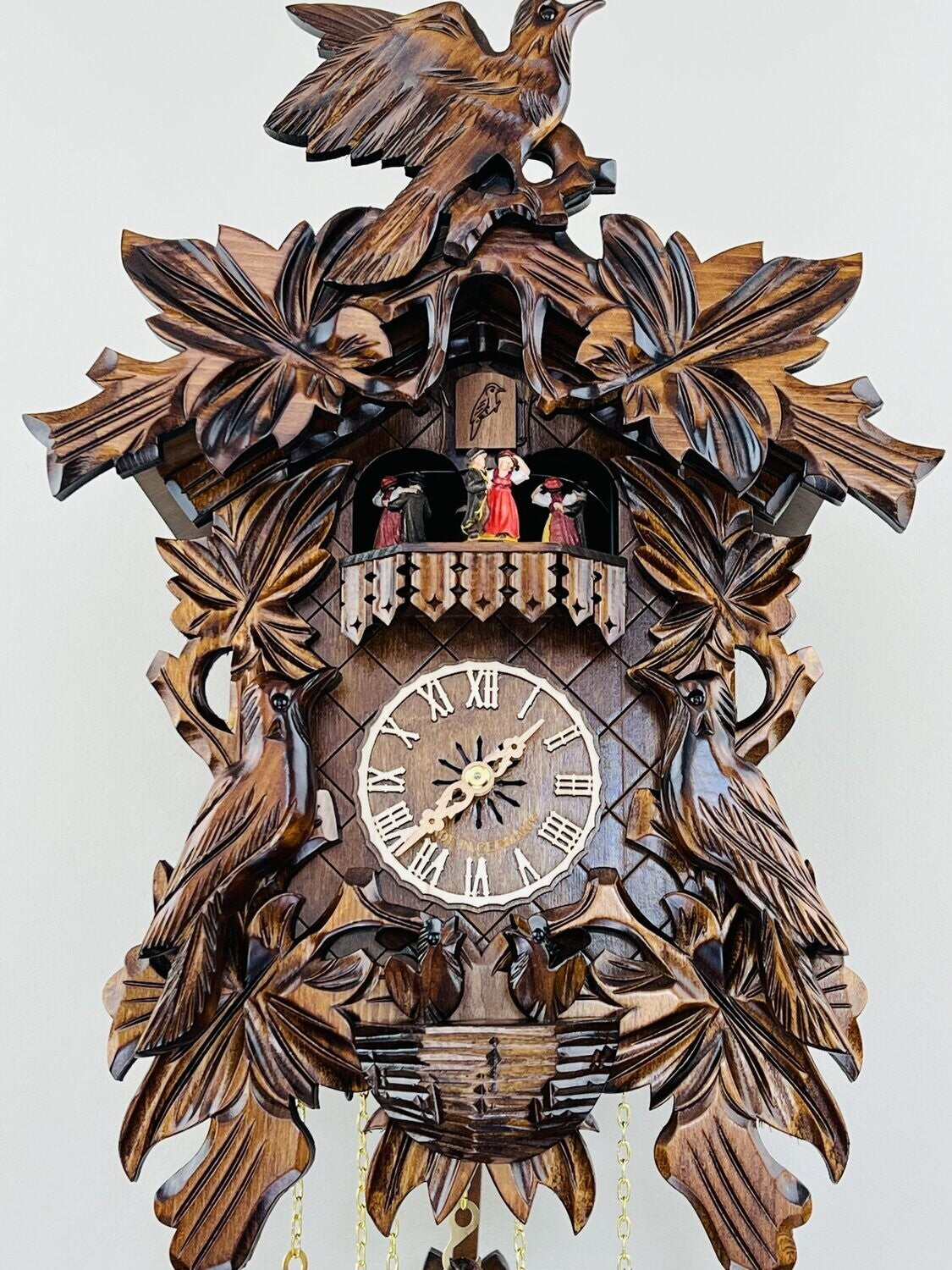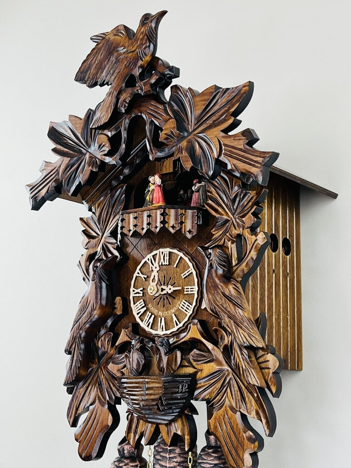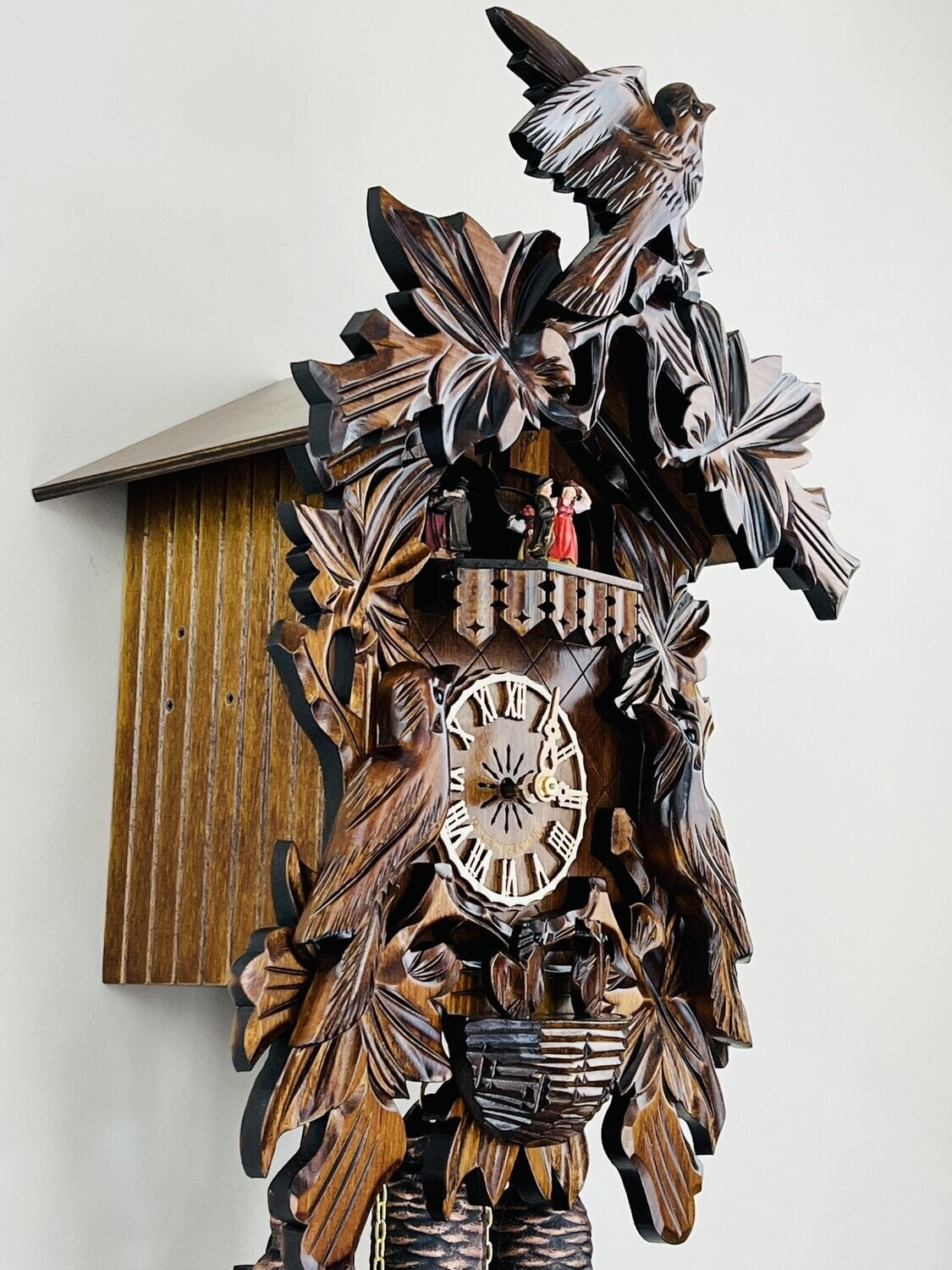 - Cuckoo clock case features hand-carved birds, leaves, and nest