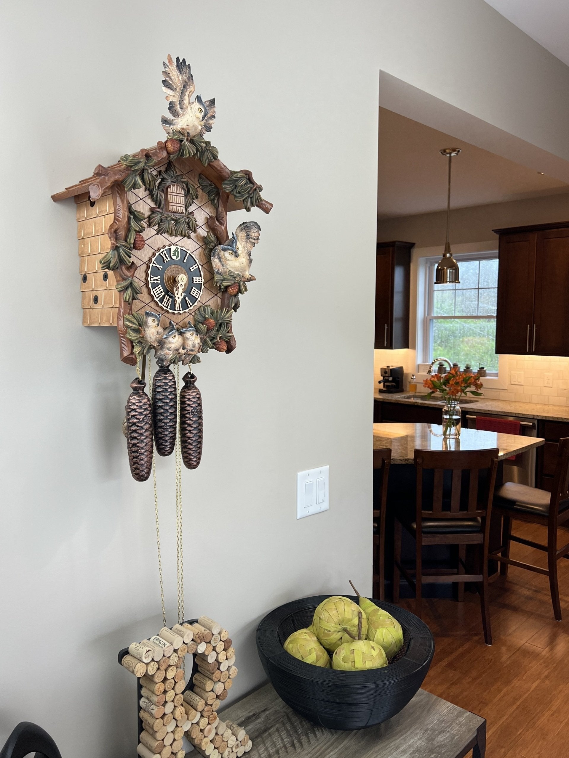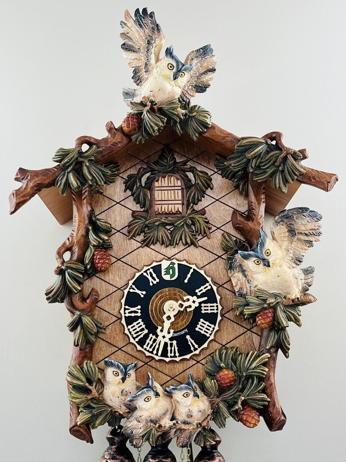 This eight day mechanical musical cuckoo clock features hand-carved owls perched among intricately carved leaves, delivering a charming woodland aesthetic. Each hour, the cuckoo bird announces the time with a traditional hoot sound, while the mechanical music box plays two alternating melodies: Edelweiss and The Happy Wanderer. The clock operates on a mechanical movement that requires winding once every eight days. It measures 20 inches high, 13 inches wide, and 7 inches deep. Ideal for living rooms, dens, or nature-inspired decor, this clock brings both movement and classic cuckoo charm to any space.