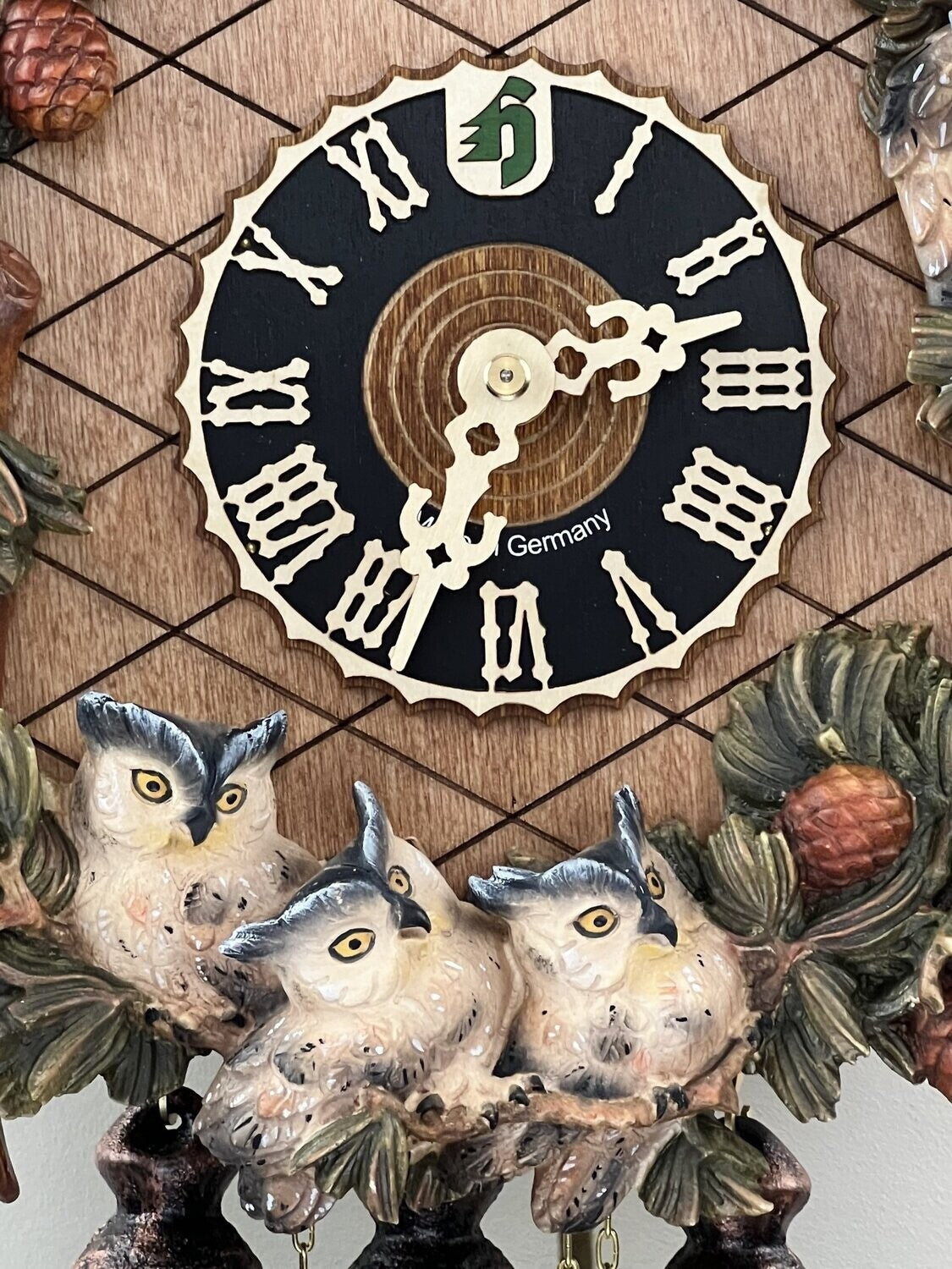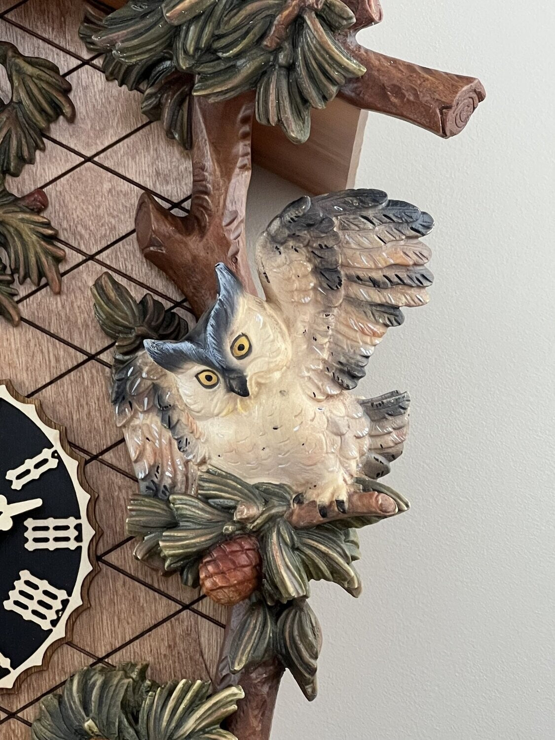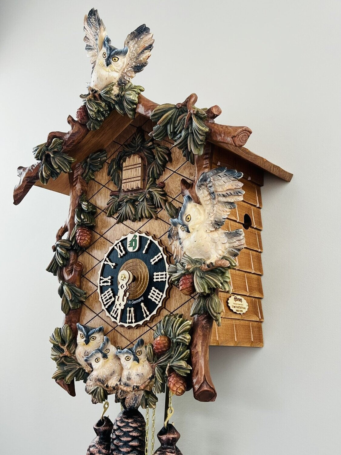 - Features detailed hand-carved owls and leaves