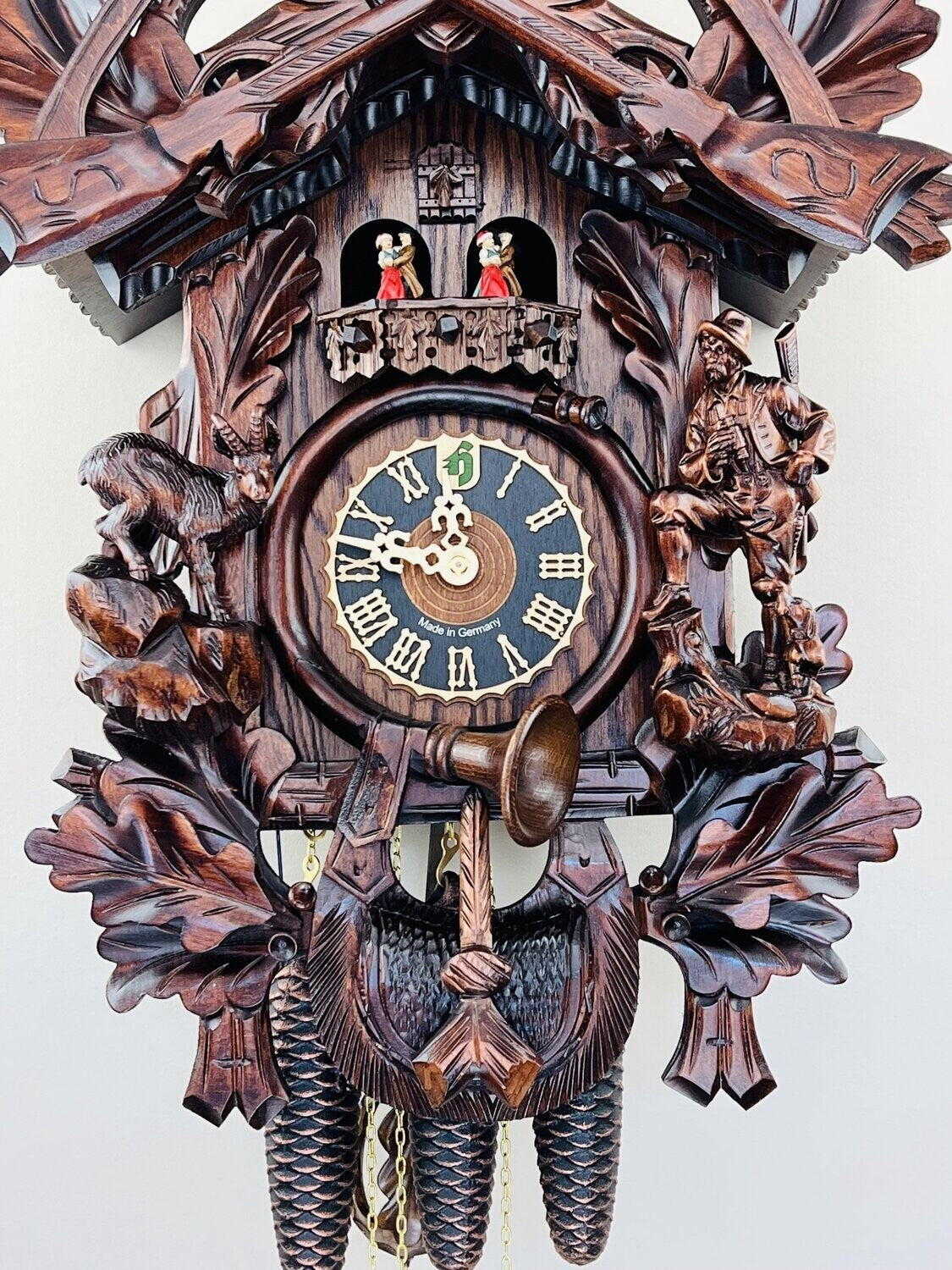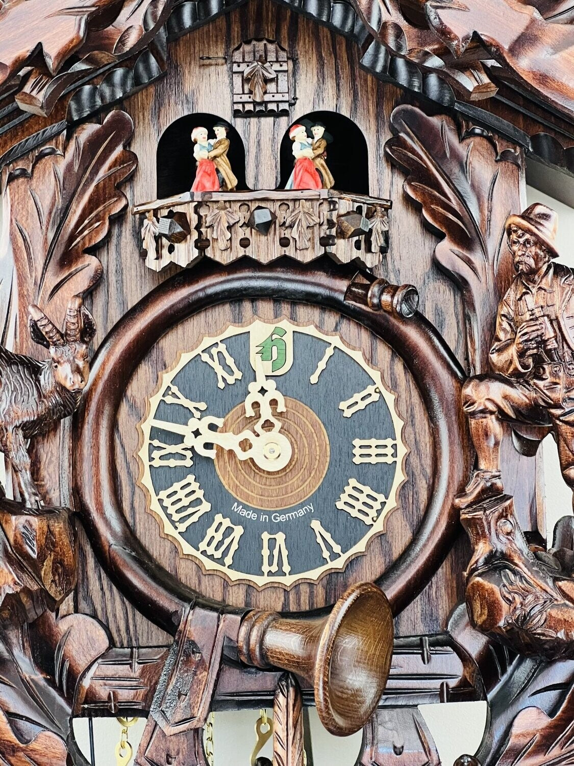 This eight day musical hunter’s cuckoo clock features hand-carved woodsman, stag, and intricate hunting lodge details. Each hour, the cuckoo bird announces the time, and the dancers rotate on the turntable while the mechanical music box plays alternating melodies. The clock operates on a traditional mechanical movement that requires winding once every eight days. It measures 29.5 inches high, 16.5 inches wide, and 13 inches deep. Crafted to provide reliable performance while adding rustic charm, this clock is ideal for living rooms, dens, or lodge-style home decor.