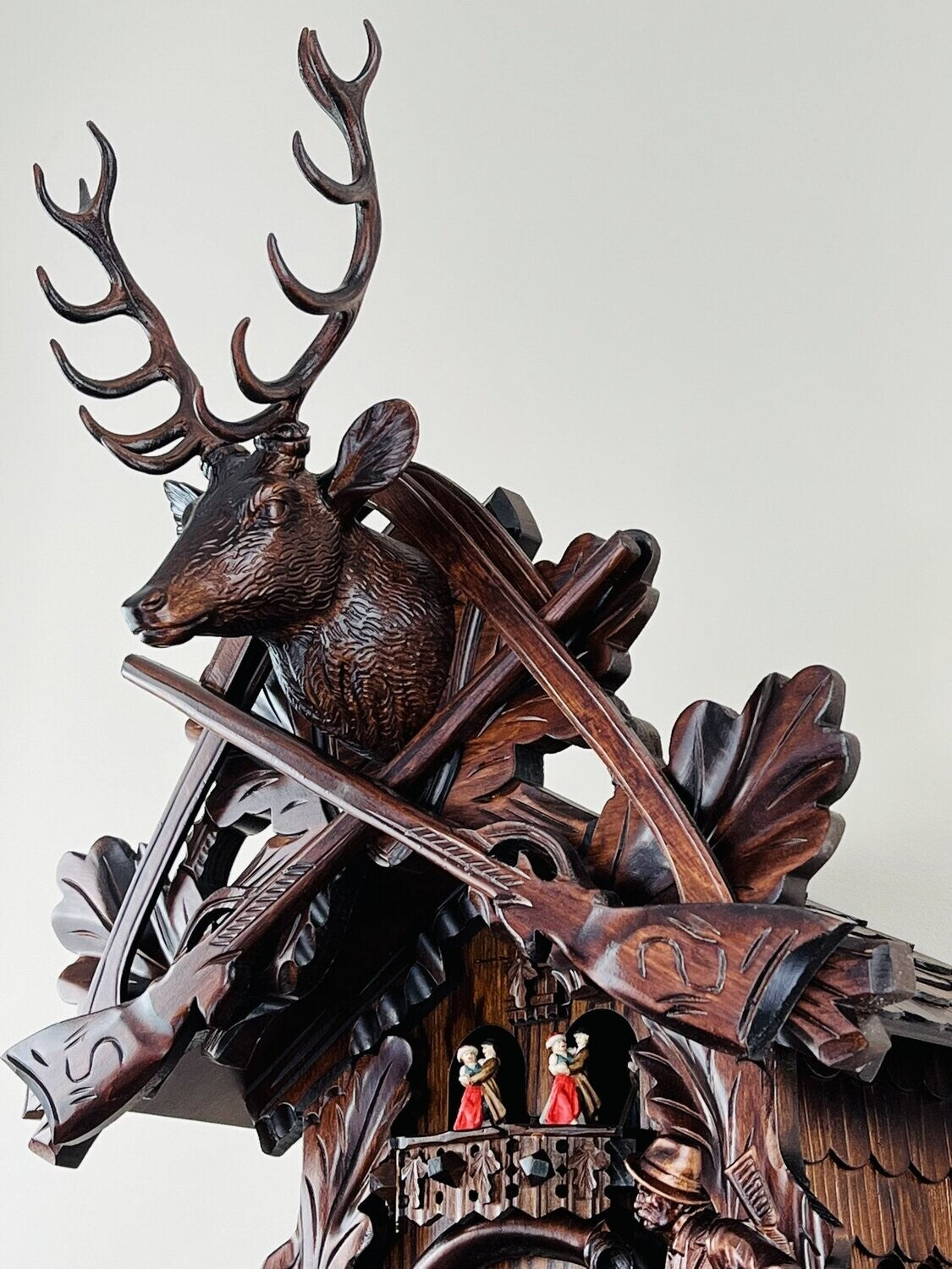 - Hunter's cuckoo clock with hand-carved woodsman and stag